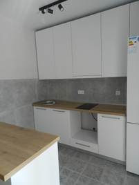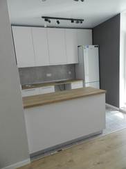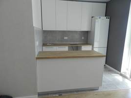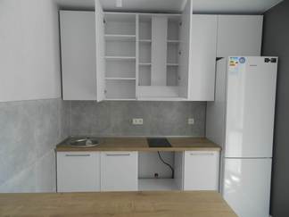 Фасад из экошпона и МДФ белый, без лишних деталей. Шкафы и ящики вместительны, удобные полочки помогут вам разложить всё по местам. Столешницы цвета орех выполнены из сплошного массива, прочны и удобны в уходе. Предусмотрен навесной шкаф для встроенной вытяжки.