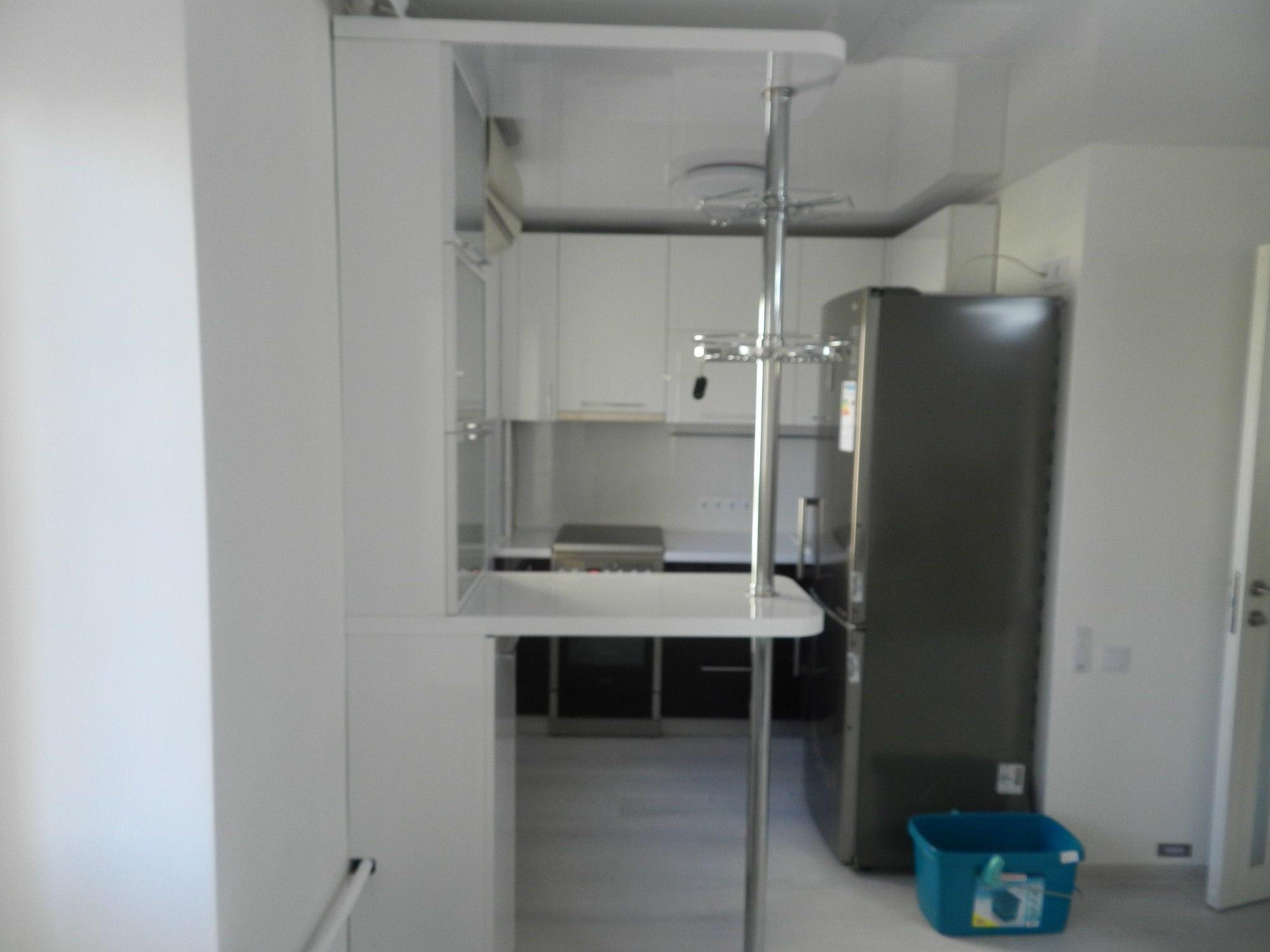 Угловой кухонный гарнитур Бридж с фасадом из акрила, МДФ и стекла выполнен в стиле Модерн, в 2 основных тонах. Его отличает лаконичность, строгость линий и компактность. Благодаря использованию необычной фурнитуры, нескольких видов материалов в обрамлении барной стойки, стеклянных дверок шкафов, отлично подойдет для современных людей. Столешница из МДФ ламинирована влагостойким пластиком белого цвета. Конструкция, с использованием подъемного механизма, современной фурнитурой, объемными и узкими ящиками сделают полезной всю кухонную зону, поэтому этот вариант идеален для маленькой кухни. Неограниченный выбор цветов и материалов фасада позволит воплотить самые смелые мечты.
