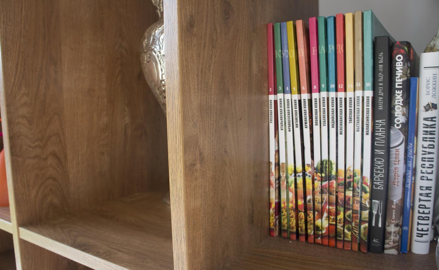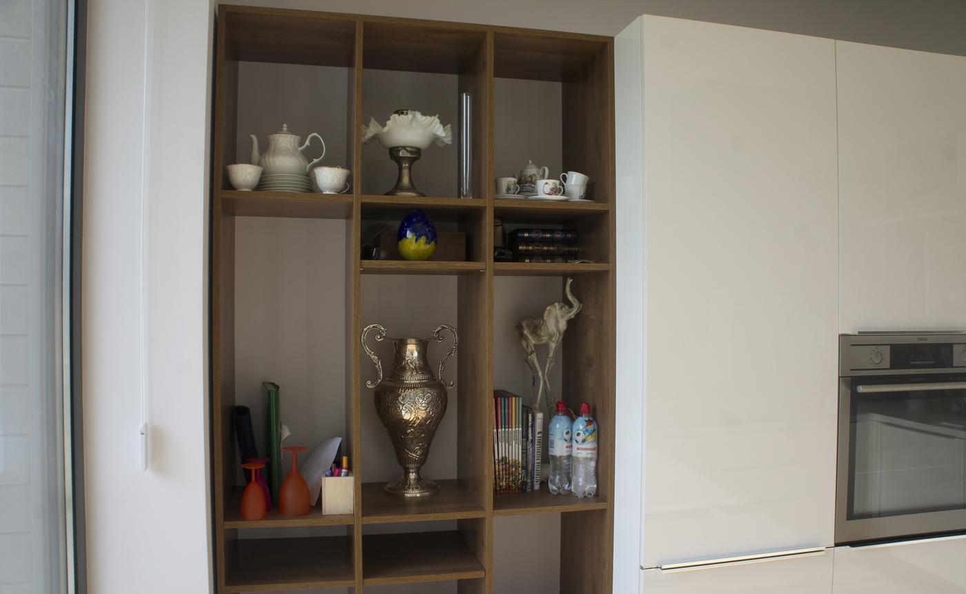 Стоит обратить особое внимание на полки, выполненные в теплых древесных оттенках для придания большей мягкости и уюта. А столешница из акрилового камня лаконично дополняет дизайн и поддерживает скандинавский стиль всего ансамбля.