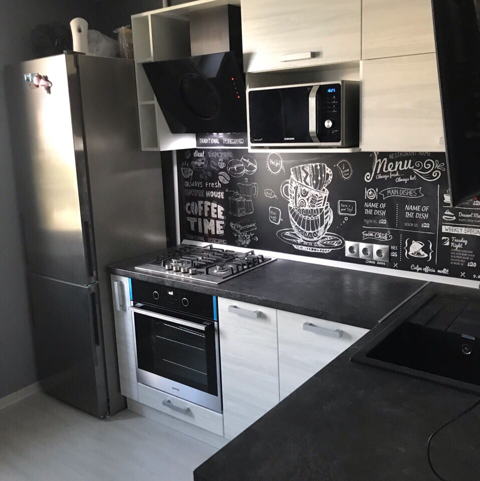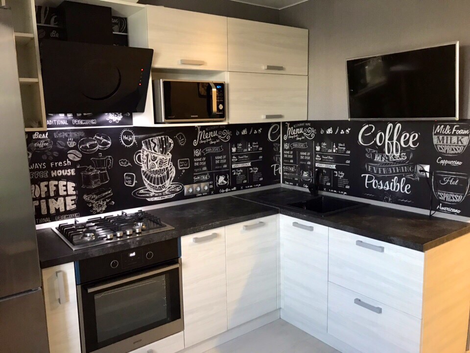 Оформлением служит щит с весёлым узором на тему кофе, что делает интерьер по молодёжному стильным. Вся композиция выполнена в чёрно-белой расцветке и выглядит достаточно интересно. Фасад белый из МДФ и пластика. Столешница черная, термостойкий пластик достаточно прочная и долговечна. Ящики и кафчики небольшие в достаточном количестве.