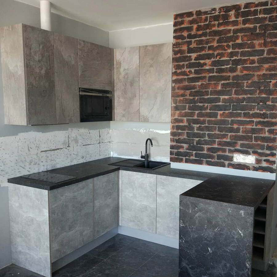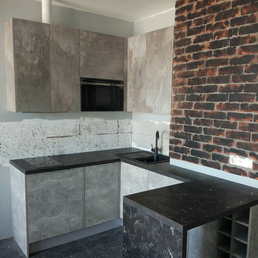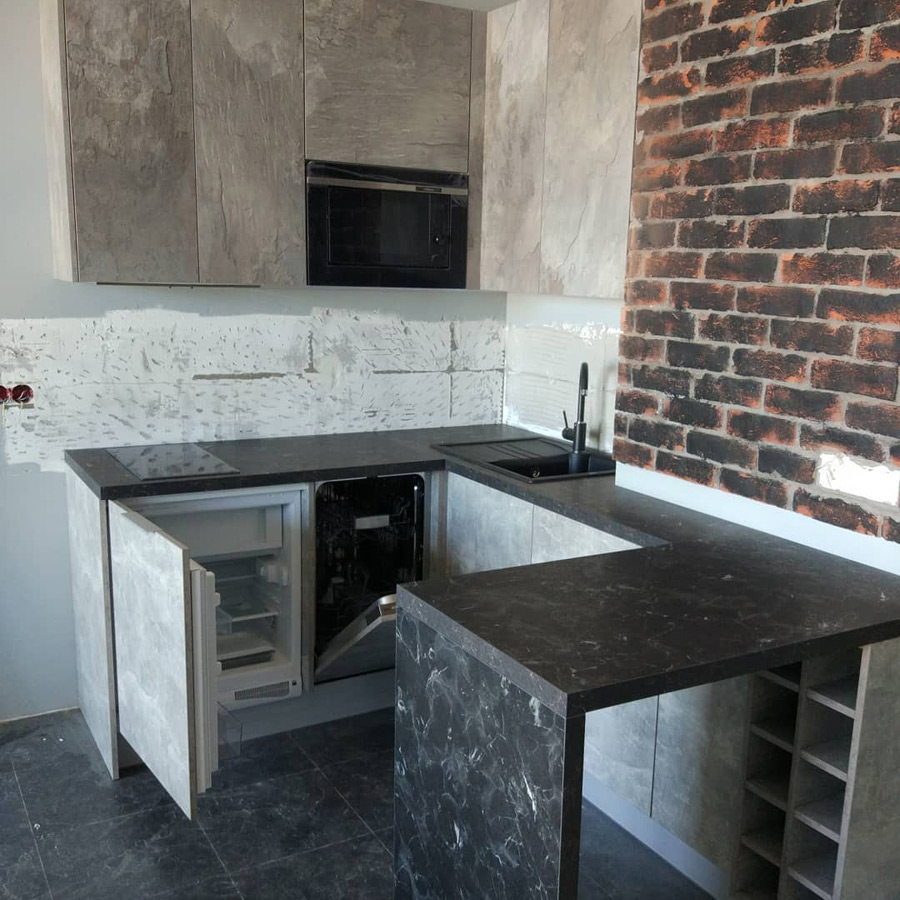 П — образный кухонный гарнитур Витраж выполненный в современном итальянском стиле «Евро» Лофт, понравится любителям минимализма. Его достоинствами являются лаконичность и функциональность дизайна. Он популярен у людей, идущих в ногу со временем. Одинаково хорош как для городских квартир, так и для загородных домов. Множество вместительных ящиков скроют все лишнее от чужих взглядов, зрительно увеличивая рабочее пространство, гармонично впишут технику для кухни, а стол дополняет общий вид. Фасады из пластика бежевого, черного и серого цвета снабжены современными ручками и хорошо гармонируют с черной влагостойкой столешницей из постформинга. Вы можете заказать П – образную кухню Витраж в любом размере, цвете и комплектации.