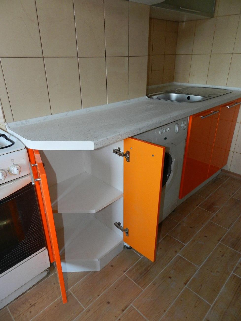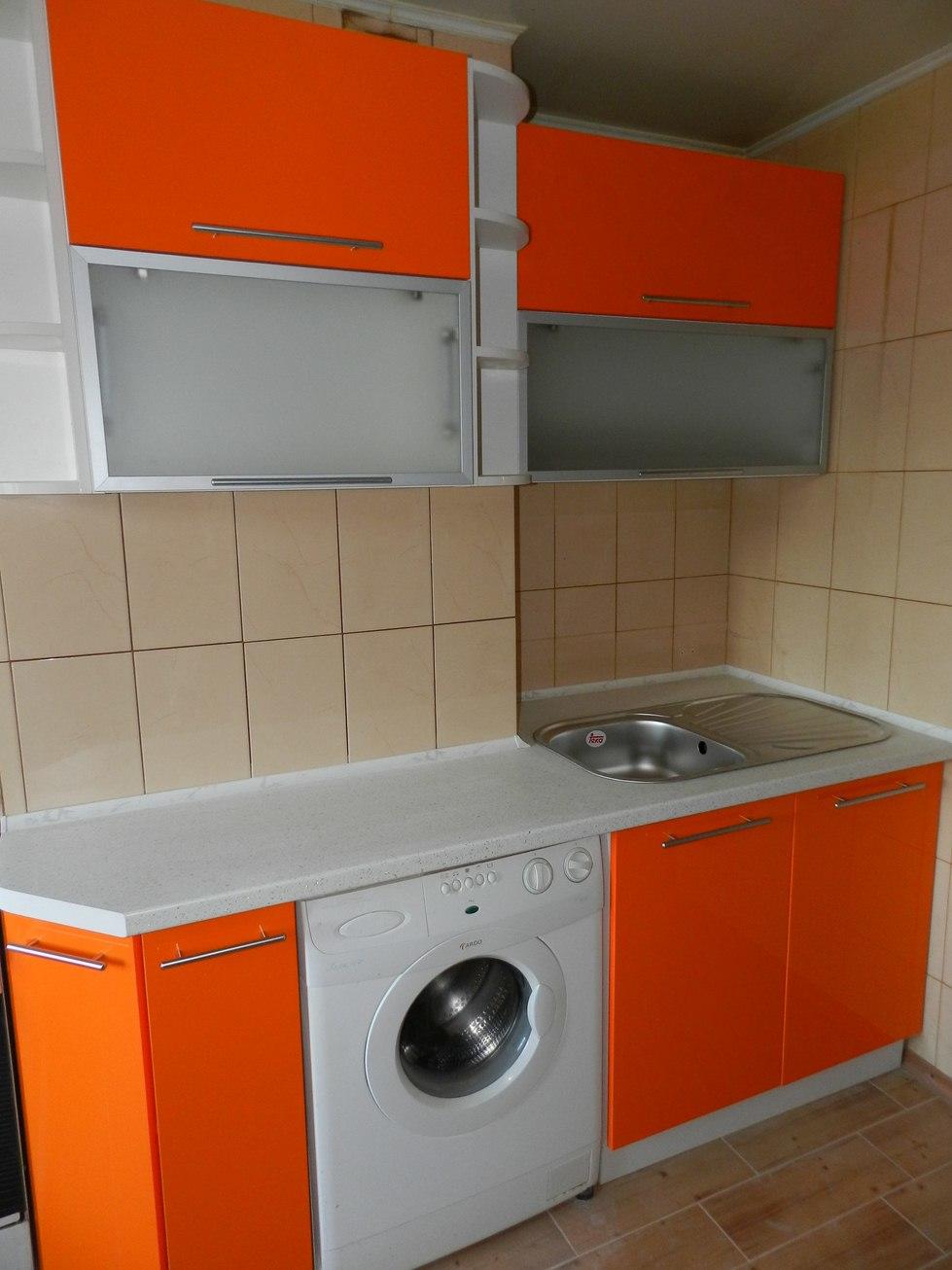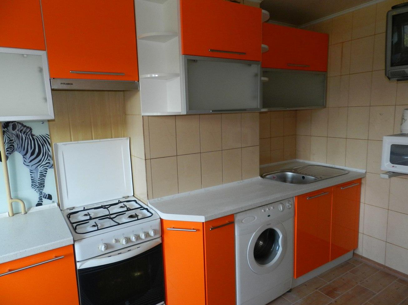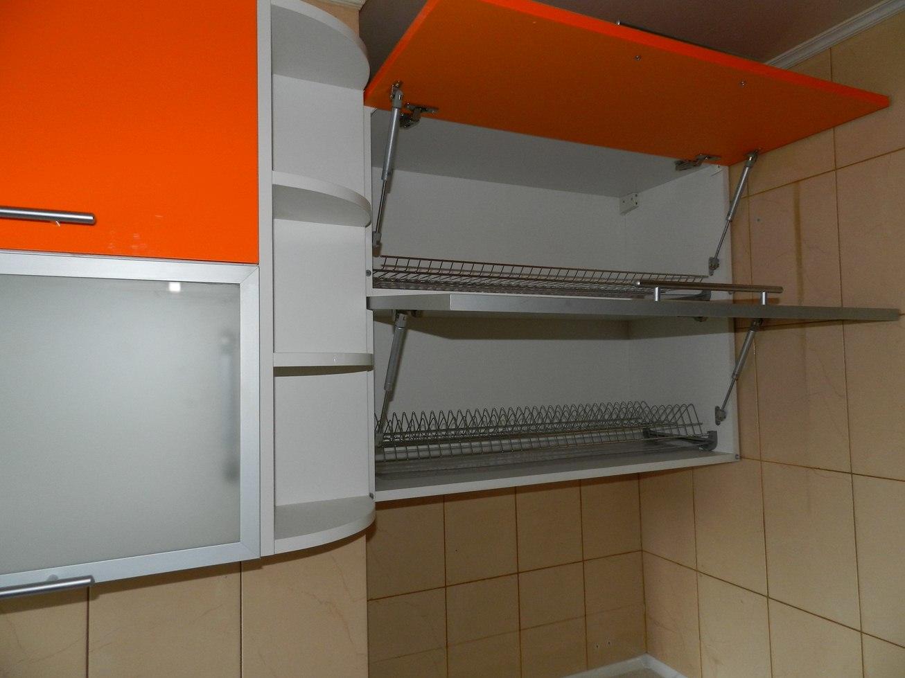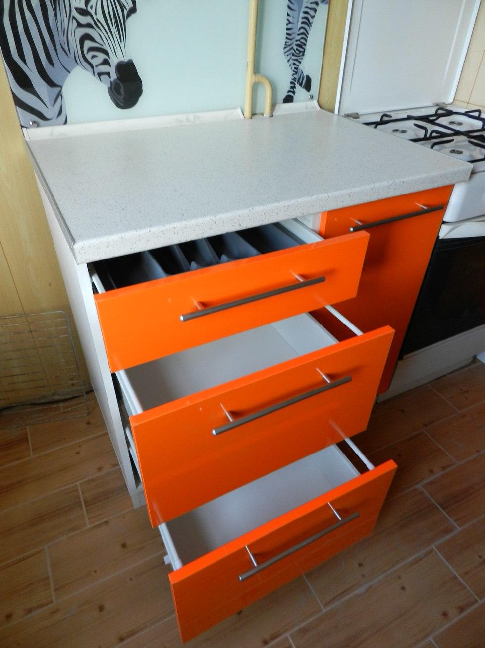 Фасады из ДСП с акриловым покрытием и вставками из стёкла, выполненные в двух цветах — оранжевом и сером — будут служить своей хозяйке на протяжении длительного времени, а за счёт стойкого покрытия уход за ними окажется не таким сложным.