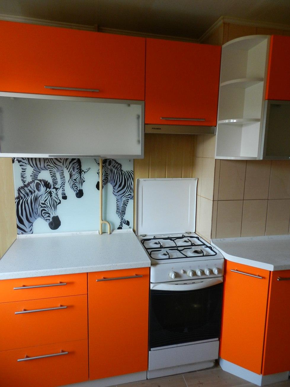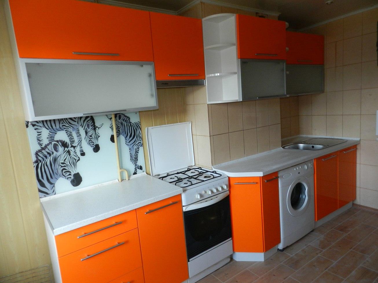 Кухня «Оранжина» станет идеальным решением, которая не только освежит интерьер, но и позволит привлечь к себе внимание не только яркими двухцветными фасадами, но и оригинальной фотопечатью на фартуке.