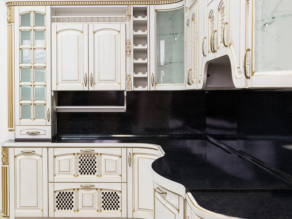 Кухня «Бэлло» — гармоничное сочетание шикарного итальянского средневековья и ультрасовременных геометрических форм. Тандем светлых тонов с золотистыми окантовками и черной глянцевой столешницы придают общему виду кухонного помещения шика, респектабельности. Баланс старины и современности дают возможность сделать кухню более функциональной без потери домашнего уюта. Большое количество ящиков обеспечивает максимальную эргономику. «Бэлло» — отличный вариант для загородных домов, выполненных в слегка пафосном средневековом стиле с элементами хаотичной геометрии. Также мебель хорошо будет смотреться в просторной городской квартире.
