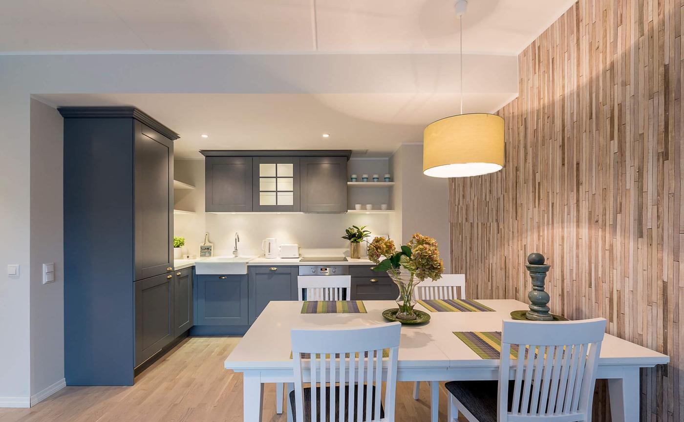 Кухня Бакарди из ДСП – представитель смешения неоклассического и английского стилей. Она подходит для ценителей богатого убранства, симметрий и комфорта. Естественные оттенки, современные материалы и природные мотивы сглаживают строгость форм и подчеркивают сдержанную элегантность. Гладкие столешницы из акрилового камня обеспечивают влагостойкость и гигиеничность. Изысканная фурнитура, сочетание открытых и закрытых полок увеличивают функциональность. Встроенные светильники и минимум стеклянных поверхностей повышают эргономичность.