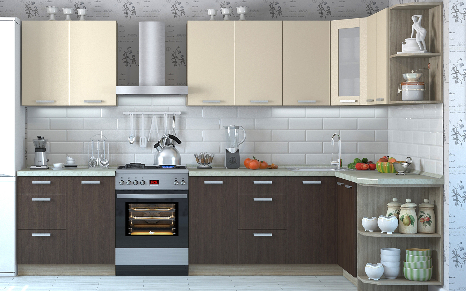 Угловая классическая кухня «Роуз» — абсолютная классика кухонной мебели, она всегда будет модной и актуальной. Мебель с чёткими геометрическими формами и аккуратным дизайном обеспечит ощущение полного комфорта. Модель практичная и очень функциональная, внутреннее наполнение продумано до мелочей, модули глубокие и вместительные, присутствуют открытые полки для красивой посуды и разных приятных мелочей.