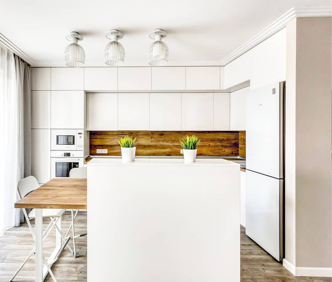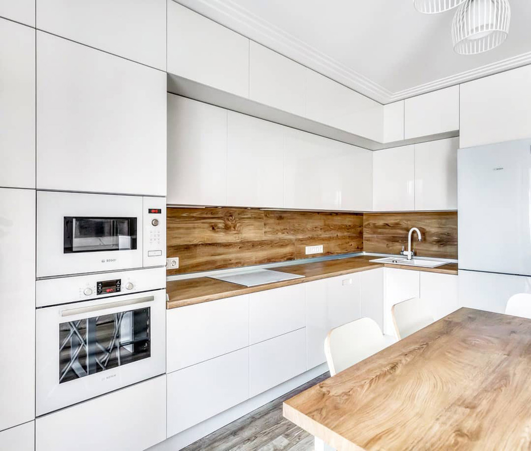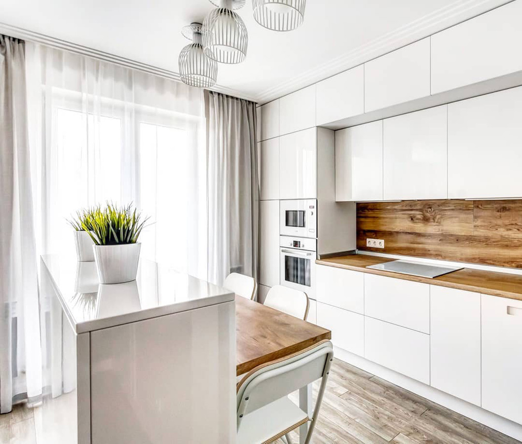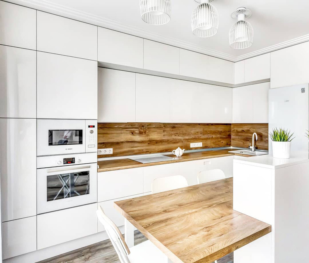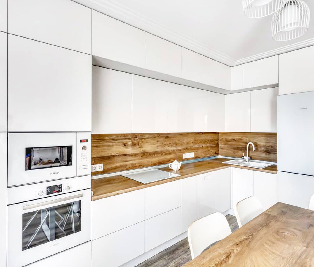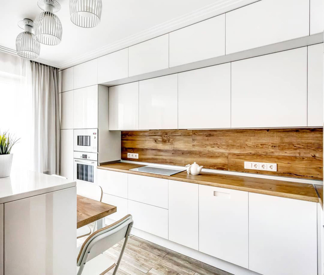 Кухня Вера – грамотное решение для скандинавского или минималистичного интерьера. Лаконичный дизайн и отсутствие избыточного декора делают помещение визуально легче и просторнее. Однотонные белоснежные фасады из качественного шпона идеально гармонируют со столешницей и фартуком под орех. Такая кухня всегда будет наполнена светом. Эргономика гарнитура позволяет практично использовать каждый сантиметр пространства: для каждой кухонной принадлежности найдется подходящее место. Мебель изготавливается под конкретный заказ: расцветки, размеры и материалы могут изменяться в соответствии с пожеланием клиента.