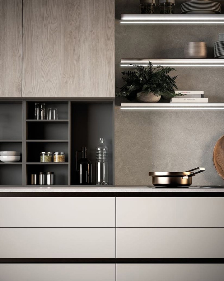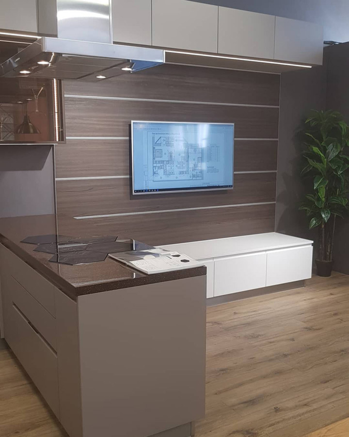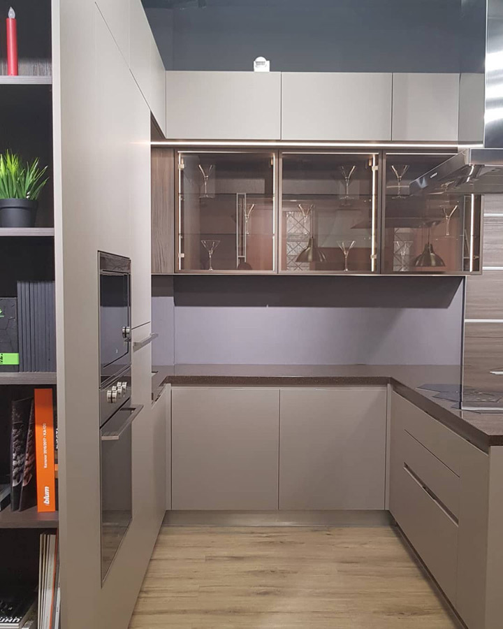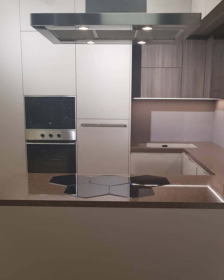 Кухня «Корса» — это сочетание итальянского стиля с современным дизайнерским подходом к обустройству кухонного пространства. Отсутствие ручек на шкафных дверцах в сочетании со строгими разделительными линиями и нижним фасадом цвета «кофе с молоком» придают кухне футуристический вид. Верхние шкафчики, окрашенные в ореховый цвет, создают атмосферу домашнего очага, делая ее уютней. Качественная сборка, столешница, изготовленная из кварца, корпус из ЛДСП материала гарантируют прочность и долгий срок службы.