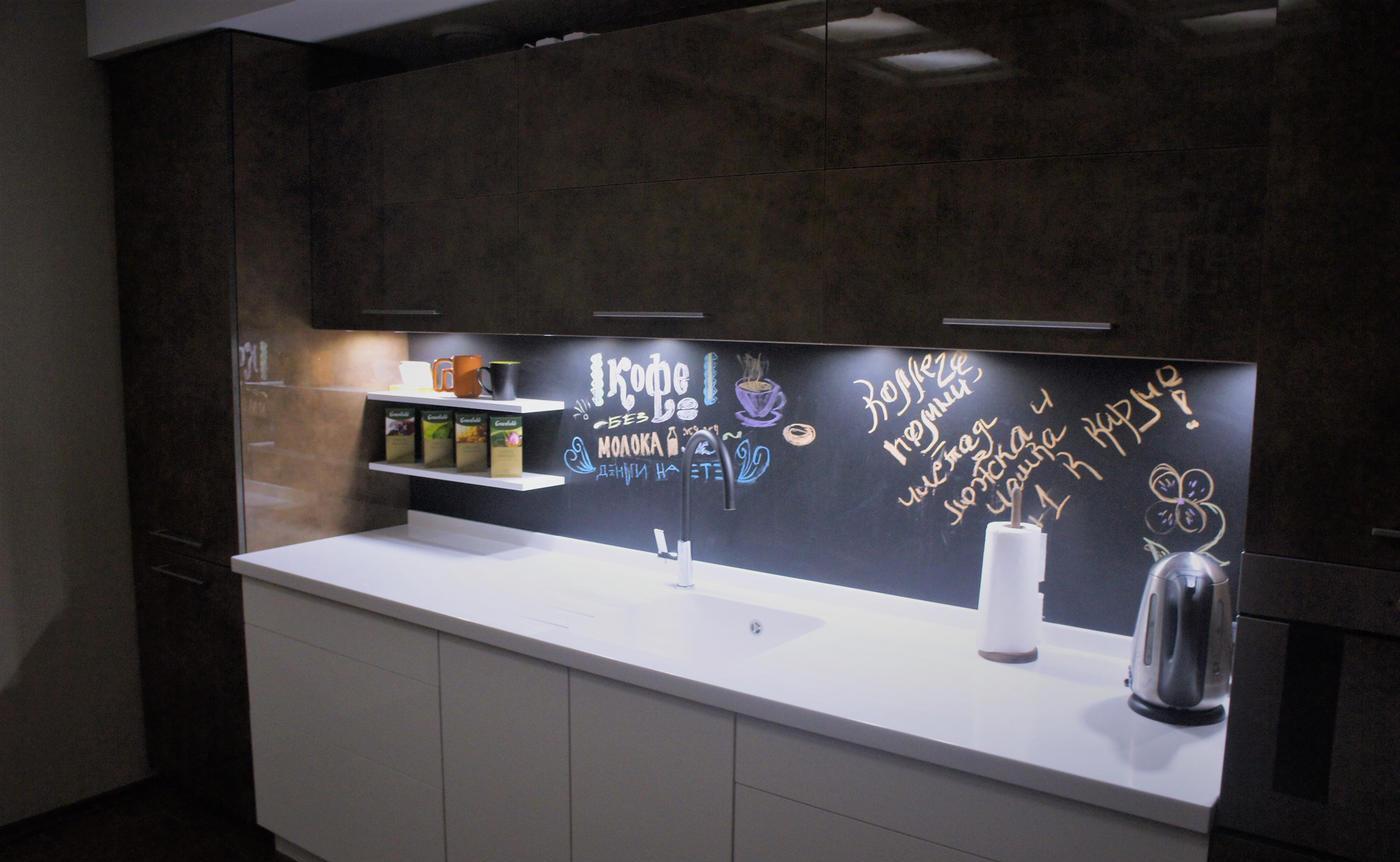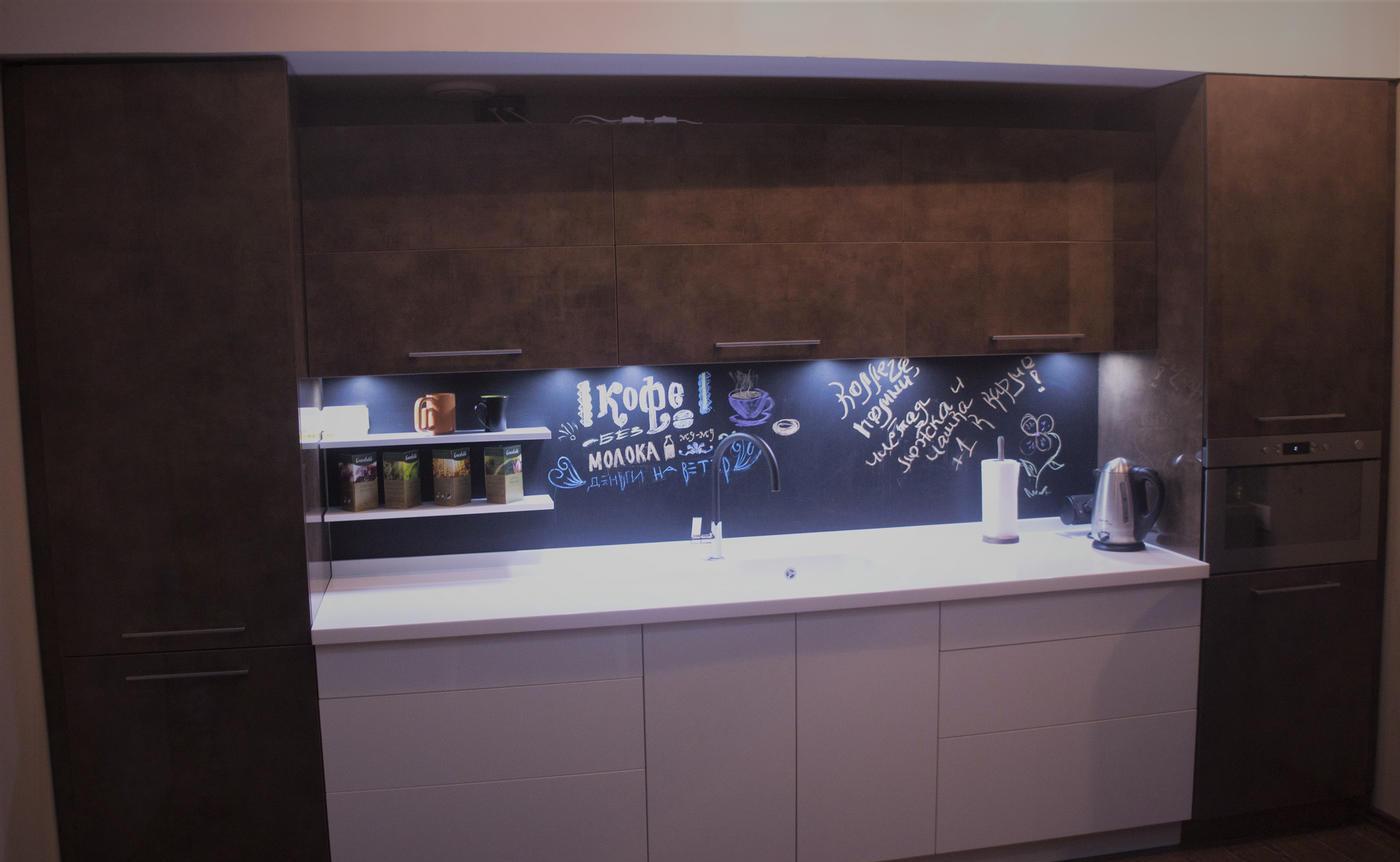 Кухонный гарнитур «Кадриль» в современном стиле лофт подойдёт любителям оригинальных решений. Тёмные тона фасада разбавляет точечное освещение рабочей зоны. Столешница из белого акрилового камня сочетается с нижними шкафами из МДФ с гладким покрытием. Фартук выполнен в матовом чёрном цвете и позволяет рисовать мелом, добавляя дерзкие акценты.