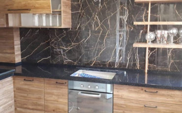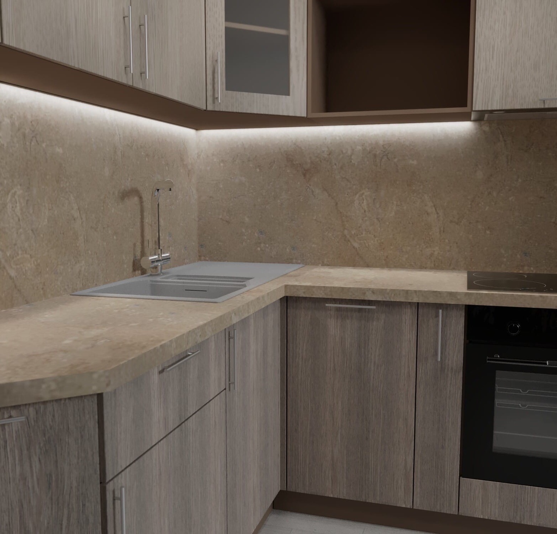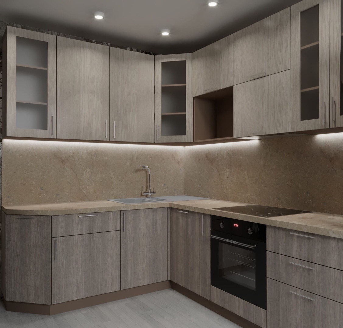 Натуральные песочные оттенки и понятная геометрия расширяют пространство. Вместительные полки увеличивают эргономичность. Правильная фурнитура обеспечивает беспрепятственное открывание и закрывание тумб и ниш. Каменные столешницы, фасад из древесины и стекла формируют высокие гигиенические свойства. При желании заказчик может изменить материалы, размер и цвета кухни.