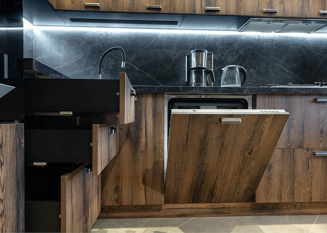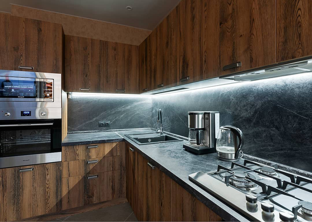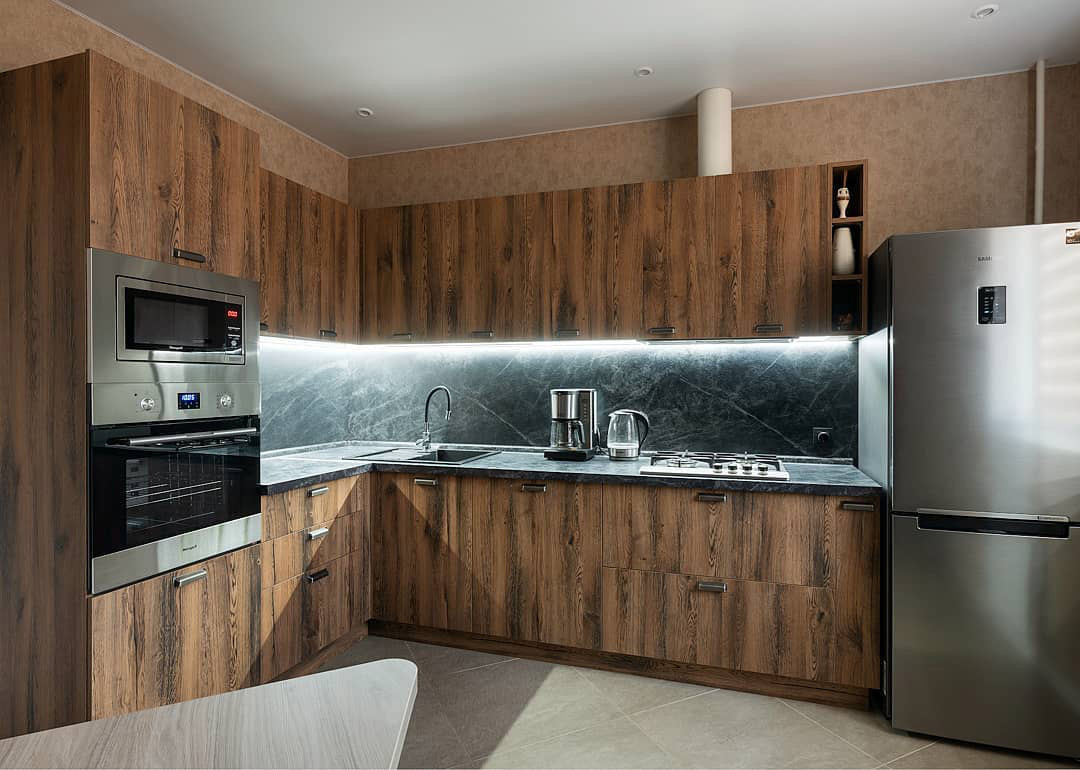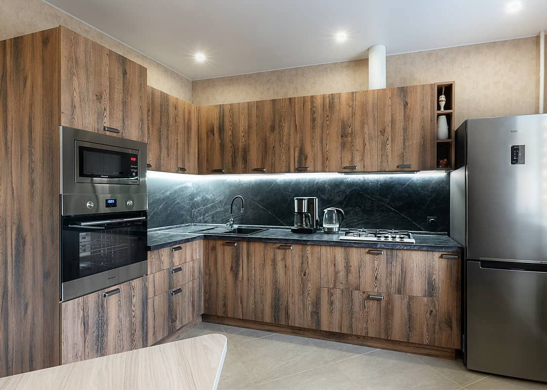 Такая кухня отлично впишется в интерьер дачи или загородного дома. Апартаменты и квартиры в стиле лофт тоже могут стать хорошим вариантом для размещения такой мебели. Надежная фурнитура и качественные доводчики сделают удобным процесс пользования шкафами и ящиками и прослужат долгие годы.