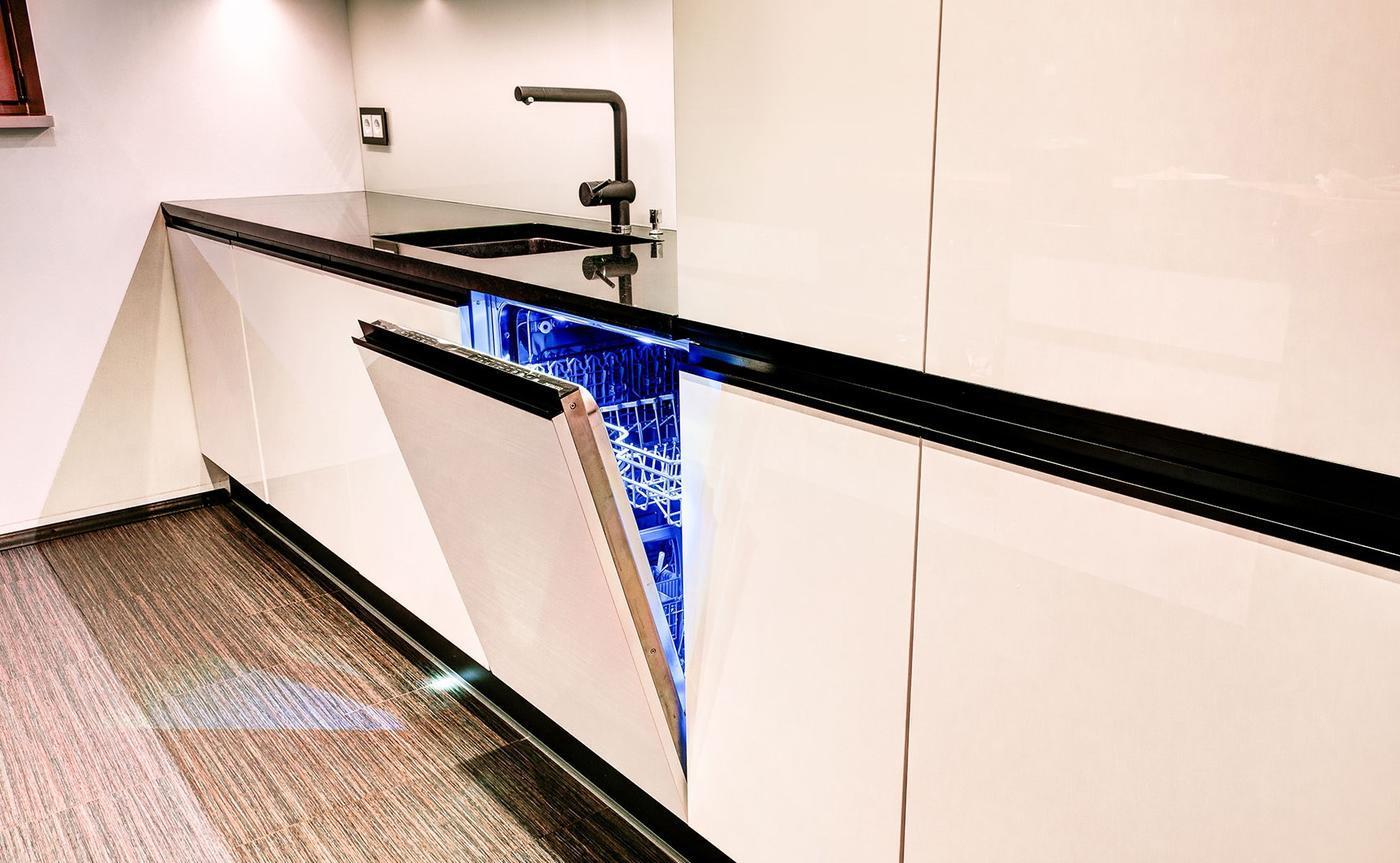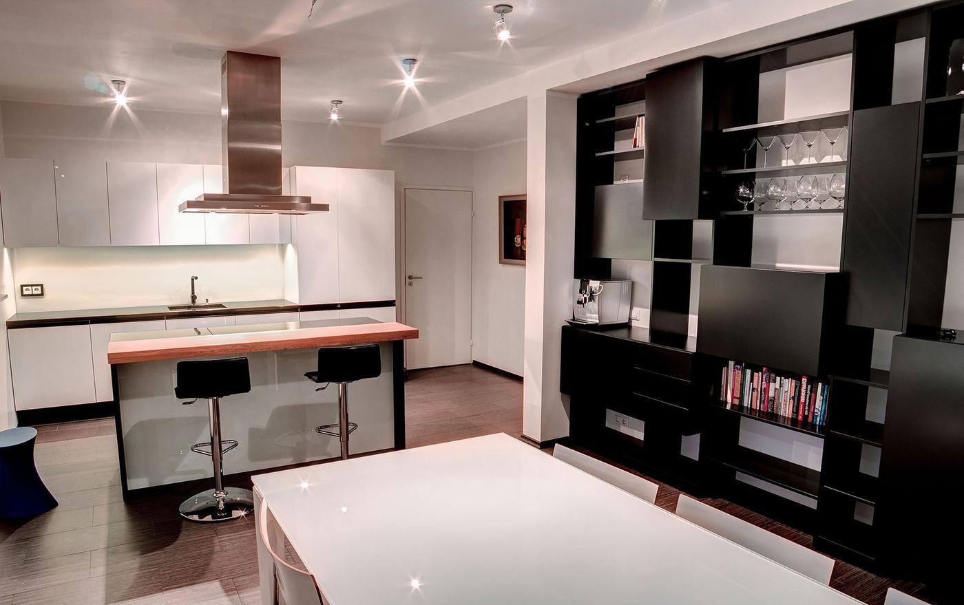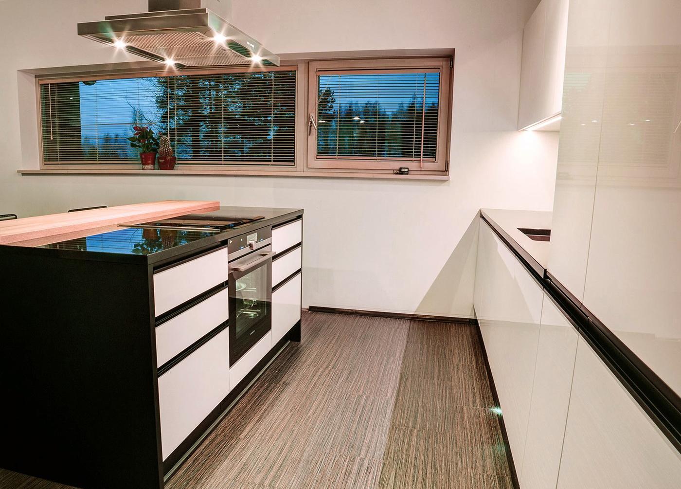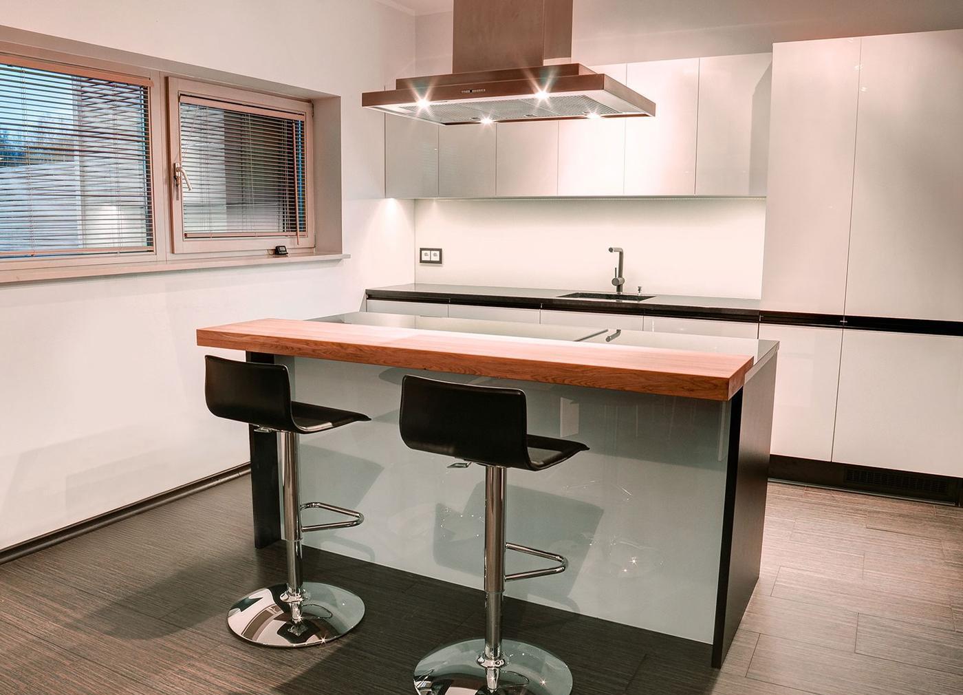 Прямой гарнитур Калдера для просторной кухни-столовой может состоять из нескольких частей – собственно кухонной мебели с рабочей зоной и навесными шкафами и комплекта с открытыми полочками и закрытыми отделениями. Посреди комнаты устанавливается остров с варочной панелью, духовкой, подвесной вытяжкой и барной стойкой. В качестве материала для фасадов используется белый пластик и темный МДФ, гармонирующие со столешницей, выполненной из массива дерева. Возможна установка встраиваемой техники – посудомоечной машинки и холодильника. Кухня Калдера изготавливается по индивидуальным проектам в соответствии с габаритами помещения заказчика.