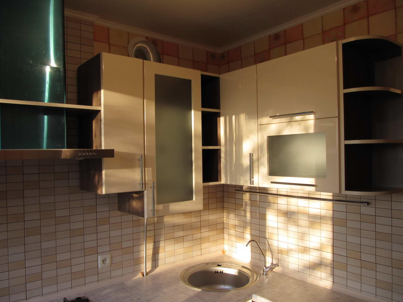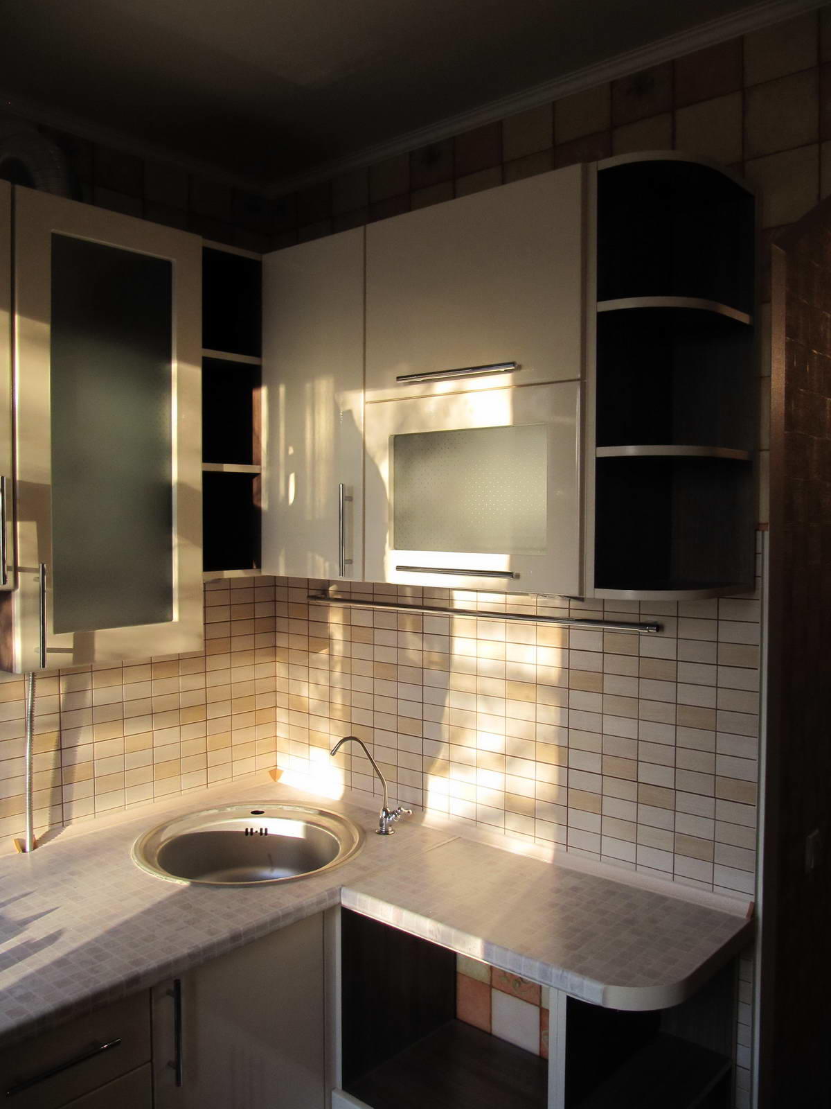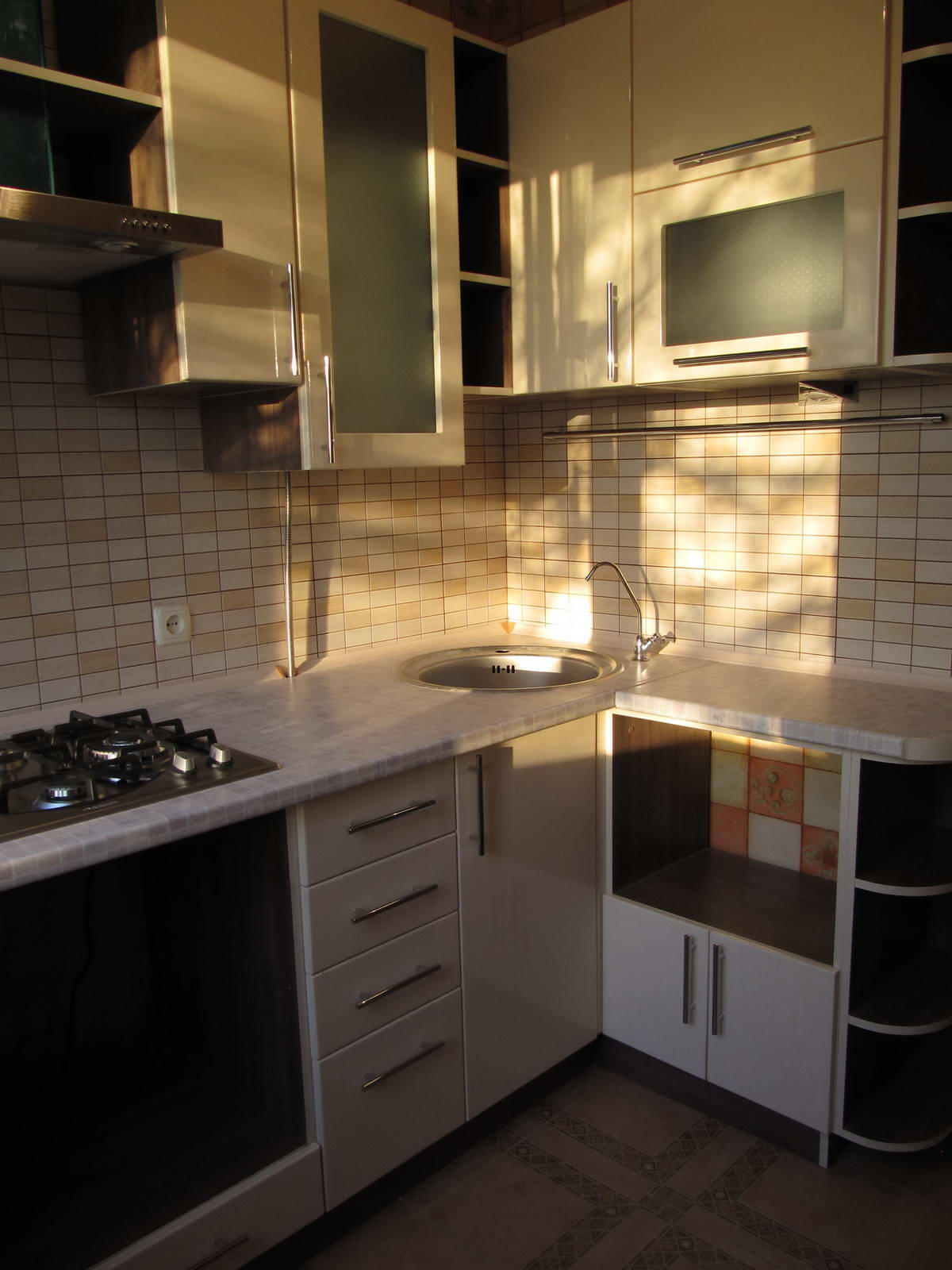 Угловой кухонный гарнитур, выполненный в светлых тонах, удачно впишется в интерьер небольшого помещения. Эргономичная планировка с компактной мойкой в угловой части гарнитура позволяет оптимально использовать пространство и экономит место.