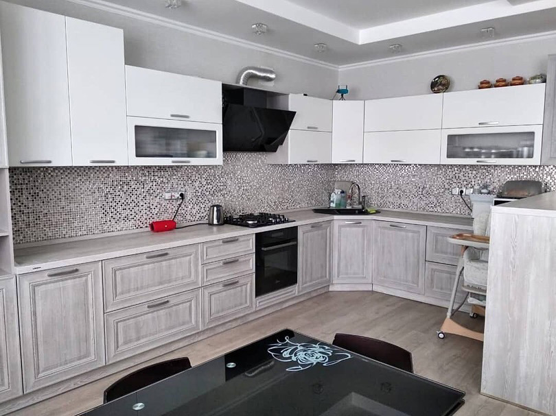 Белый цвет фасадов из массива считается самым беспроигрышным, с ним кухня будет казаться более просторной. Если будут нужны темные оттенки, мы учтем ваши предпочтения при заказе.