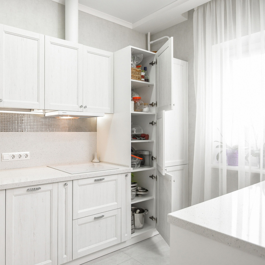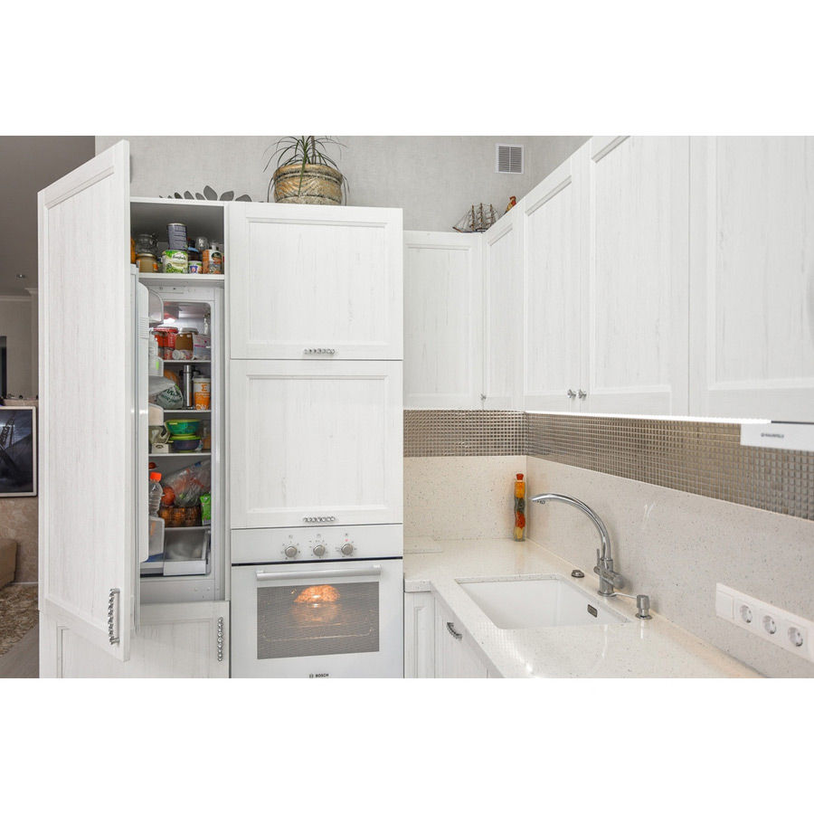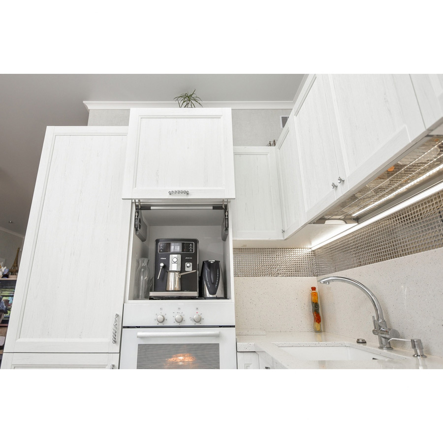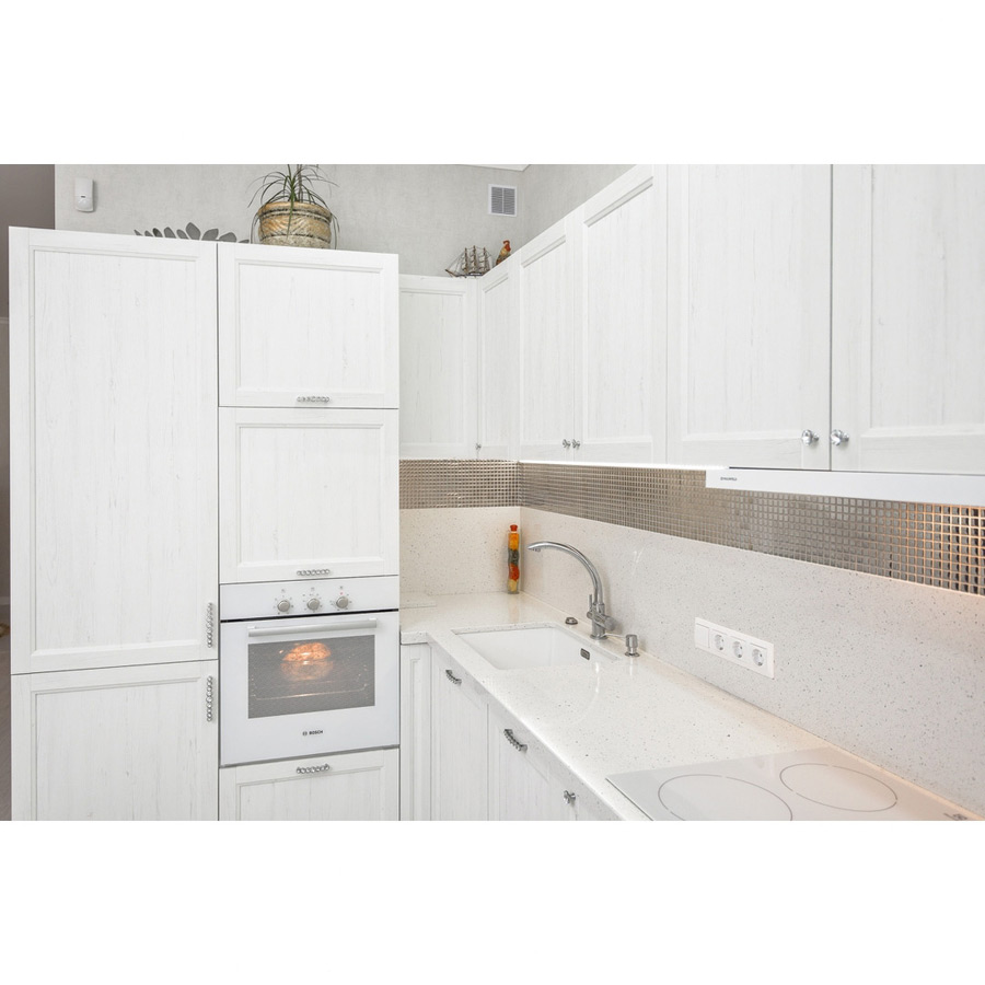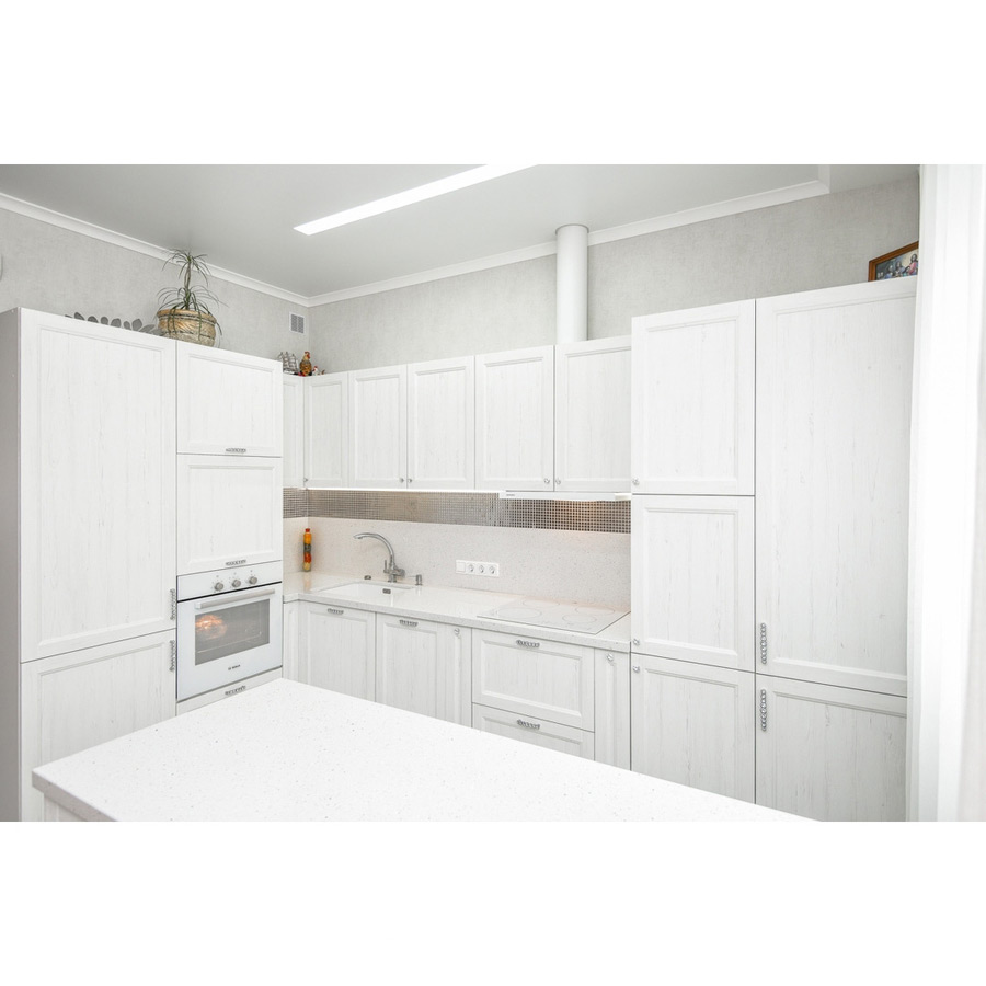 Кухня Адзельо из ЛДСП выполнена в стиле модерн. Подходит для квартиры или загородного дома. Благородный белый цвет визуально расширяет пространство, наполняет светом и чистотой. Рамочный фасад из шпона с текстурой натуральной древесины создает ощущение близости к природе. Гладкие столешницы из кварца обеспечивают гигиеничность, а их высокая твердость предотвращает появление сколов и царапин.