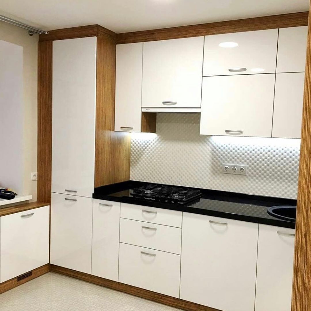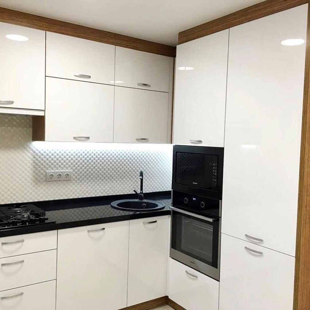 Кухня «Мирсина» выполнена в П-образной форме, что позволит максимально заполнить пространство. Именно благодаря своей форме. гарнитур является самостоятельным интерьером кухонного пространства. Прекрасное решения для современных хозяек. Выполненная в стиле модерн с искусно подобранной цветовой гаммой, кухня манит своей привлекательностью. А черная кварцевая столешница, это не только красивый декор, но и качественная составляющая необходимая для длительного использования.