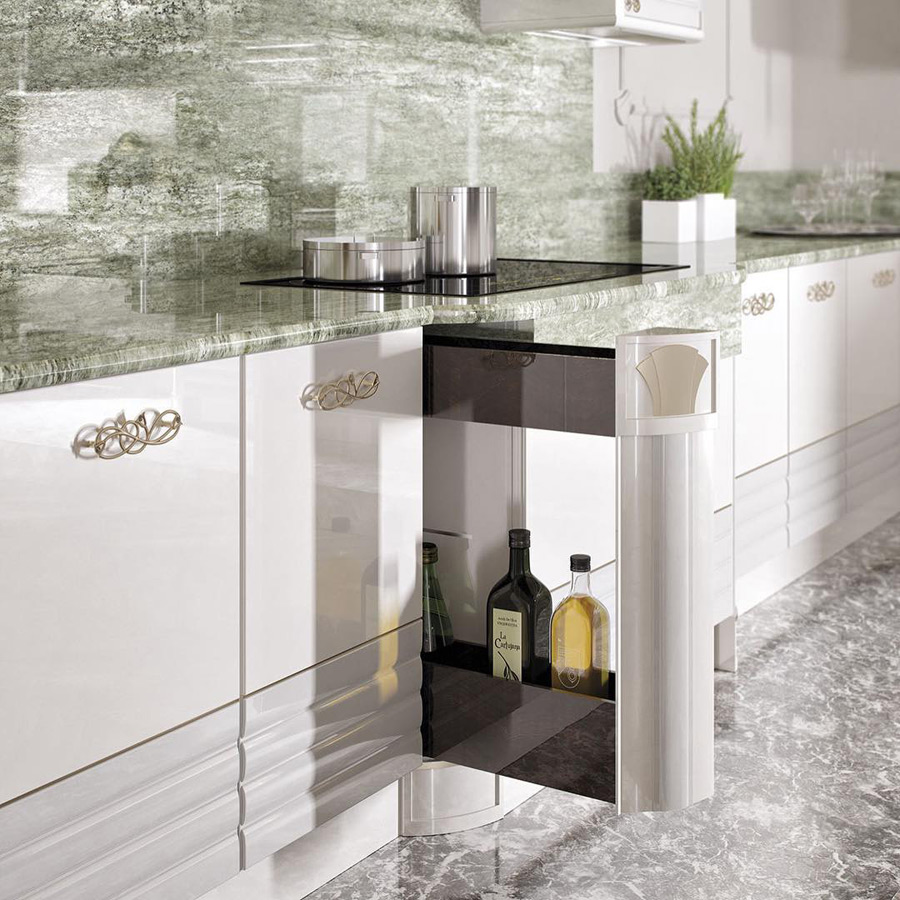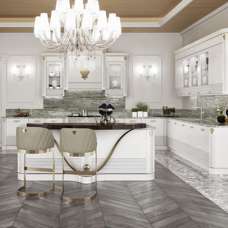 Кухонный гарнитур «Ордовия» выполнен в роскошном неоклассическом стиле и гармонично соединяет в себе классические традиции и современные материалы. Модель требует много пространства и подойдёт не для каждого помещения — это касается не только площади, но и высоты. Гарнитур с изысканной фрезировкой, ручками под классику и вместительными шкафами строгой прямоугольной формы до потолка с современной встраиваемой техникой выглядит аристократично, и в то же время модно и лаконично. Мебель благородной цветовой гаммы с тёплыми шпонированными фасадами в сочетании с утончённым декором в небольшом количестве и чётким распределением зон привнесёт в помещение ощущение комфорта и простора.