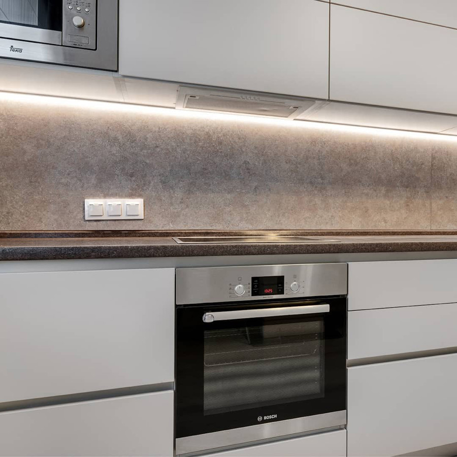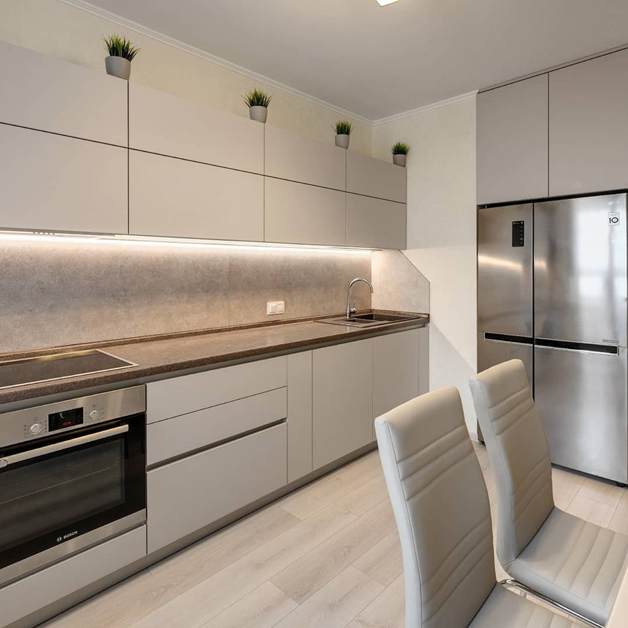 Данная модель кухни выполнена в ярком современном стиле. Фасады нижних шкафов и ящиков имеют текстуру акрила, а столещица из гранита. Глянец кухни Вильна неприхотлив в уходе, практичен, без труда очищается от загрязнений. Есть выбор цветовых гамм (от светло-бежевого до шоколадного). Полное отсутсвие ручек у шкафов оценят ценители современности,которым надоели традиционные решения. Форму вашей кухни вы сможете выбрать себе сами, ее можно разместить в прямой, П-образной, лево — угловой и право — угловой формах. Такая кухня отлично впишется в вашу квартиру и станет настоящим ее украшением.