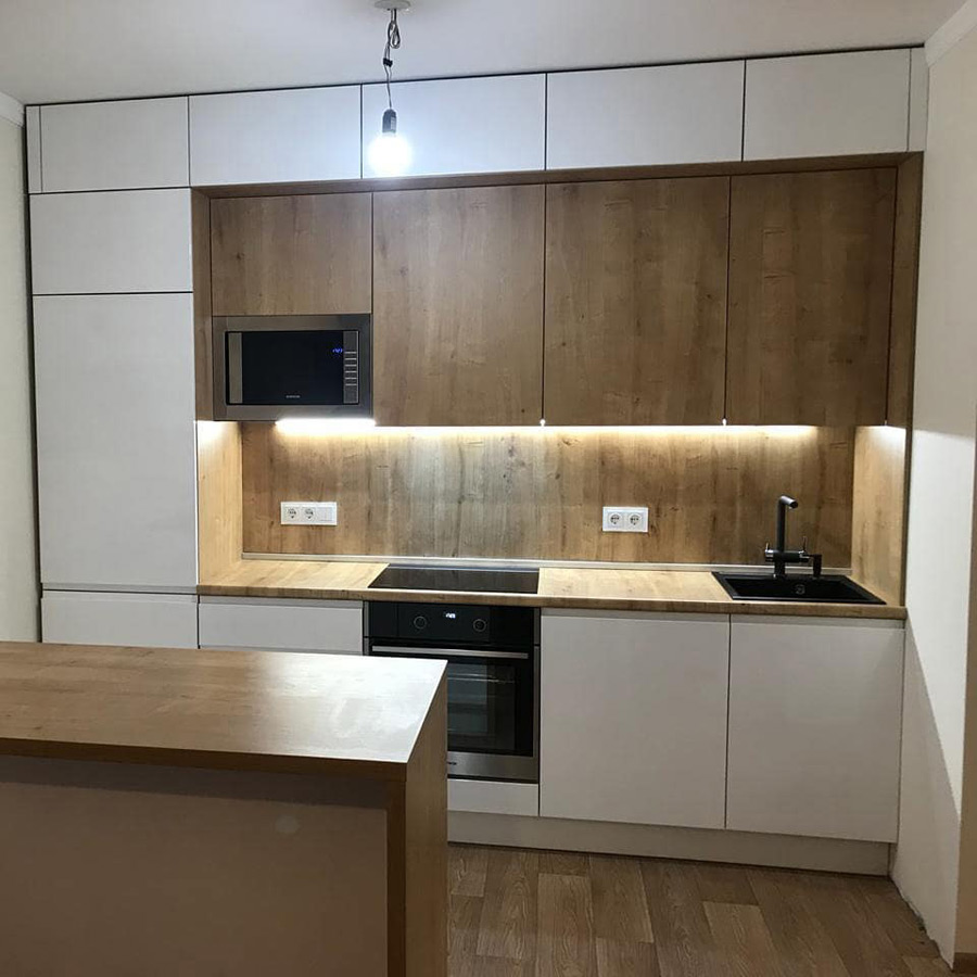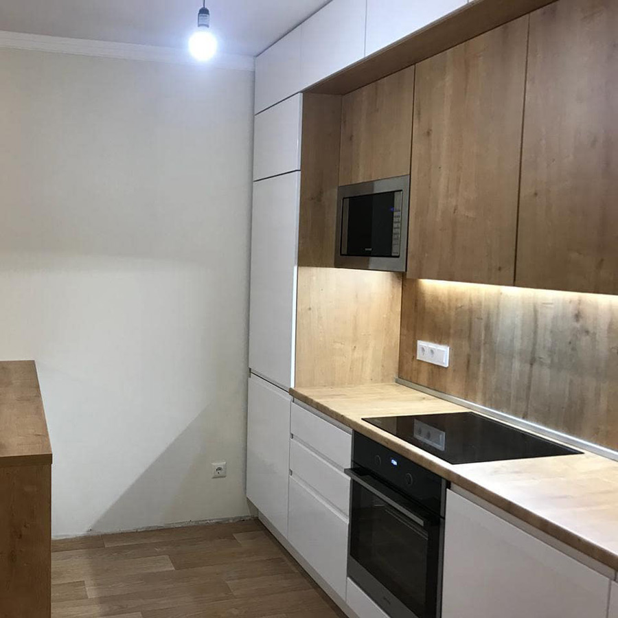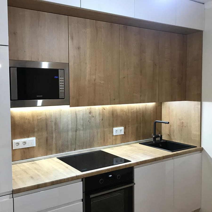 Кухонный гарнитур Клеома спроектирован в Скандинавском стиле. Подойдет для помещений с любой планировкой. Комплект включает: направляющие, бронзовые ручки, петли, сушилку для посуды. Дополнительно можно установить лоток для столовых приборов, тандембоксы, столешницу из камня, бутылочницу. Фасад состоит из шпона; пластиковое покрытие; цвет — белый и ореховый. Влагостойкая столешница ЛДСП ламинированная матовым пластиком с завалом по лицевой стороне. У покупателей есть возможность сделать заказ любого цвета, величины и конфигурации.