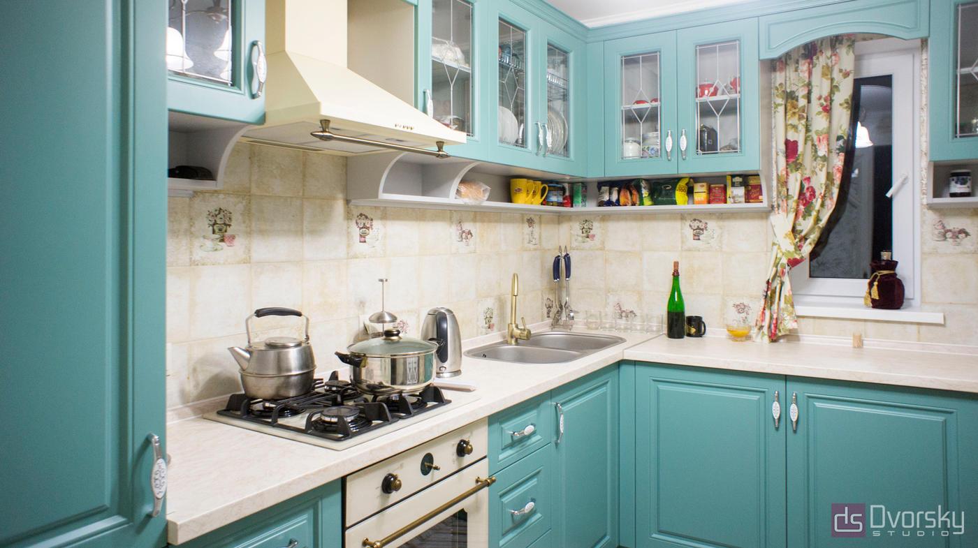 Кухонный гарнитур Молли спроектирован в стиле Прованс с приятным декором — багетом и дверцами шкафчиков со стеклянными узорчатыми вставками. Универсальный дизайн позволяет установить кухню как в загородном доме, так и в просторной квартире с большим кухонным помещением. Форма кухни П-образная, имеется шкаф-пенал для встраиваемого холодильника и удобные шкафчики для бытовой техники. Фасады МДФ цвета мяты, материал корпусов ДСП. Ручки Прованс с керамической вставкой. Столешница цвета слоновой кости. Вы можете заказать кухню Молли любых габаритов, цветовых схем и комплектации.