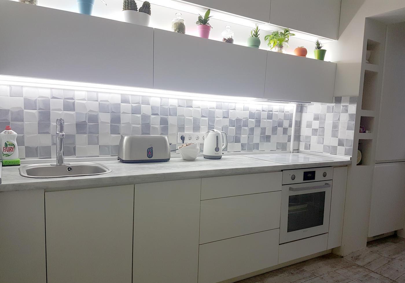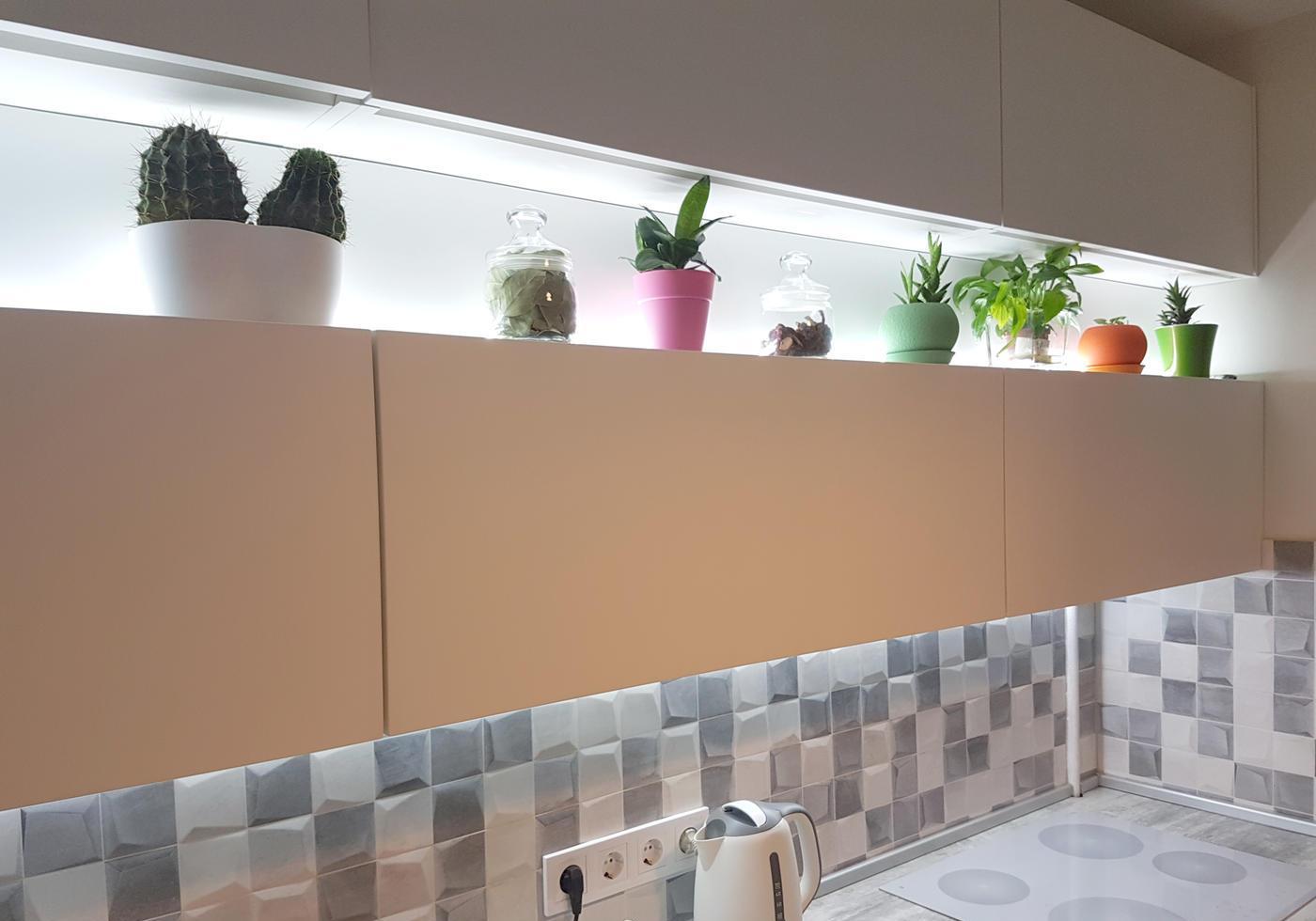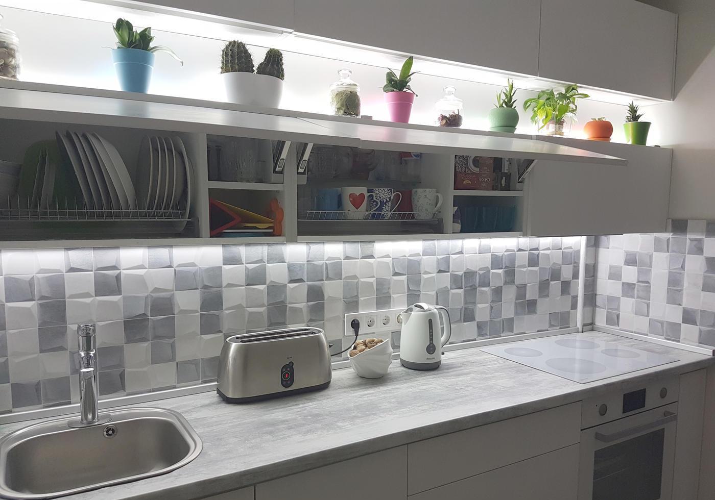 Современная кухня «Небо» идеально подойдёт для маленькой кухни или квартиры-студии. Этот гарнитур сочетает в себе несколько светлых оттенков, а такие цвета визуально увеличивают пространство. Мебель оформлена очень лаконично, без лишних узоров и деталей. Интерьер такой кухни идеально дополняют яркие сувениры, комнатные растения и изделия ручной работы. Кроме того, ящики для посуды спроектированы так, что тарелки и чашки на виду. Это не только обеспечивает удобный доступ к ним, но и позволяет красивой посуде стать украшением интерьера. Гарнитур «Небо» сделает вашу кухню самым приятным местом в доме!