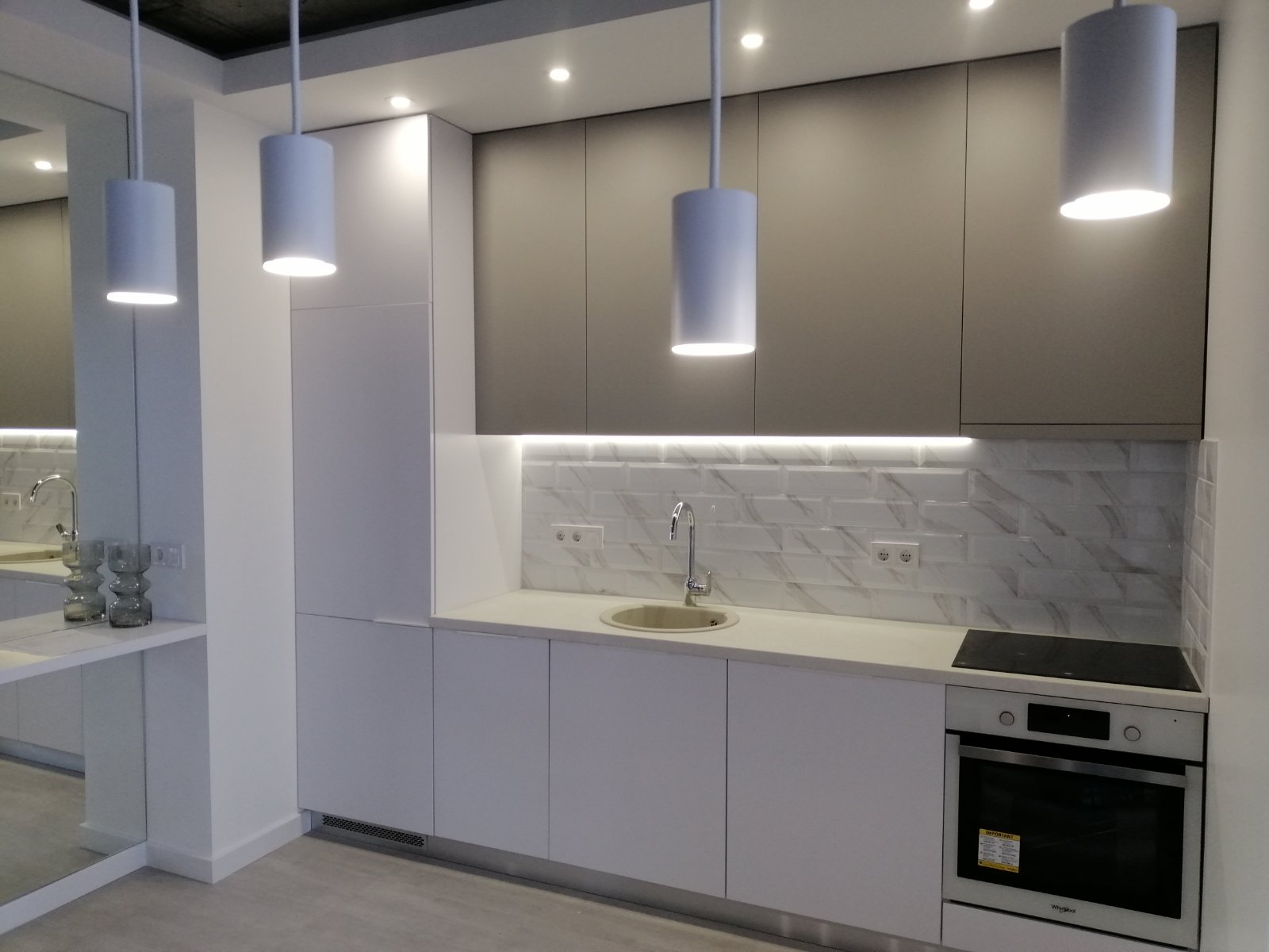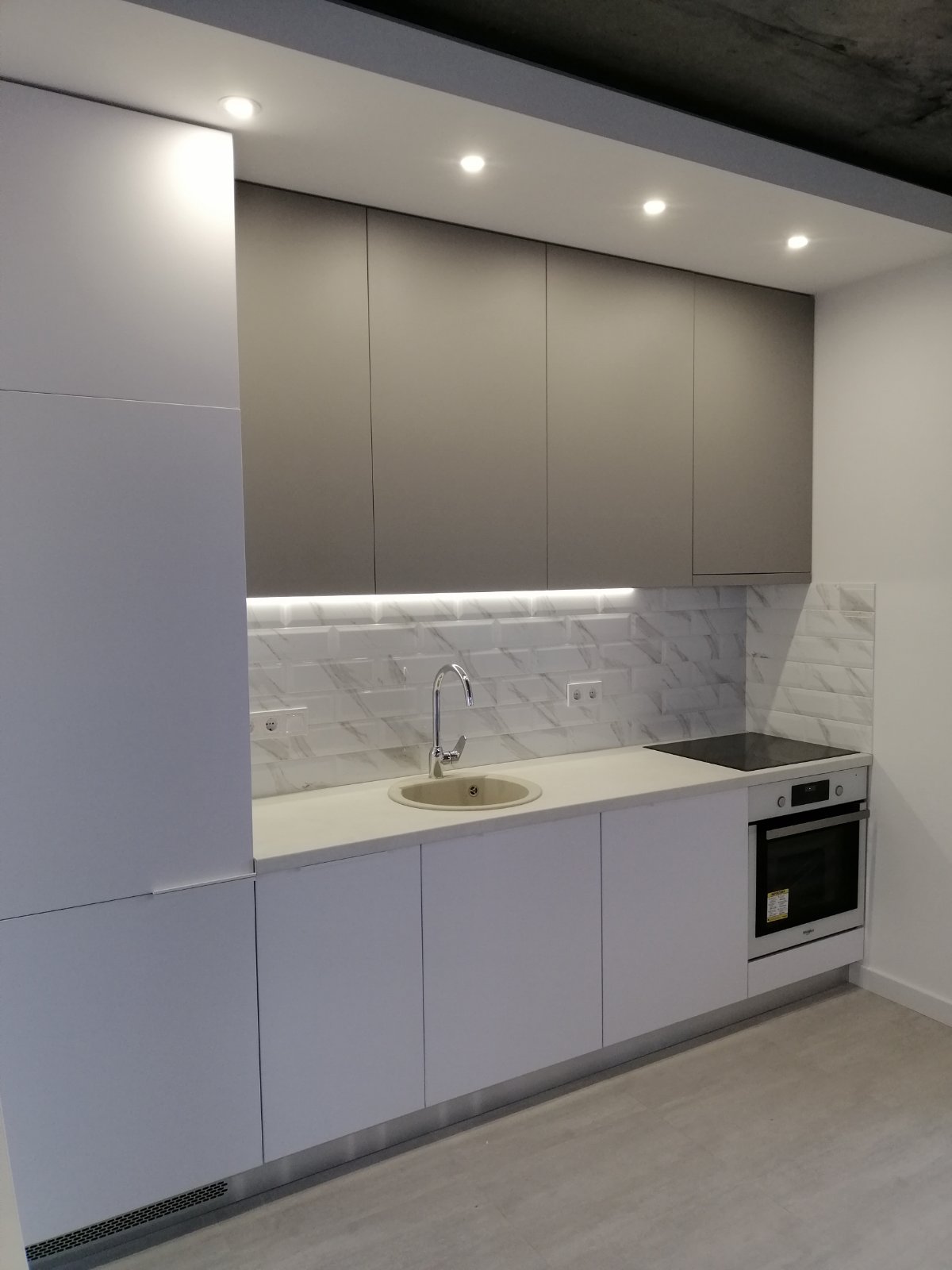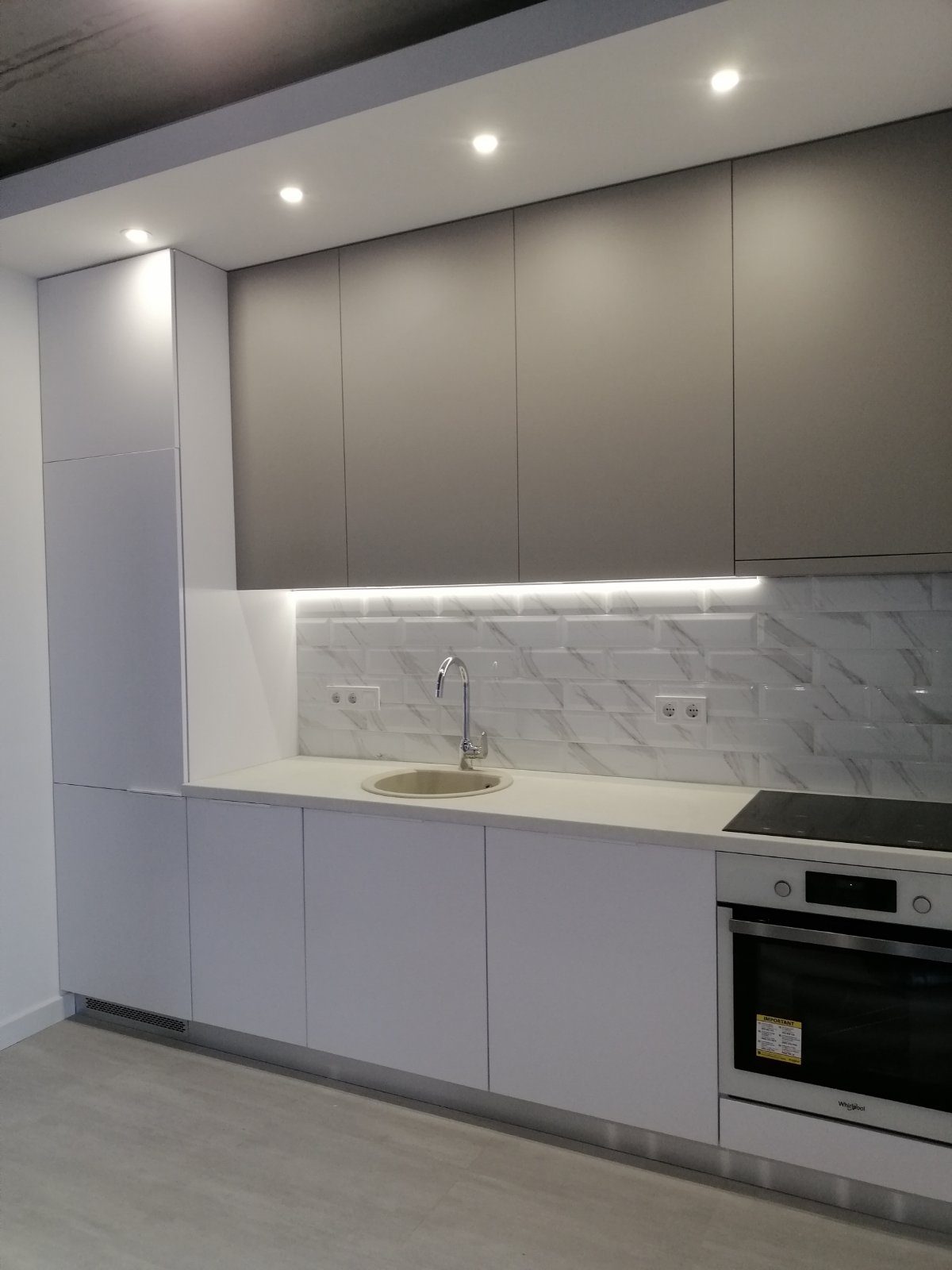 Если вы любите минимализм, сдержанные цвета и строгие линии в интерьере, кухня «Шиншилла» из ДСП определённо придётся вам по душе! Эта прямая кухня состоит из навесных и напольных шкафов прямоугольной формы, предполагается пространство под духовку. Такая кухня подойдёт как для квартиры средних размеров, так и для загородного дома.