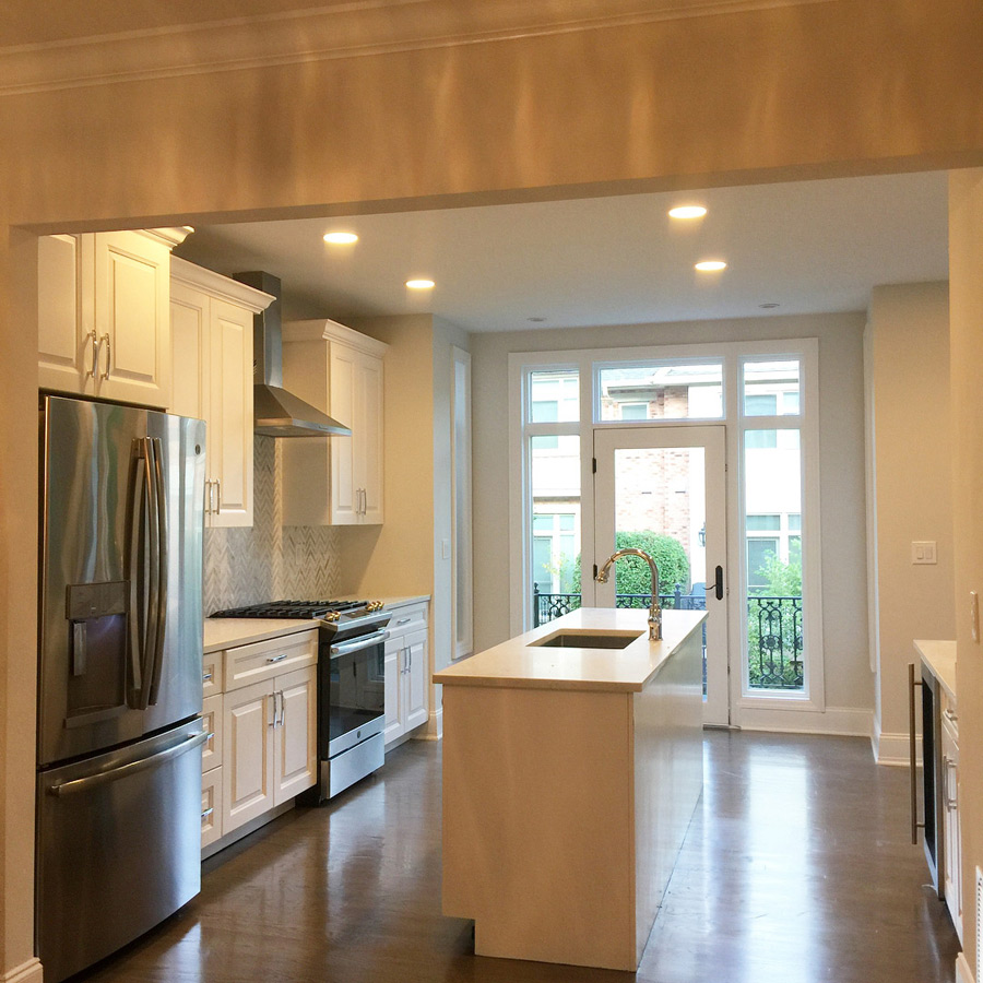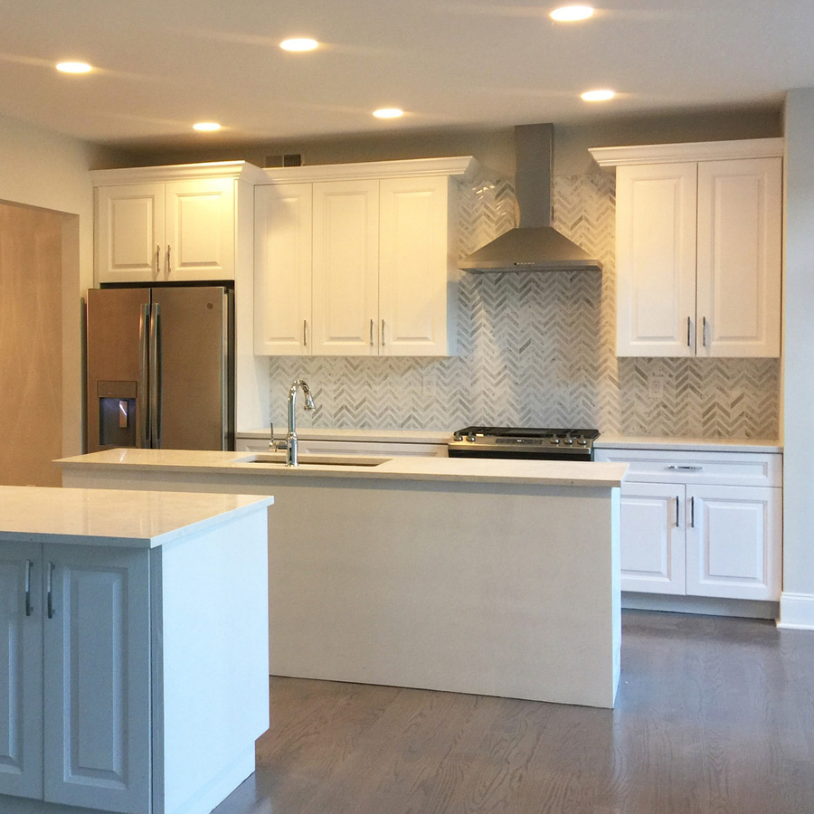 Карнизы и рамочный фасад повышают эстетические свойства. Интересным решением выступает островная тумба с мойкой. Столешницы из кварца формируют хорошую гигиеничность и простоту ухода. Прочные материалы обеспечат многолетнюю эксплуатацию. По желанию заказчика возможно изменение цветов, материалов и размеров кухни.