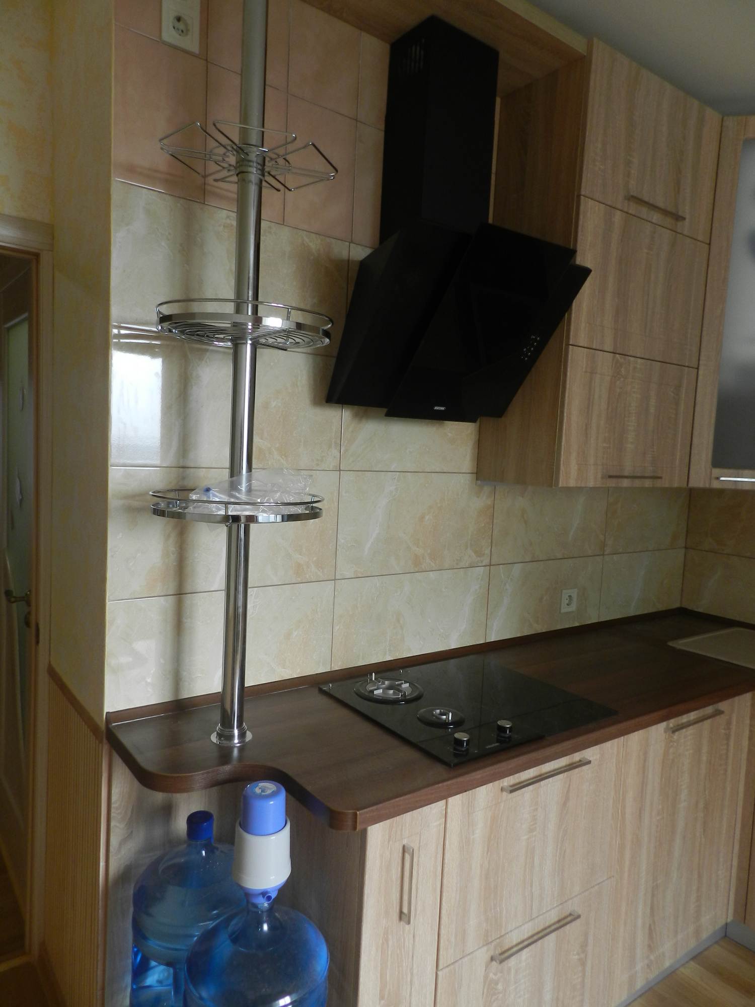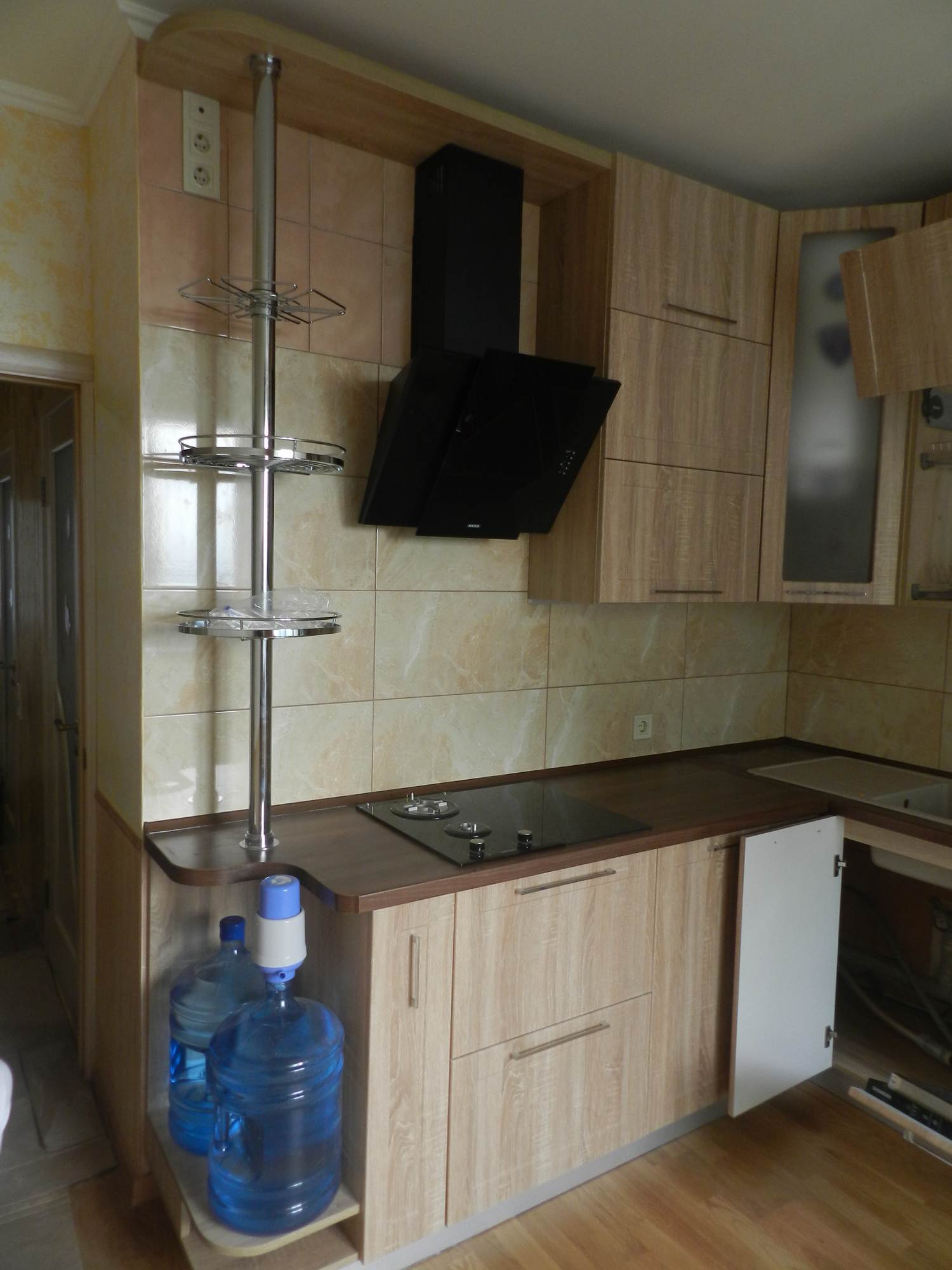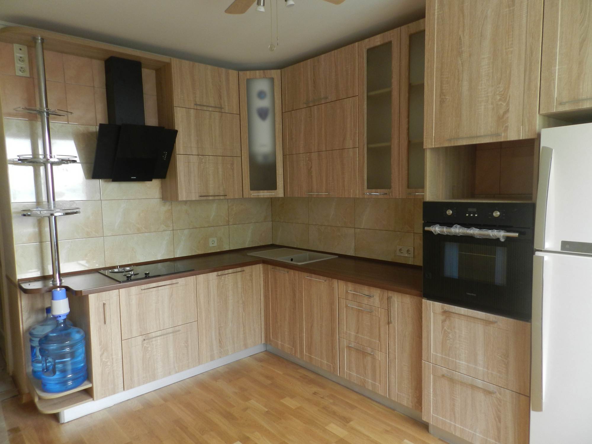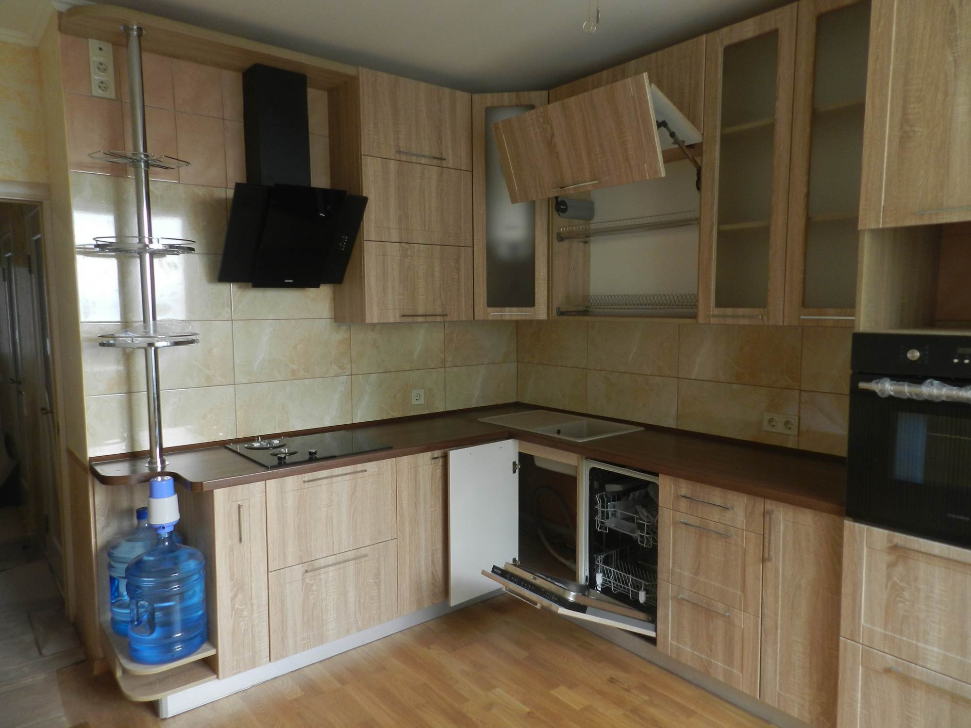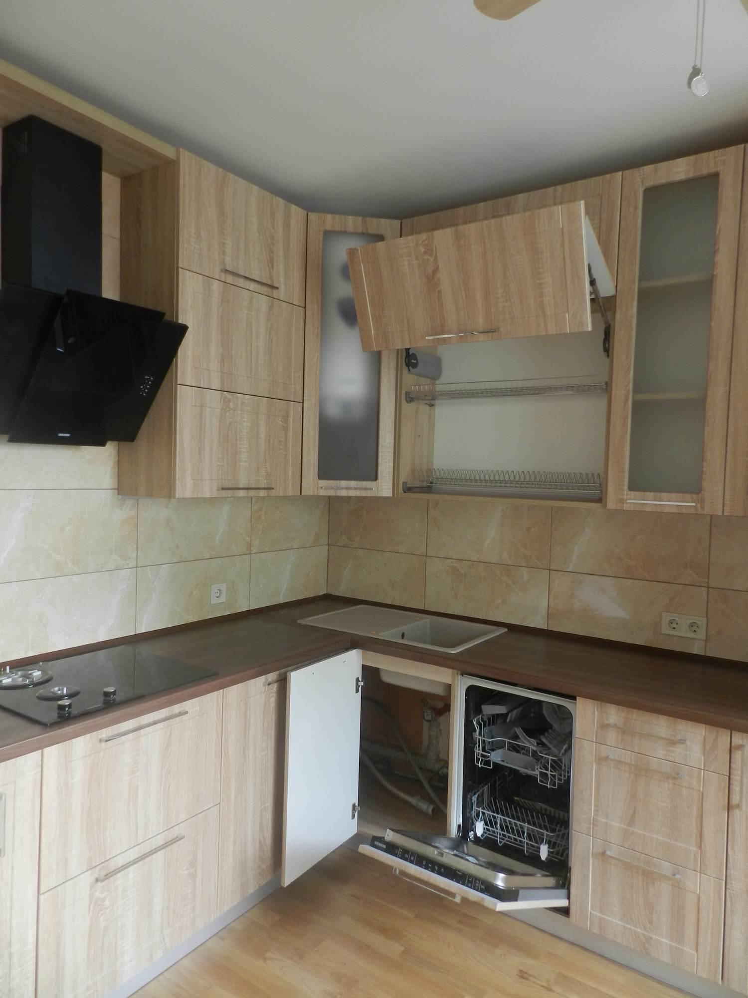 Классическая угловая кухня «Вета» из ДСП и стекла идеально подойдёт для частного дома или небольшой квартиры благодаря компактным размерам. Кухня имеет дизайн под натуральное дерево приятного бежевого тона. Комплект оснащён вехними навесными и нижними напольными шкафами, вытяжкой, пространством под микроволновку, кулер и посудомоечную машину. Тёмно-коричневая столешница из МДФ имеет закруглённую форму, она отличается повышенной прочностью и устойчивостью к повреждениям. Купить кухню «Вета» можно в полной или частичной комплектации, доставка и установка производится по всей России.