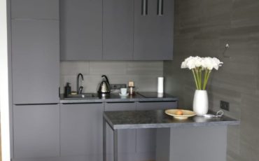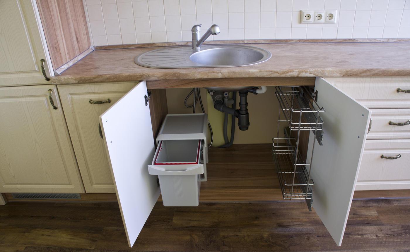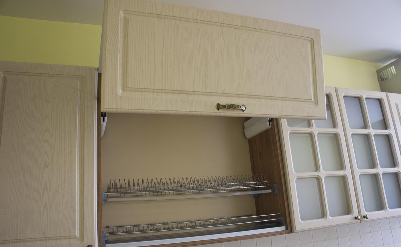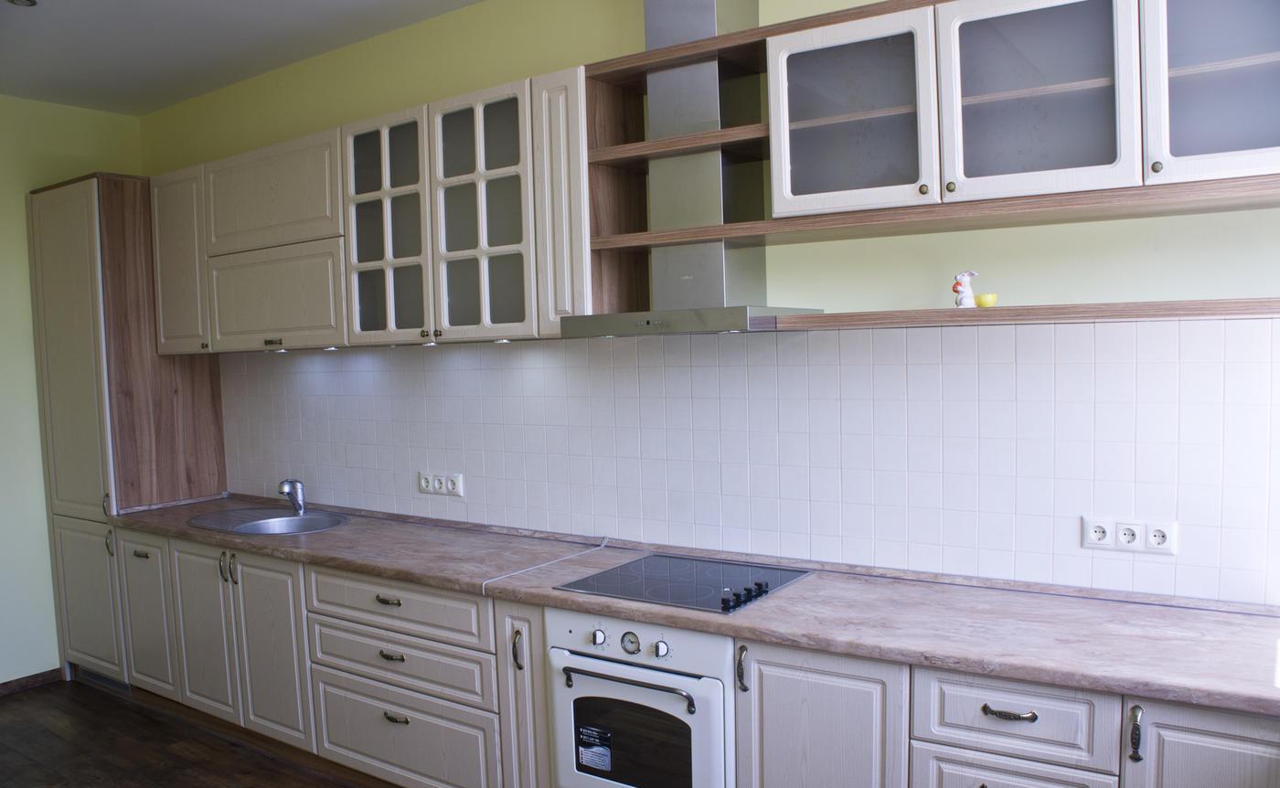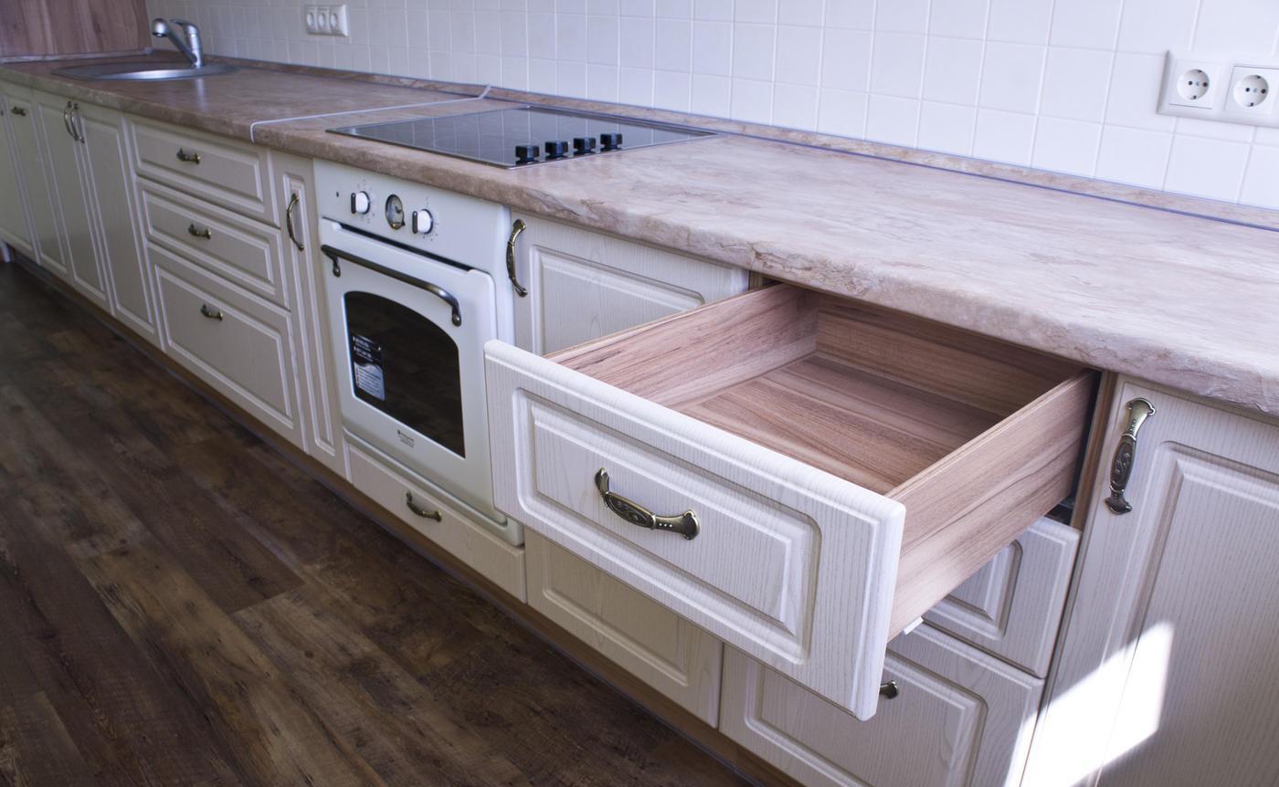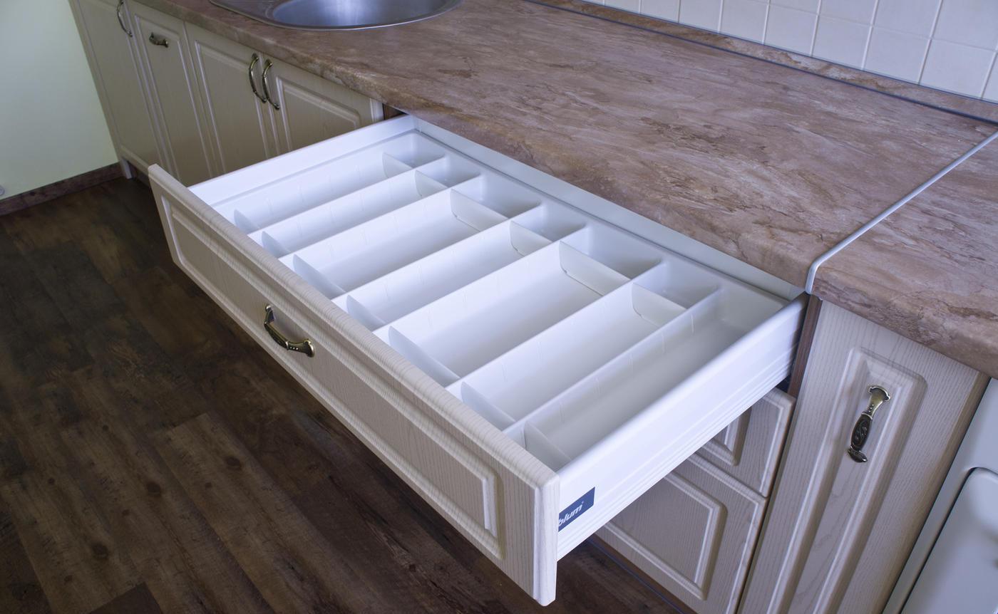 Предусмотрен пенал для холодильника. В нижнем ящике есть отдельная секция для ложек и вилок, а также оборудована подставка для бутылок с маслами. Качественная столешница из ламинированной плиты прочная и простая в уходе.