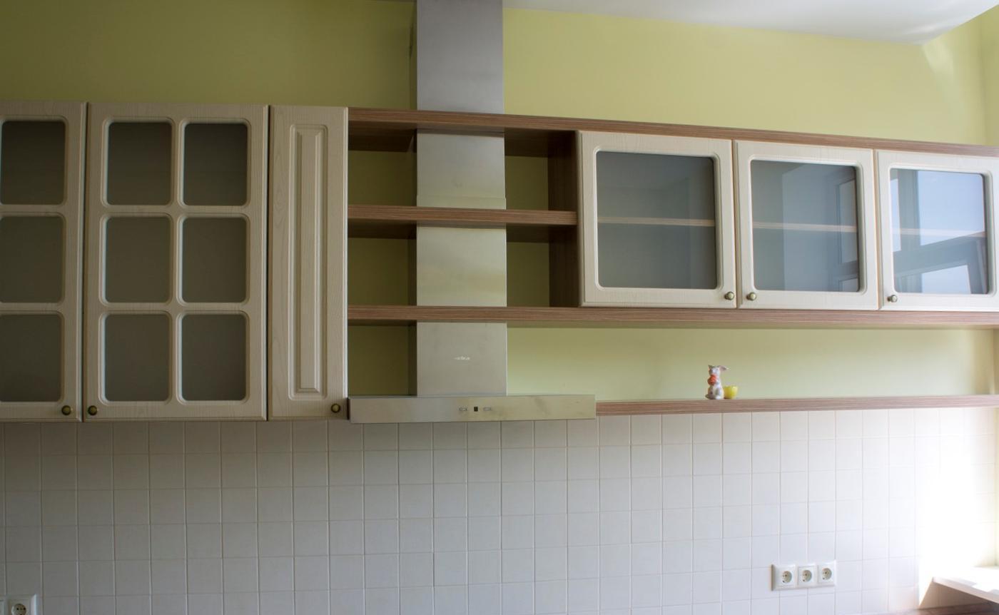 Кухня Брюл подойдёт тем хозяйкам, которые предпочитают тепло и уют. Нежный гарнитур выполнен в стиле модерн. Фасад из МДФ приятно-бежевого цвета, хорошо сочетается с корпусом из ДСП цвета орех. Верхние шкафы частично со стеклянными дверцами. Вытяжка вмонтирована в навесные полочки.