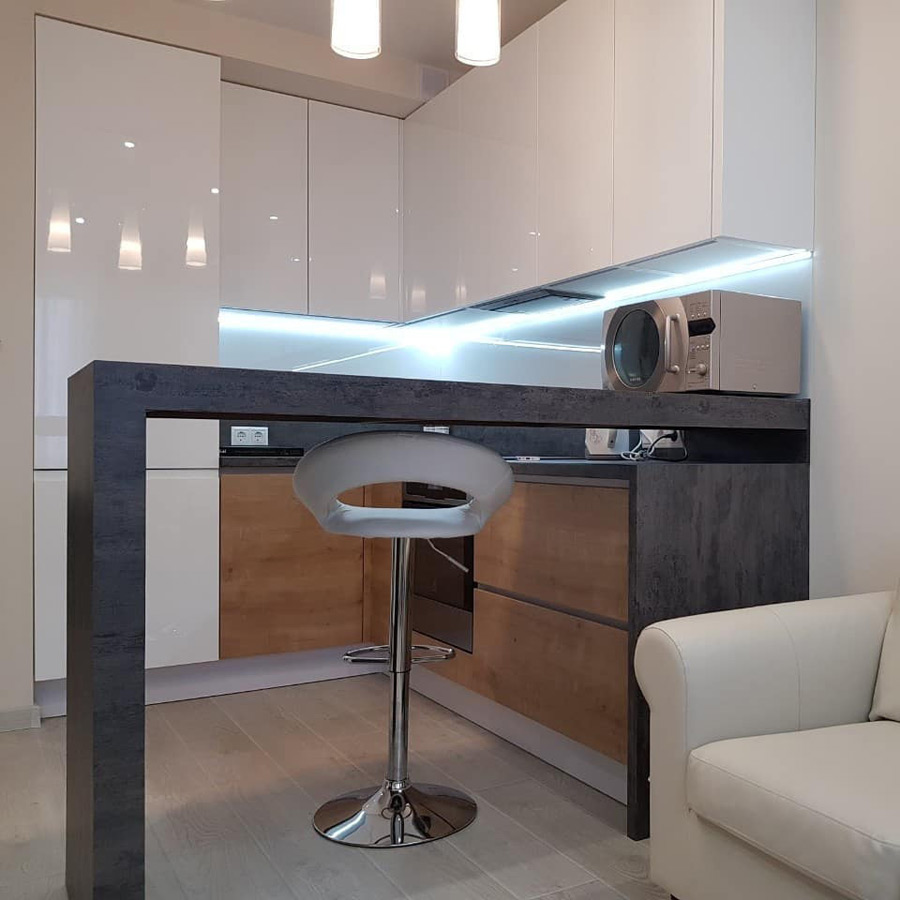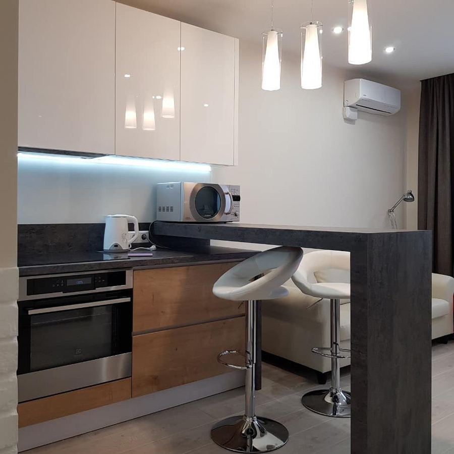 Для любителей оригинальных интерьеров отличной находкой станет барная стойка чёрного цвета, которую можно установить так, как это будет необходимо заказчику.