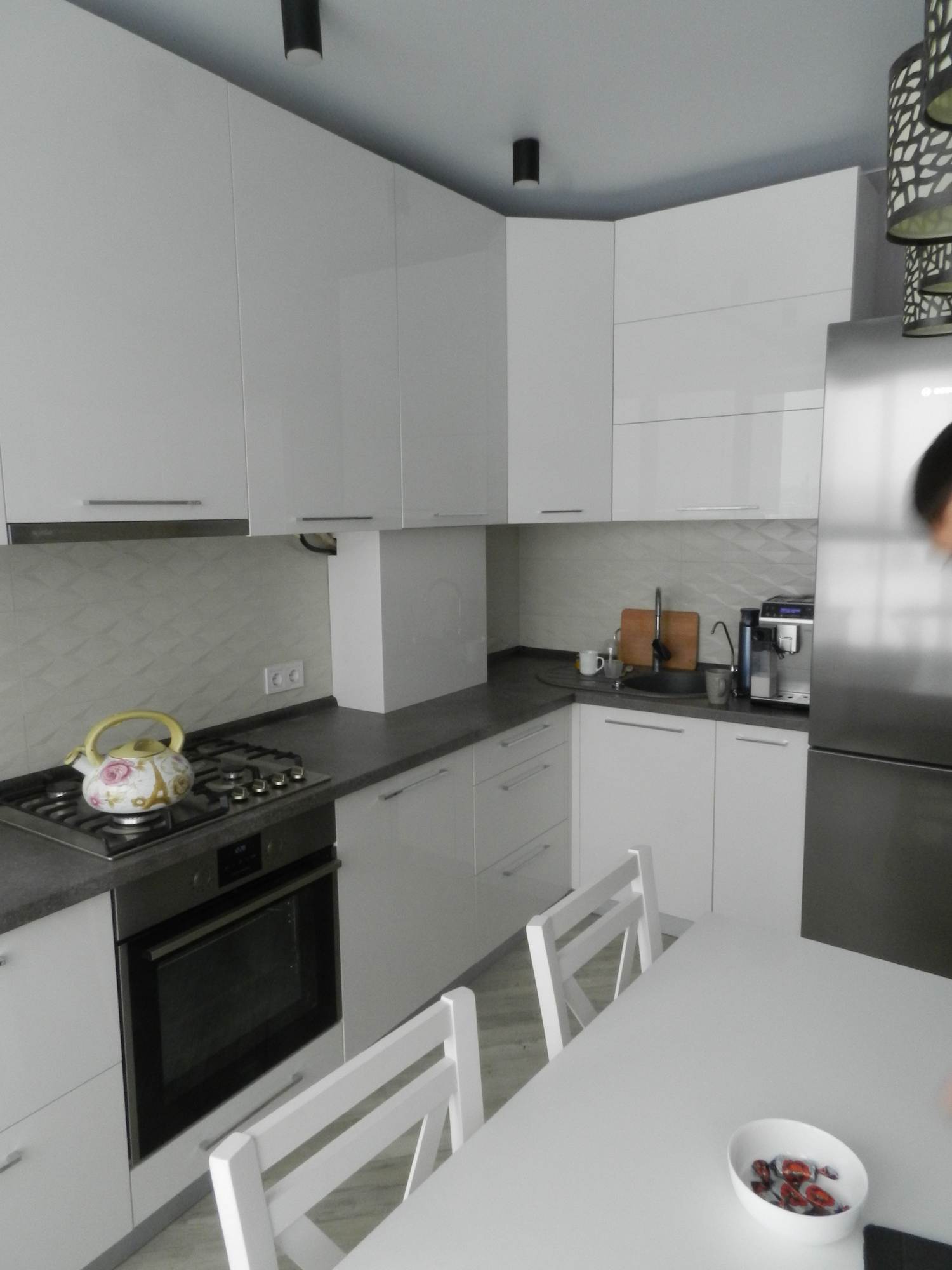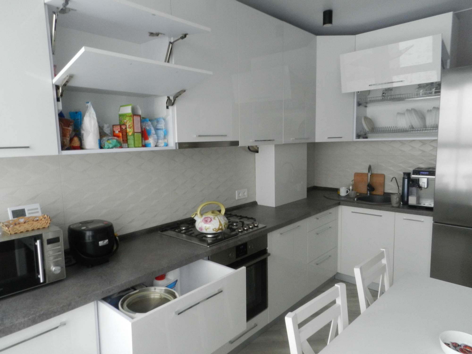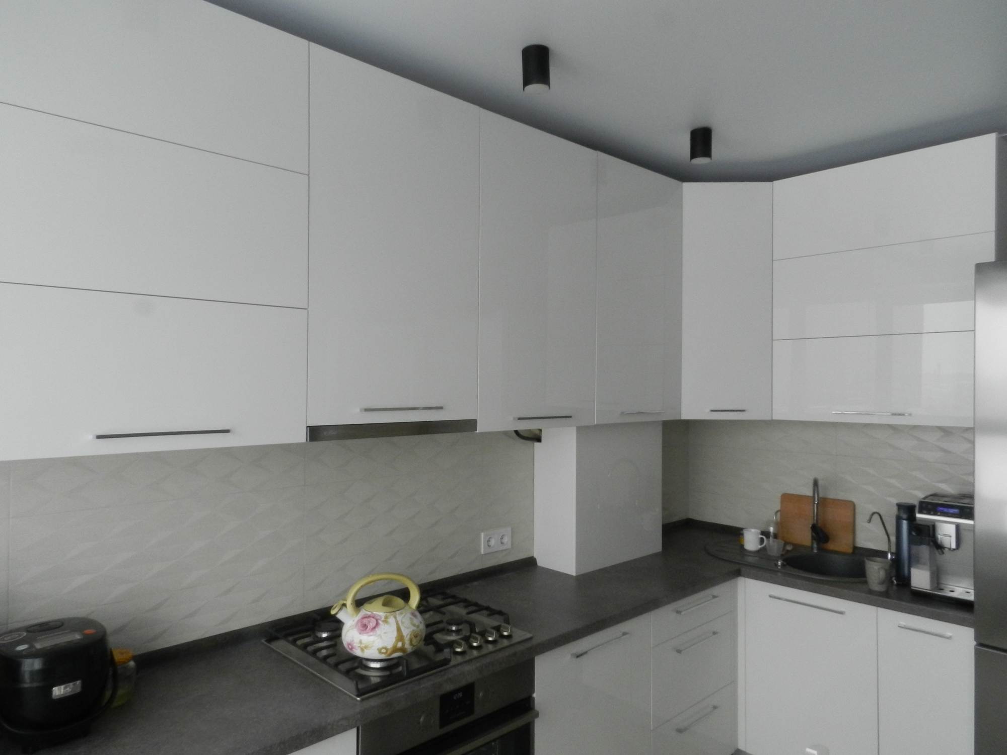 Кухня подойдёт для вместительных помещений, пространство в которых ещё больше визуально расширится благодаря цветовым контрастам. Множество открывающихся и выкатных шкафов позволит найти место для всего необходимого. По вкусу покупателя цвета, конфигурацию, материалы и размеры можно изменить.