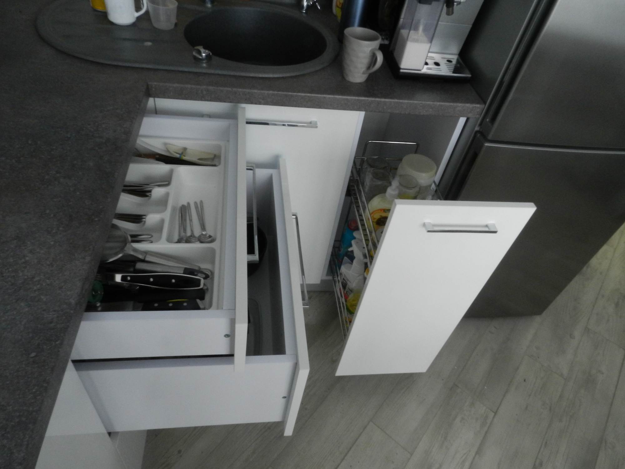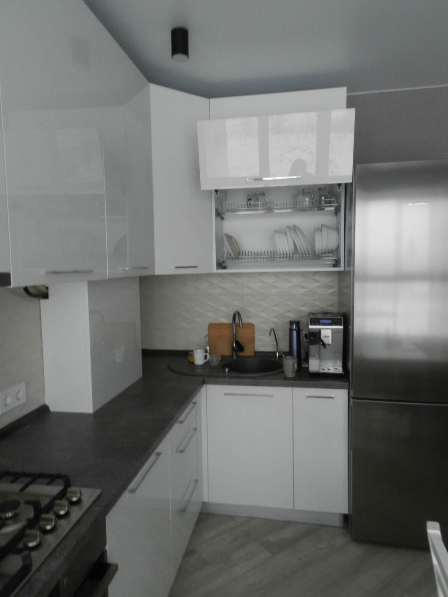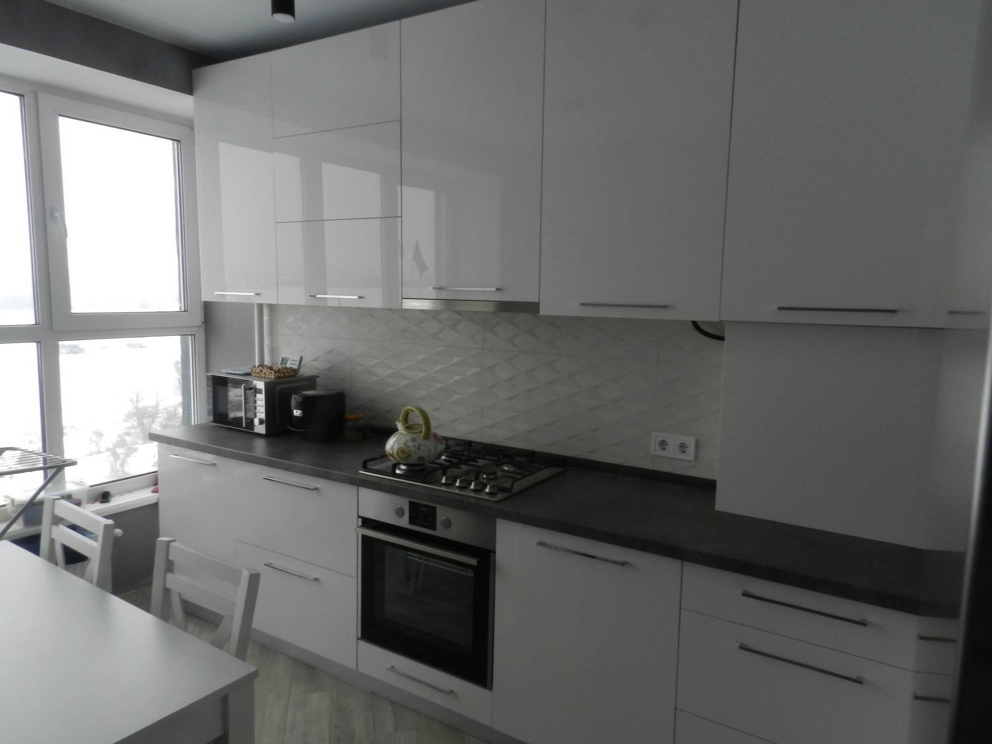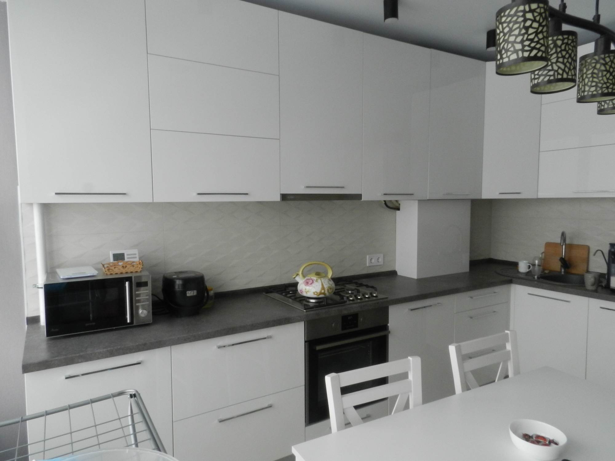 Кухня подойдёт для вместительных помещений, пространство в которых ещё больше визуально расширится благодаря цветовым контрастам. Множество открывающихся и выкатных шкафов позволит найти место для всего необходимого. По вкусу покупателя цвета, конфигурацию, материалы и размеры можно изменить.