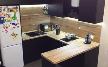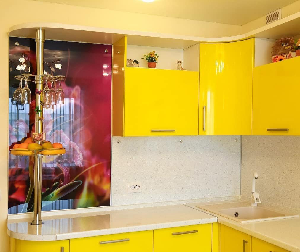 Множество навесных шкафов позволит уместить на кухне все необходимое, а на стильной стойке можно красиво развесить бокалы и разложить фрукты. Зону с фотопечатью возле нее Вы сможете оформить в любом стиле и цветовой гамме.