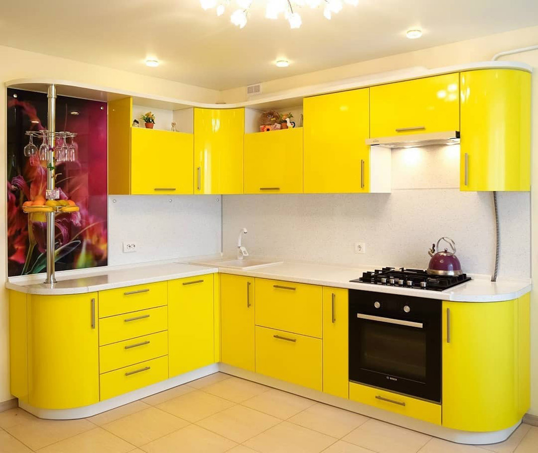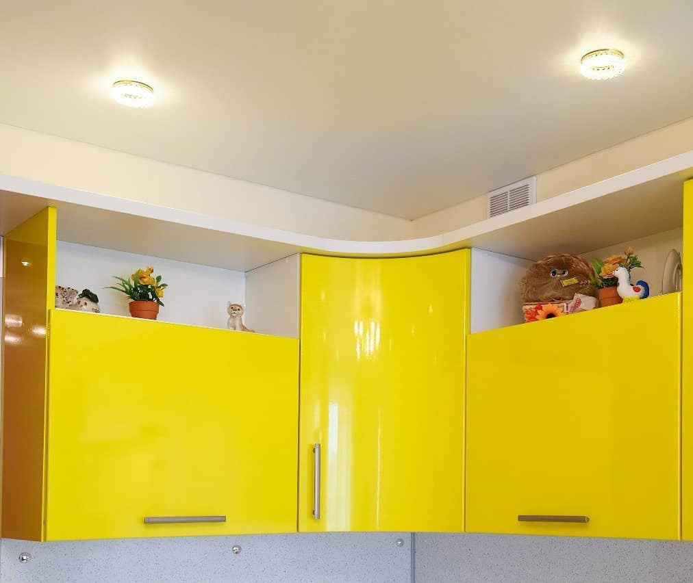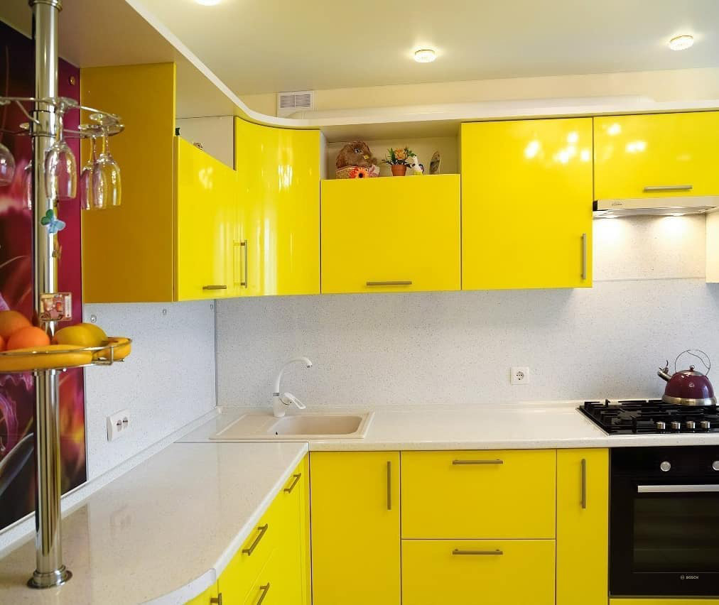 Гарнитур Брендон — это яркая угловая кухня в стиле хай-тек. Это отличный выбор для смелых, неординарных натур, которые предпочитают сочные оттенки и не боятся экспериментов. Желтый фасад цвета спелого лимона успокаивает белоснежная столешница из прочного кварца.