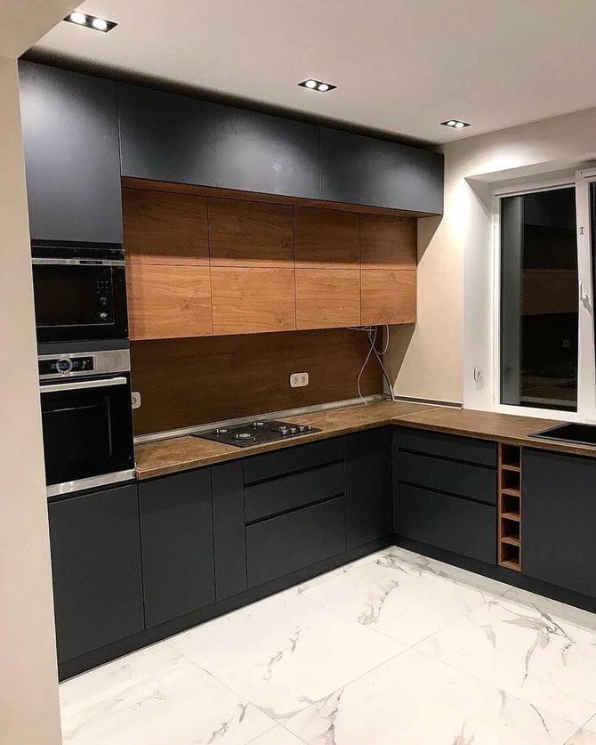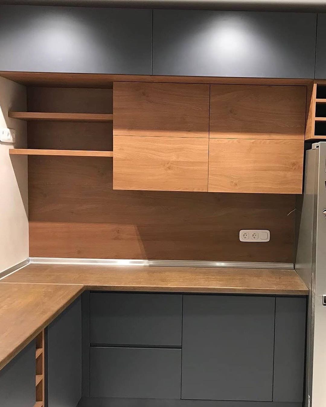 Кухня «Европа» полностью отвечает всем модным тенденциям. Современная модель гарнитура под потолок будто расширяет пространство. Такая кухня станет идеальной для небольших квартир. Она визуально увеличит площадь и добавит яркий акцент в ваш интерьер. Множество верхних и нижних шкафчиков вместят все необходимые предметы быта и встроенную технику. Эта кухня абсолютно универсальна. Она подойдет как для большой семьи так и для индивидуального пользования. Дерево — абсолютный тренд последних лет, который в сочетании с глубоким темным цветом, придаст интерьеру оригинальности.