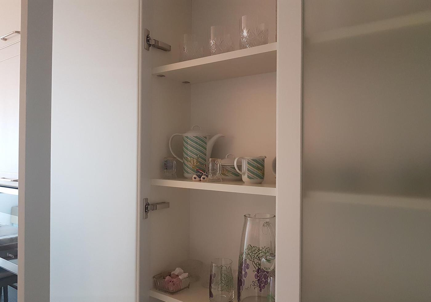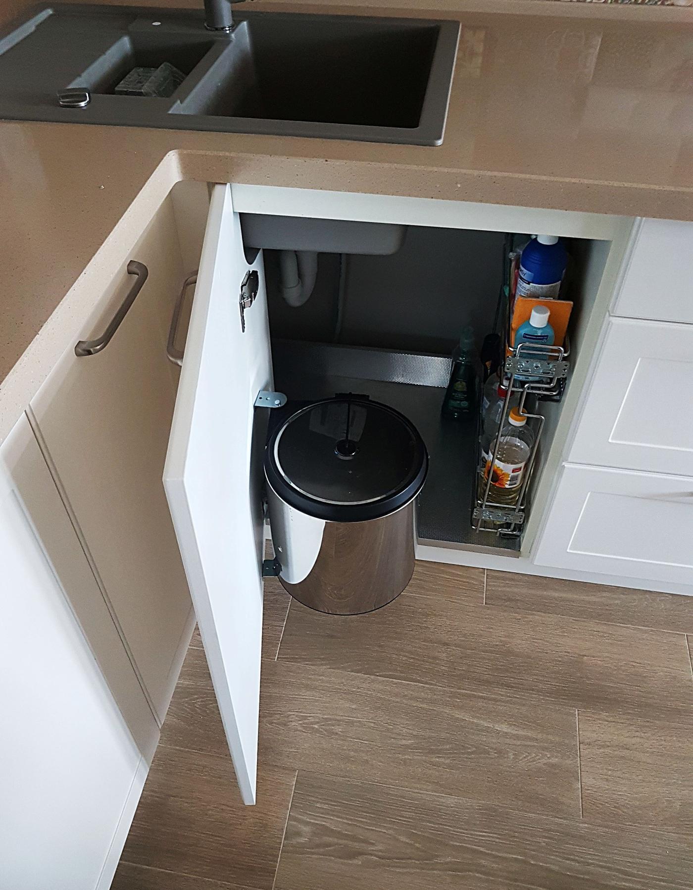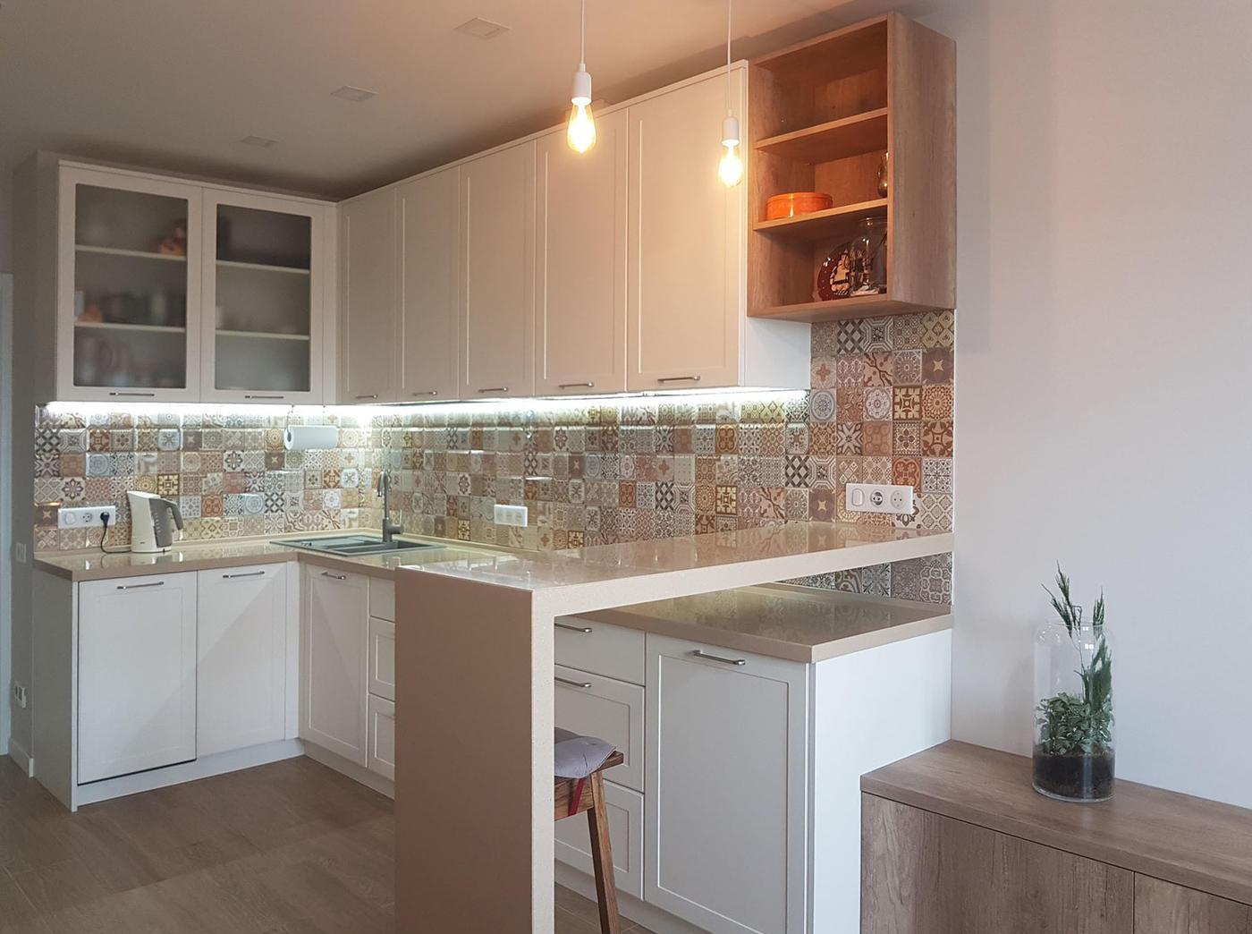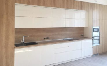 Дизайнерская кухня «Деко» — мечта тех, кто стремится к роскошным интерьерам, но не приемлет классические варианты. Подходит как для квадратных, так и для прямоугольных комнат. Вставки матового стекла надёжно спрячут содержимое отделений верхних ящиков, и одновременно визуально разгрузят кухню. Гарнитур изготовлен в П-образной форме с барной стойкой на конце, что позволяет верно спланировать пространство и сделать его наиболее эффективным. Преимуществом модели является существование большого количества ящиков для хранения и устойчивой к износу кварцевой столешницы увеличенного размера, которая может выступить и в роли небольшого обеденного стола.