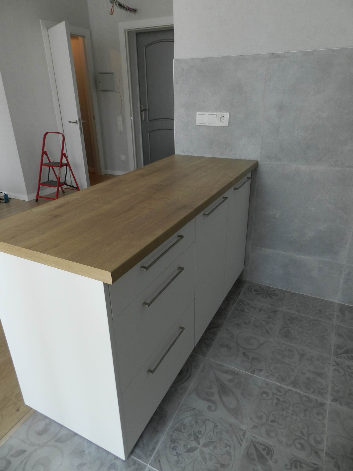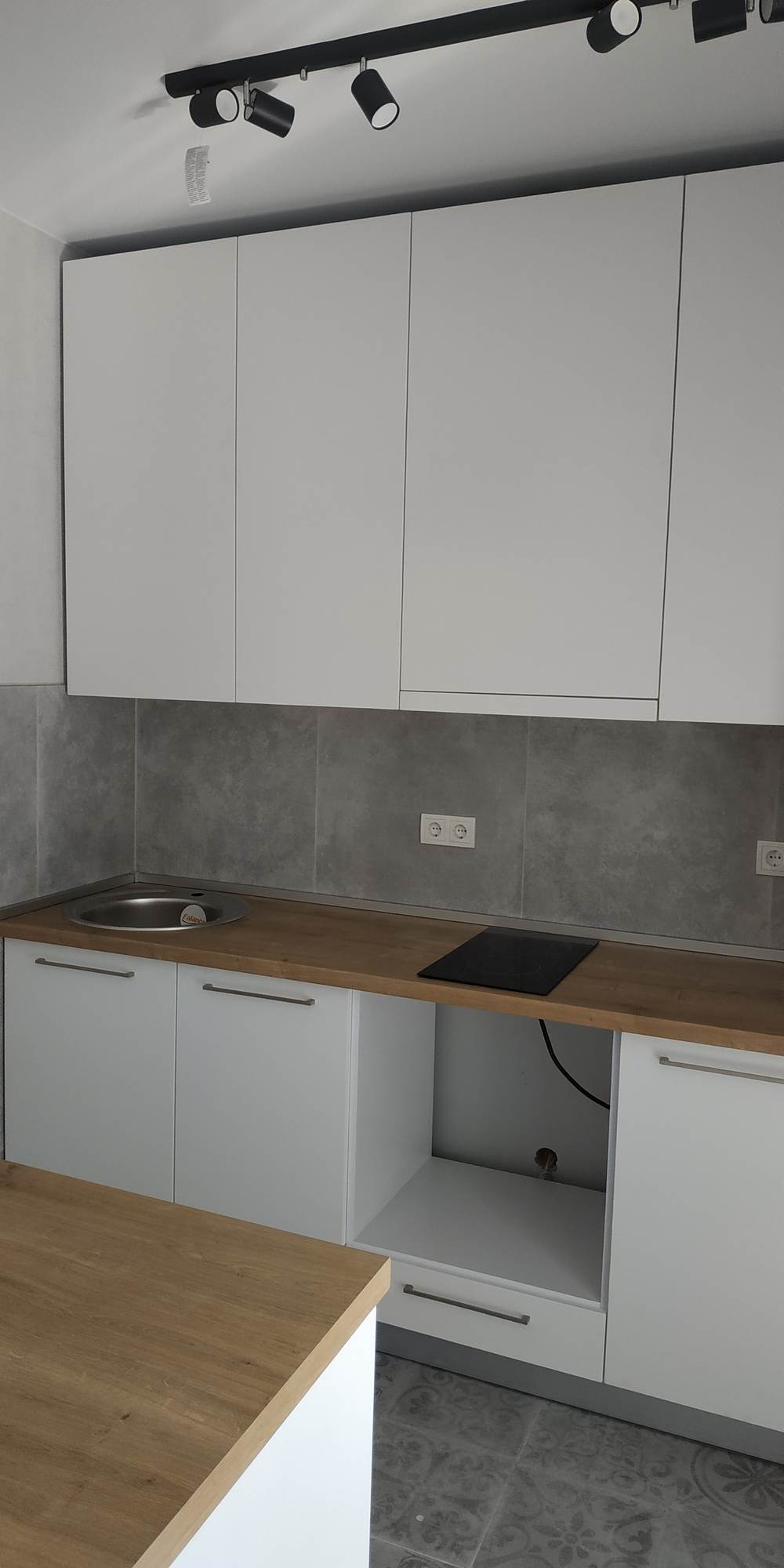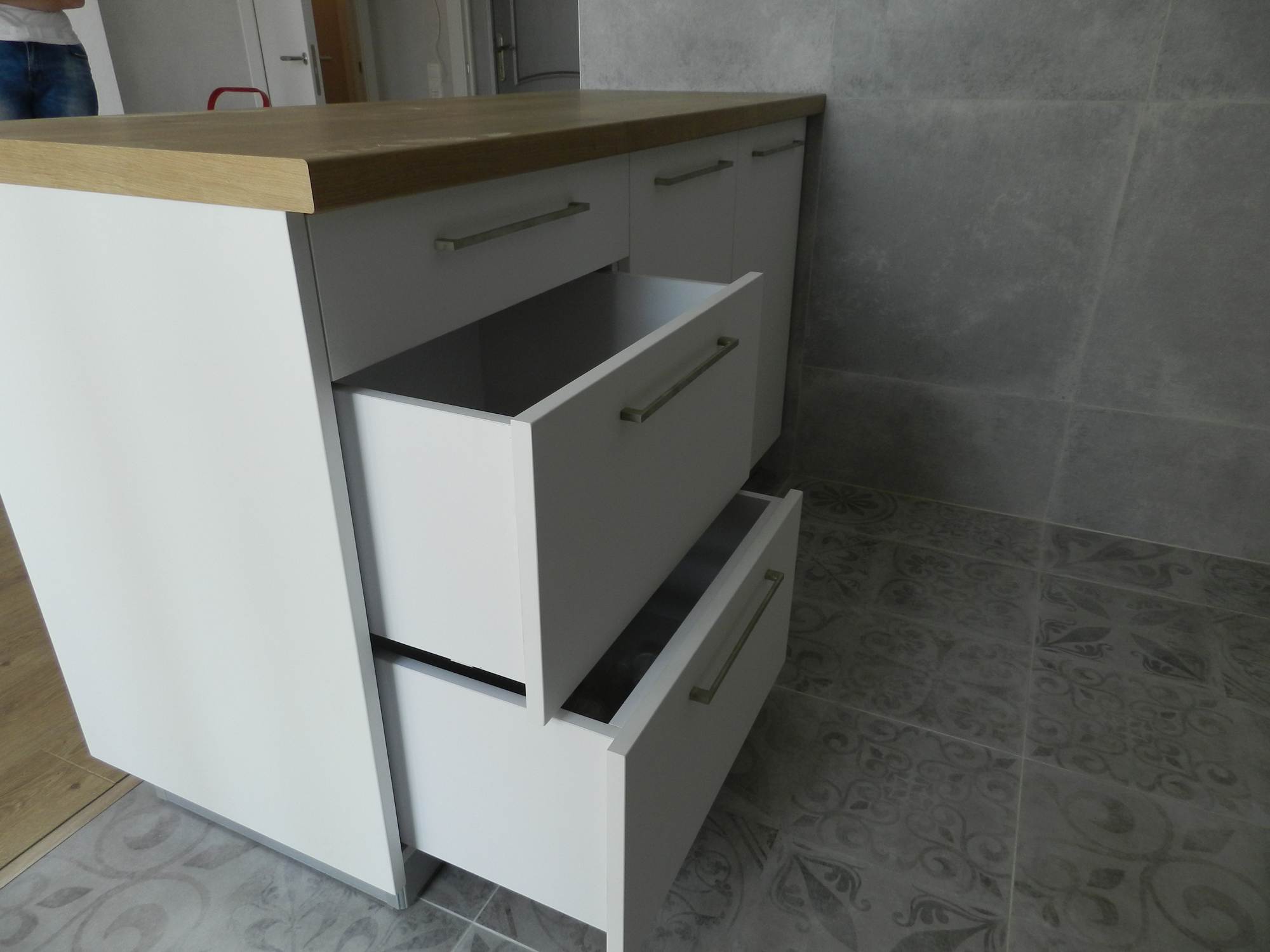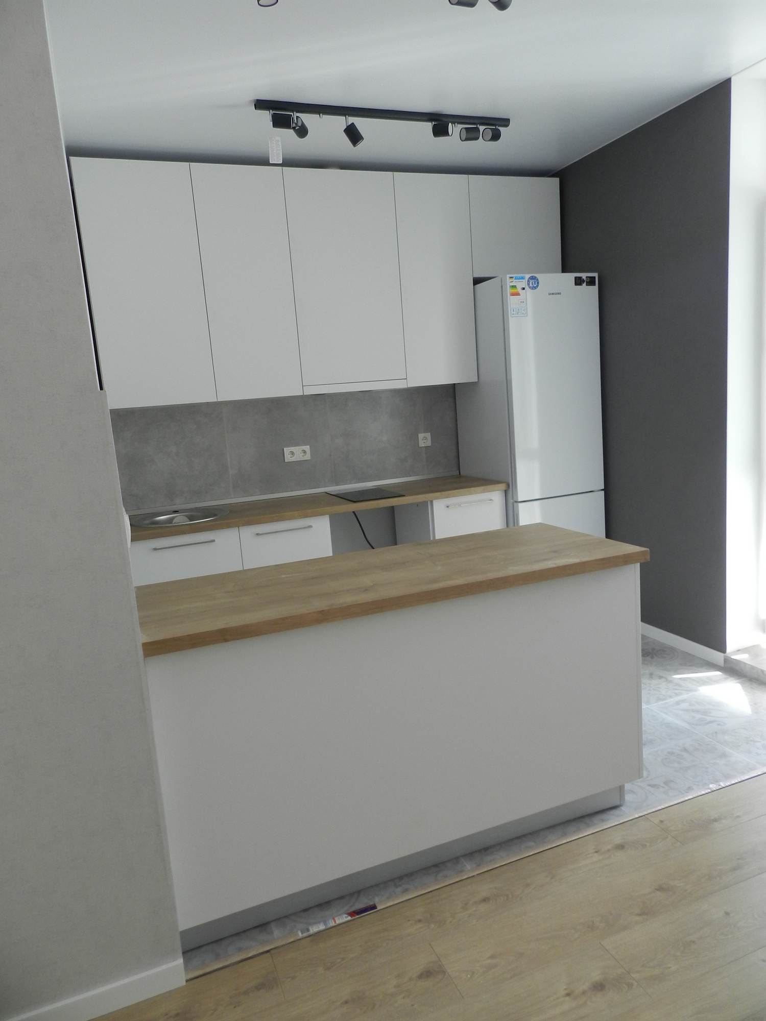 Фасад из экошпона и МДФ белый, без лишних деталей. Шкафы и ящики вместительны, удобные полочки помогут вам разложить всё по местам. Столешницы цвета орех выполнены из сплошного массива, прочны и удобны в уходе. Предусмотрен навесной шкаф для встроенной вытяжки.