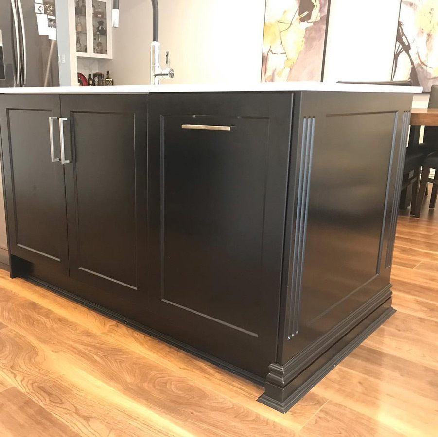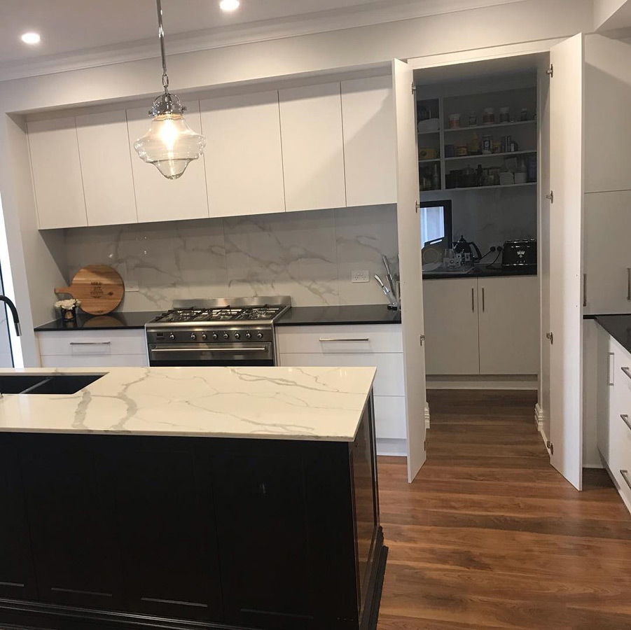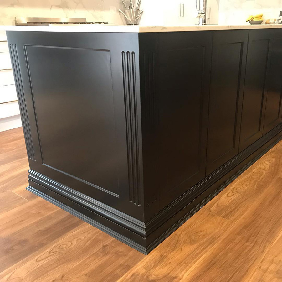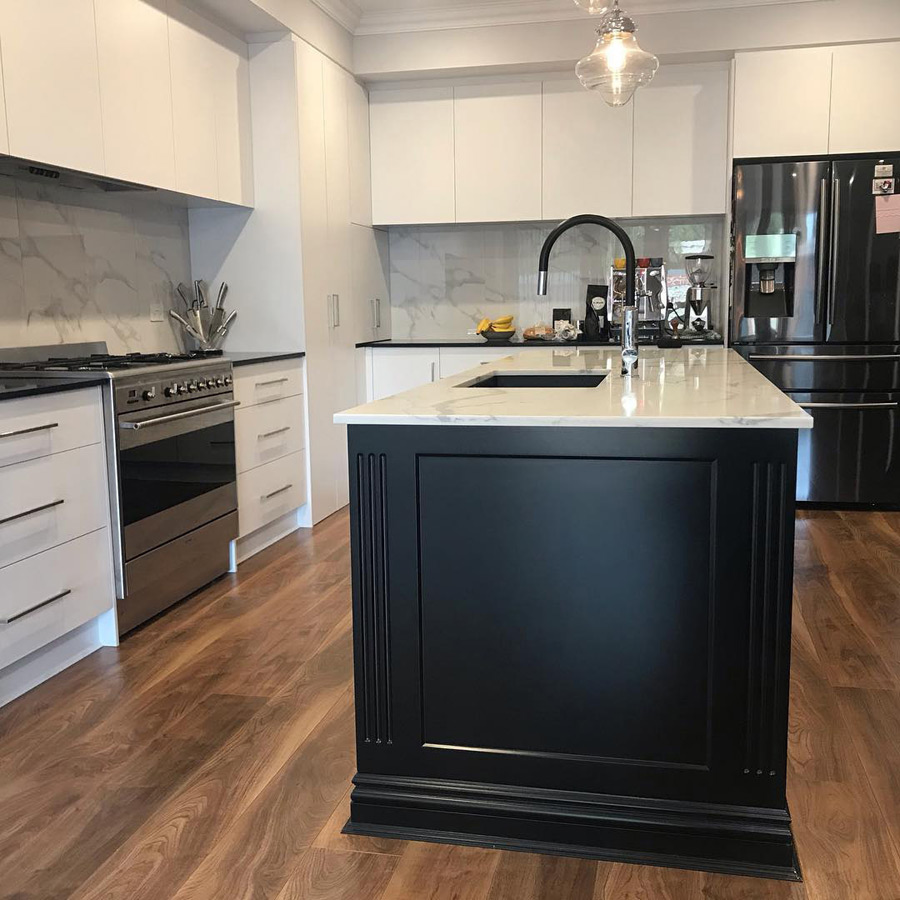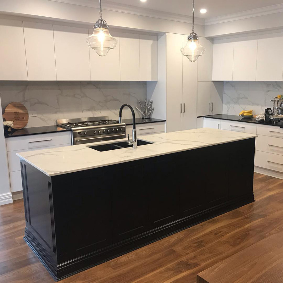 Островная планировка прекрасно смотрится в просторной кухне, объединенной с гостиной. Гарнитур «Пауер» отличается минимализмом с четкими линиями и стильным цветовым контрастом. Верхние шкафы с ровными, глухими фасадами без декора отлично имитируют стену, за счет чего в интерьере не создается награмождение. Такая мебель визуально расширит и преобразит пространство кухни.