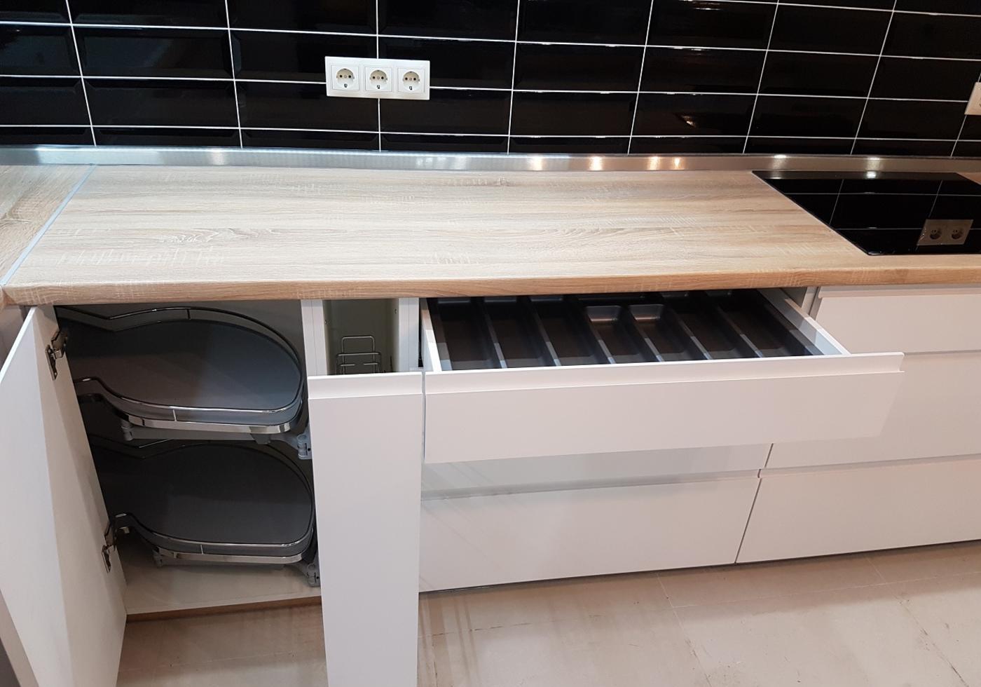 Белая угловая кухня Айтос с эффектной деревянной столешницей подойдет и для типовых помещений средней площади, и для просторных столовых. Все внутреннее наполнение – вместительные выдвижные ящики, лотки для приборов и иных мелочей, поворотная карусель, отделение для бутылок – отвечает задачам экономии полезного пространства. Продуманная эргономика позволяет разместить все необходимое в удобном для хозяйки порядке. Дизайн гарнитура – современный, итальянский. Выполненные из качественного влагостойкого МДФ фасады долго сохранят свой респектабельный вид. Изготовление мебели возможно по индивидуальному проекту: цвет и габариты выбираются по согласованию с заказчиком.