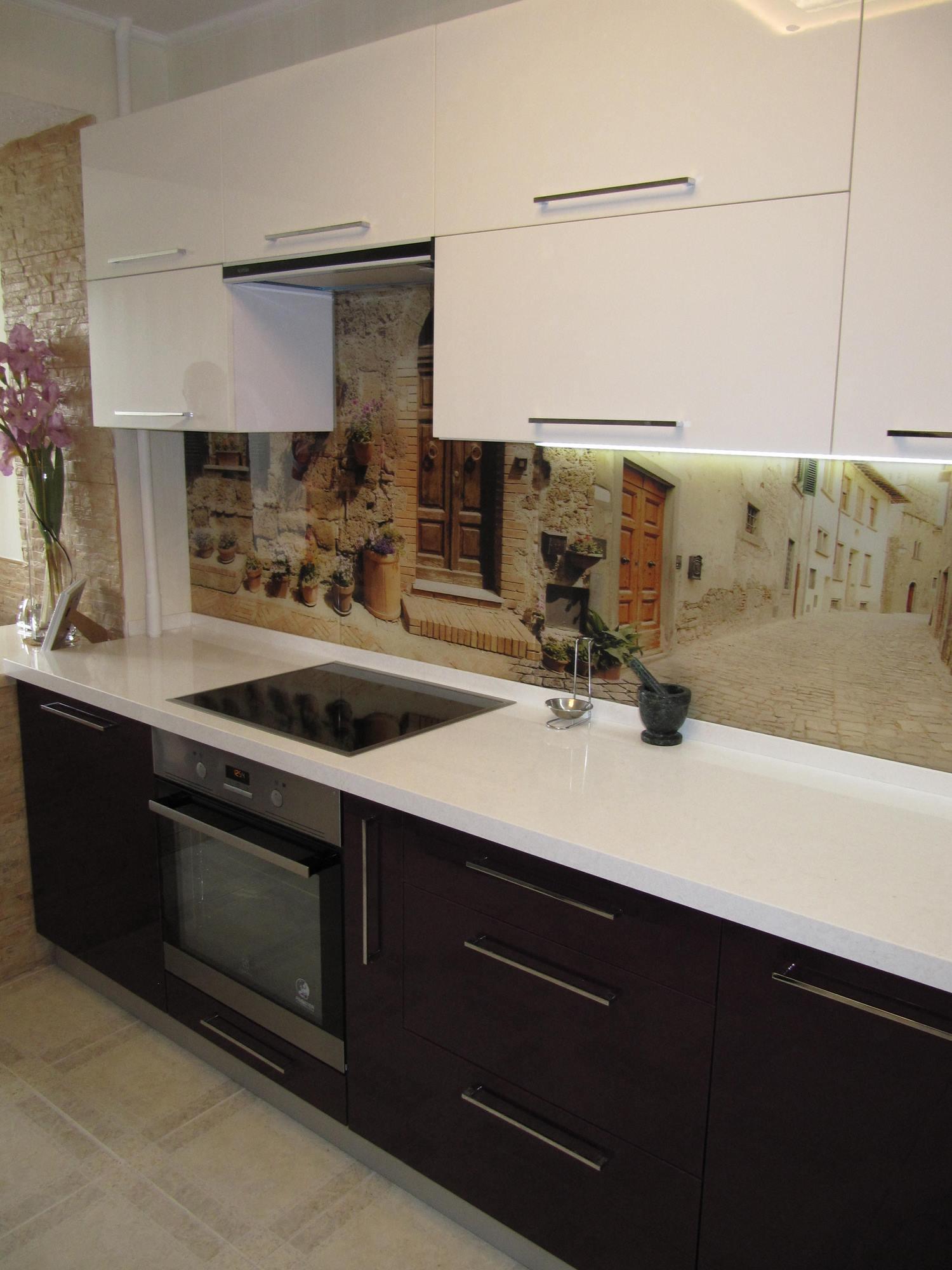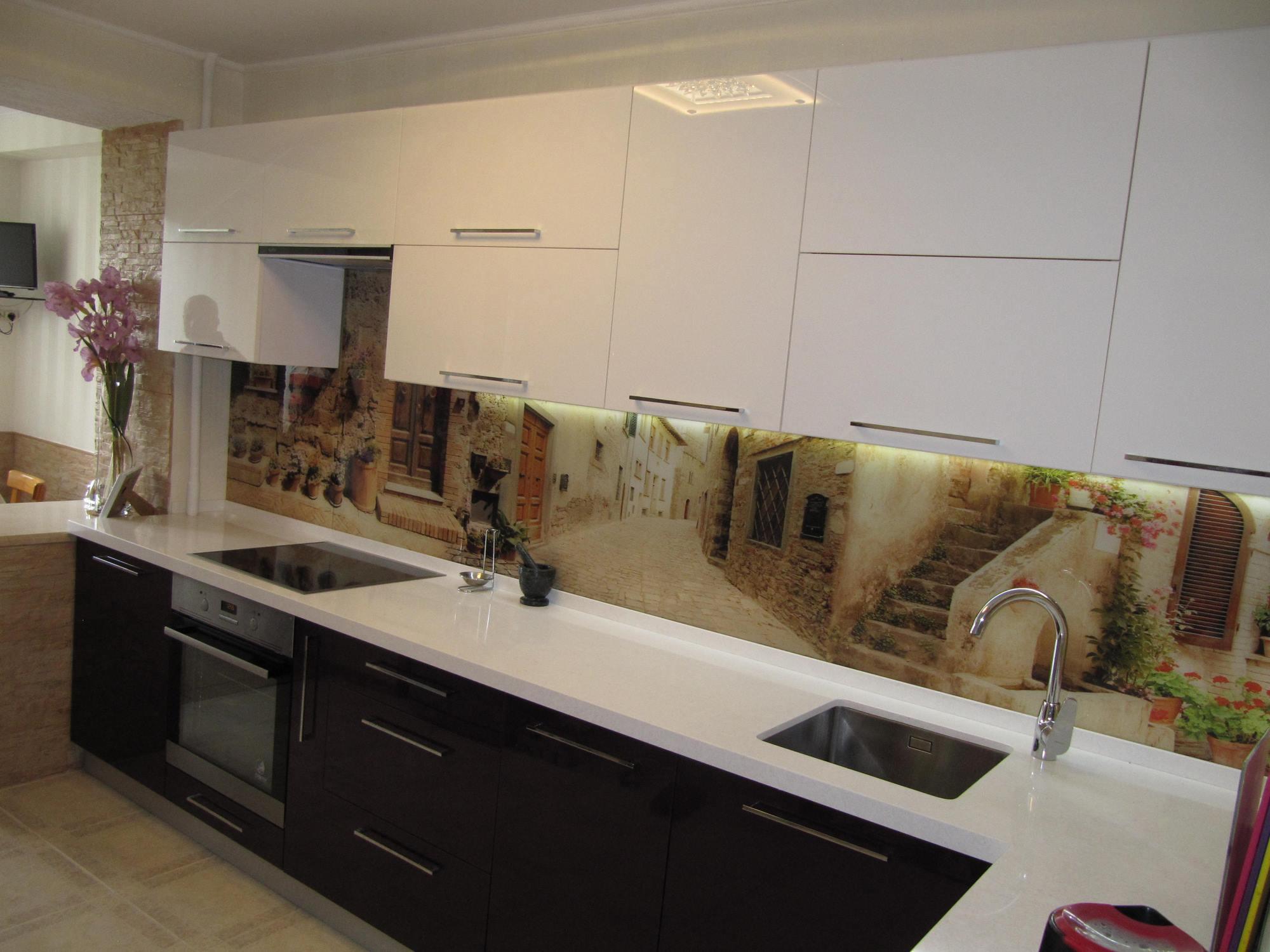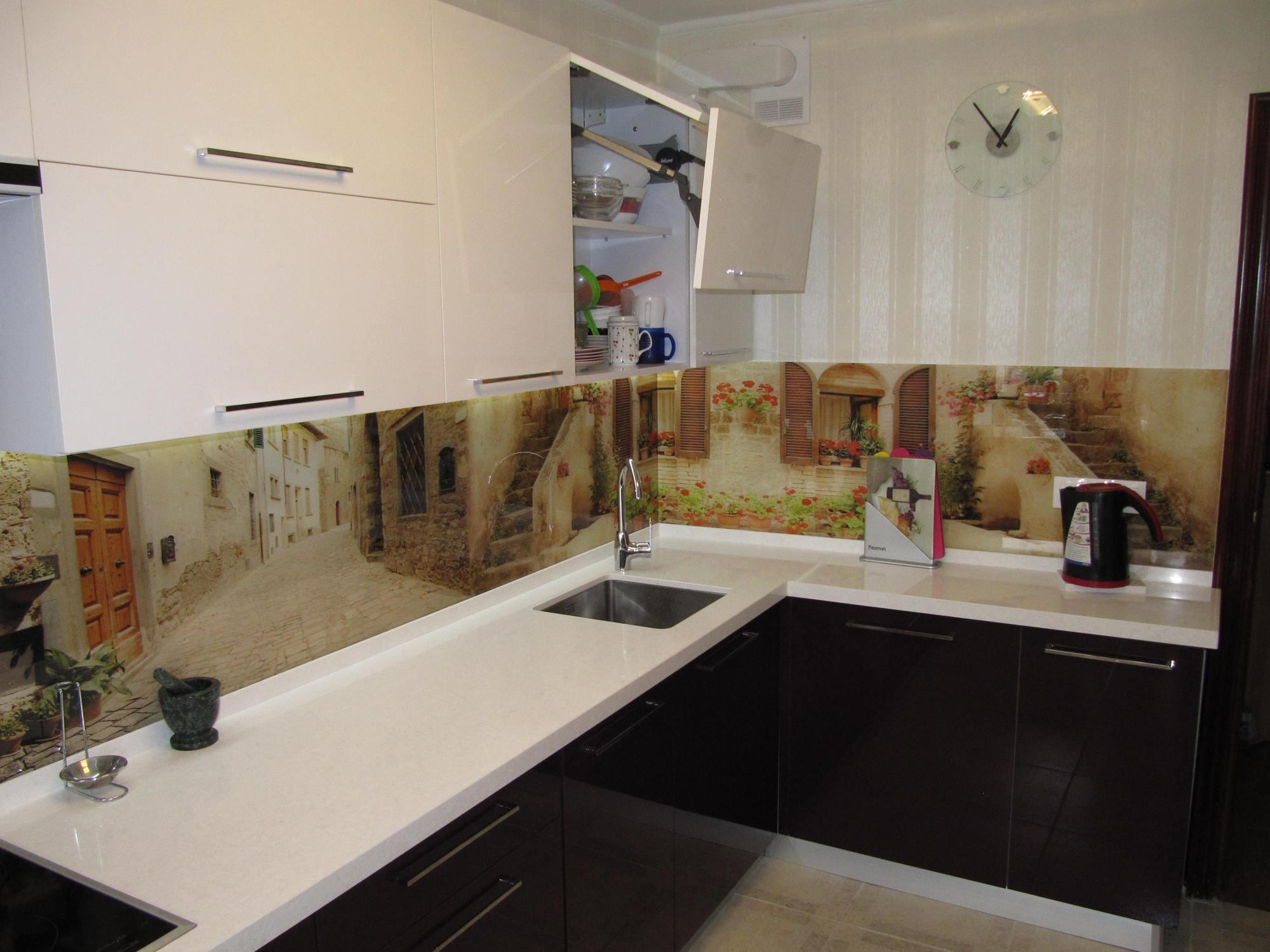 Гарнитур Алисия относится к угловому типу кухонной планировки (L или Г-формы).Такая модель предназначена для средней или небольшой кухни. Она компактная и вместительная. Множество шкафчиков, идеально подобранных по цвету – белый верх, темный низ. Фасад покрыт глянцевым акрилом – прочным и легким в уходе. Фартук (область между столешницей и навесными шкафчиками) выполнен из стекла, покрытого фотопечатью. Уютные улочки старинного итальянского городка создают романтическую обстановку. Не хочется покидать эту маленькую Италию… Остается только добавить, что длина гарнитура, цвет шкафов и фотопечать могут быть изменены по желанию заказчика.