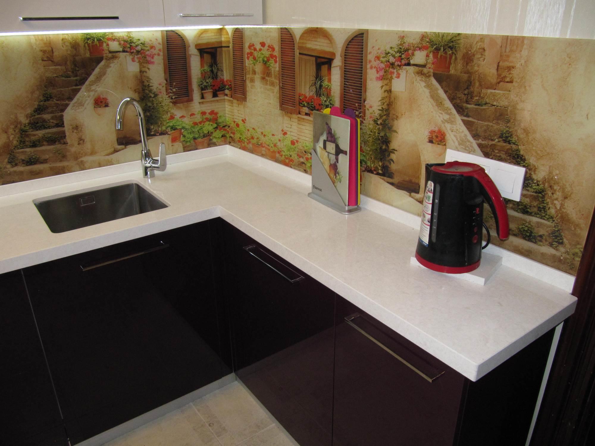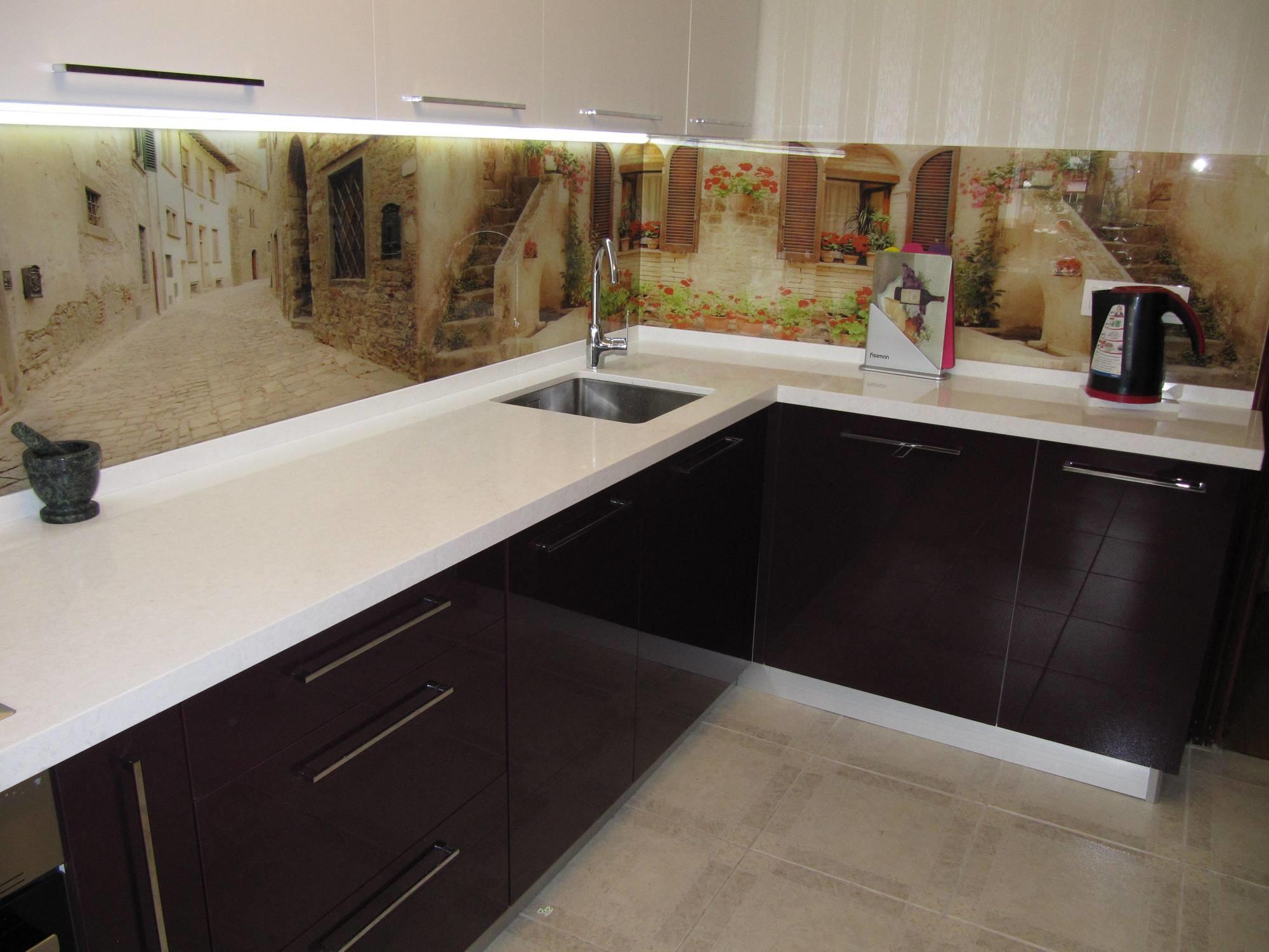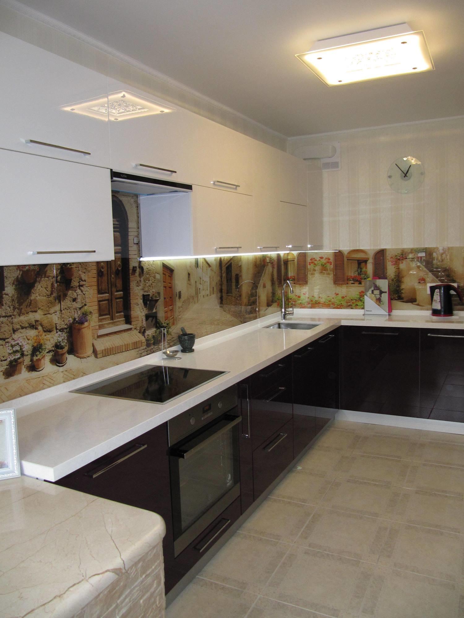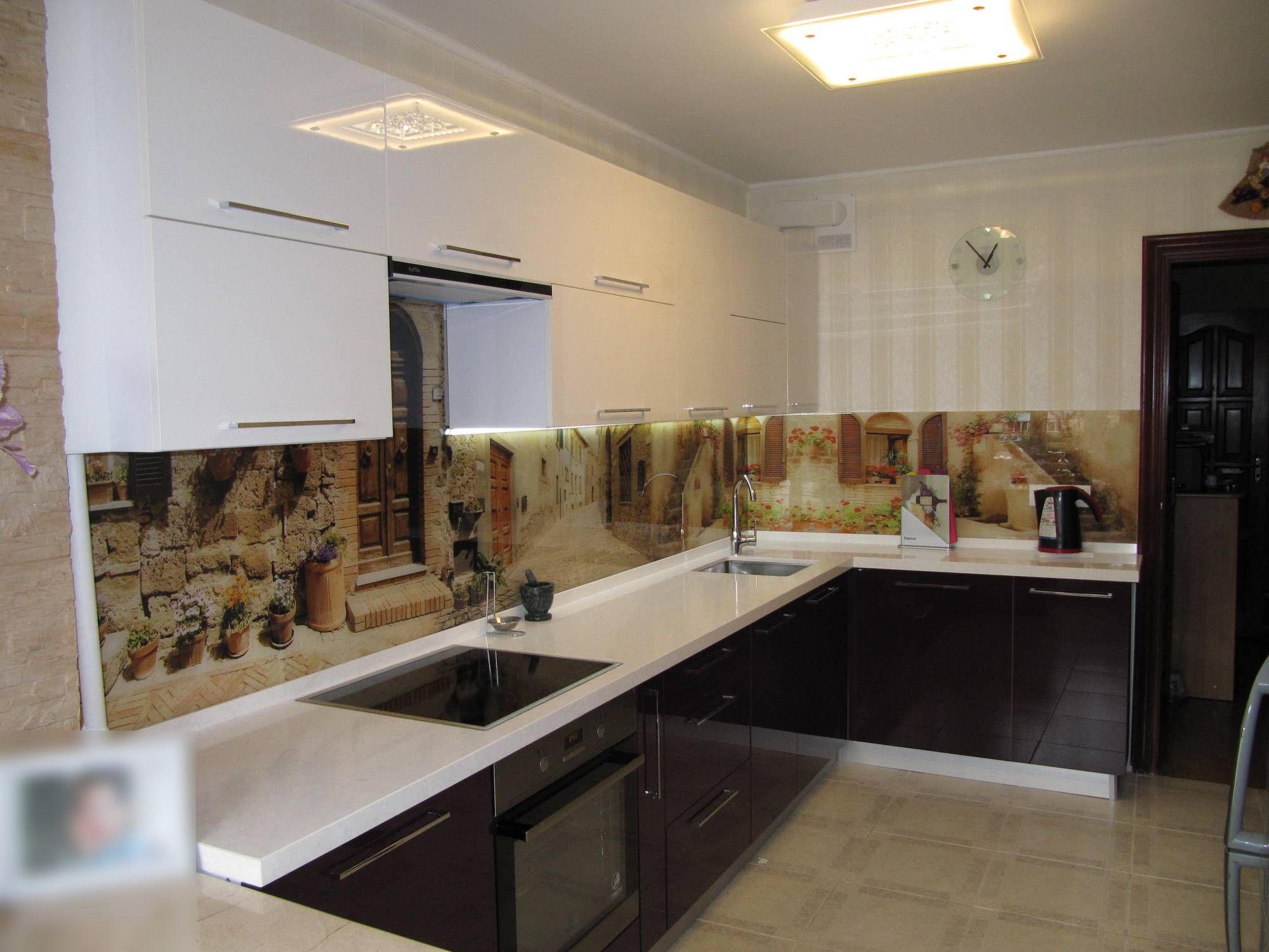 Гарнитур Алисия относится к угловому типу кухонной планировки (L или Г-формы).Такая модель предназначена для средней или небольшой кухни. Она компактная и вместительная. Множество шкафчиков, идеально подобранных по цвету – белый верх, темный низ. Фасад покрыт глянцевым акрилом – прочным и легким в уходе. Фартук (область между столешницей и навесными шкафчиками) выполнен из стекла, покрытого фотопечатью. Уютные улочки старинного итальянского городка создают романтическую обстановку. Не хочется покидать эту маленькую Италию… Остается только добавить, что длина гарнитура, цвет шкафов и фотопечать могут быть изменены по желанию заказчика.