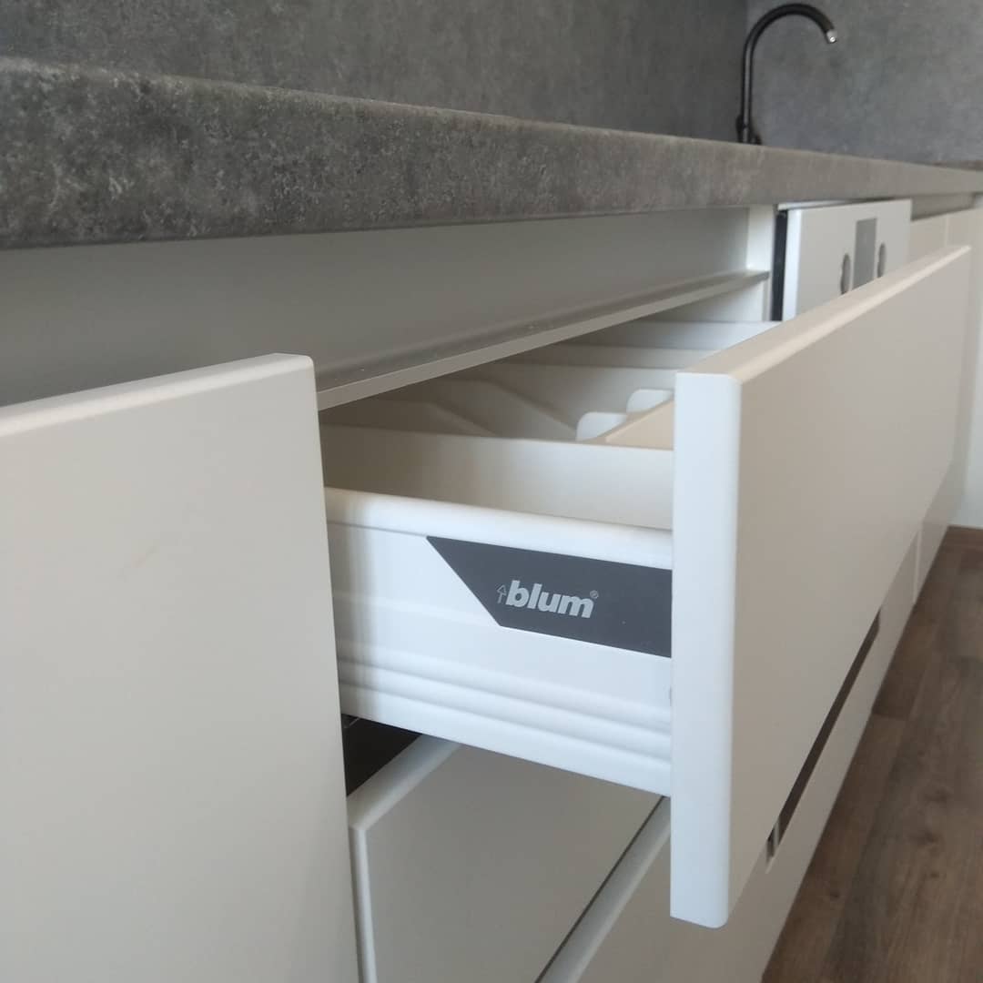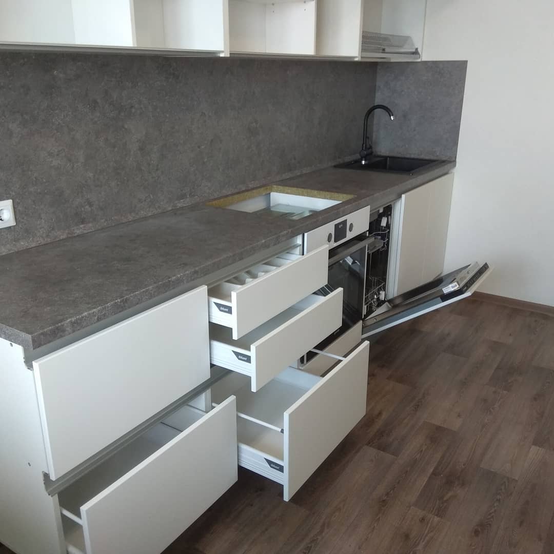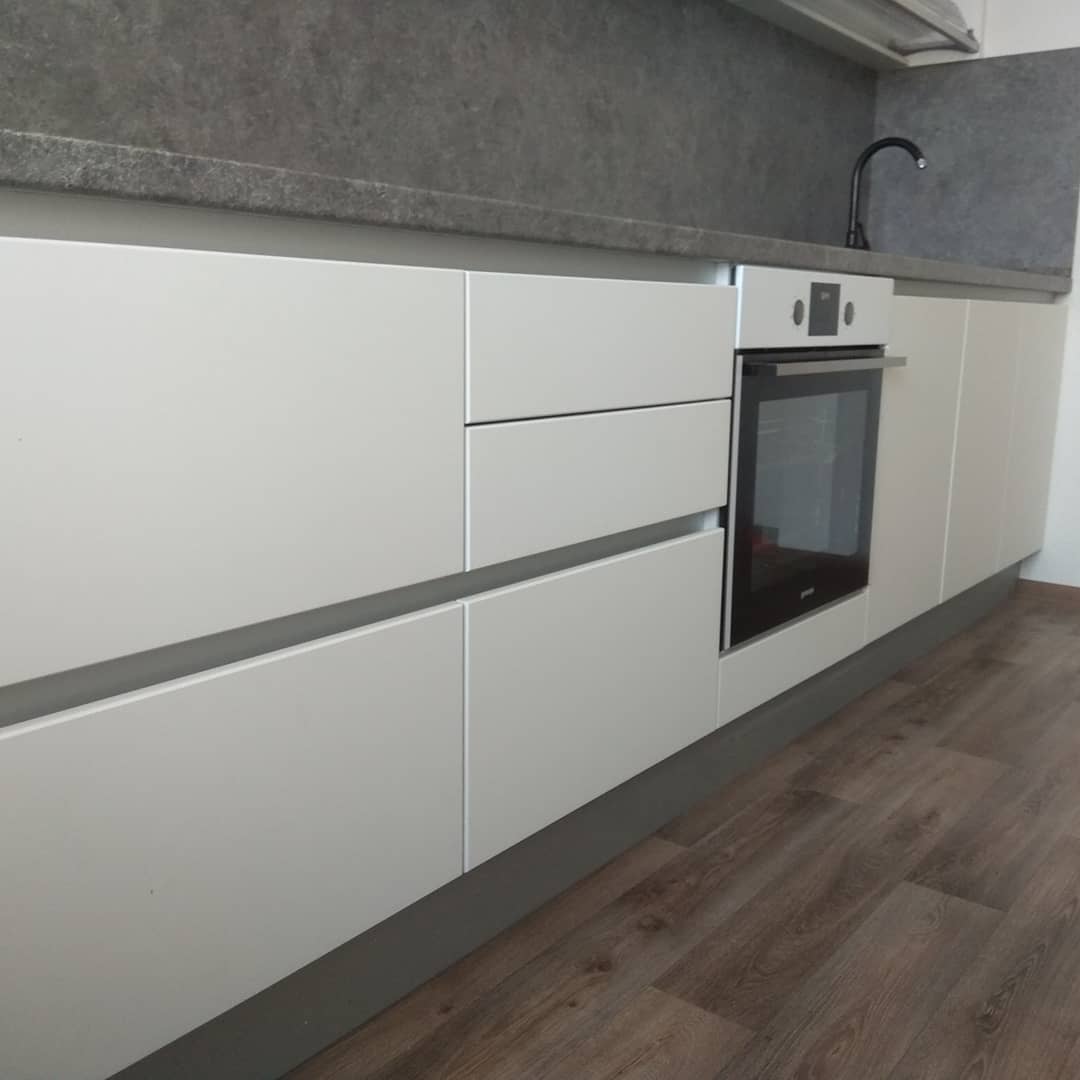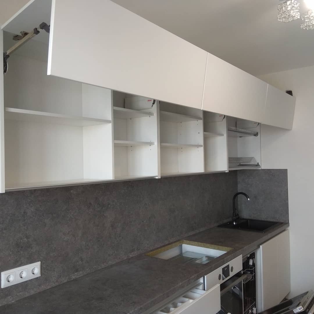 В кухне «Бадж» минималистичный стиль подчеркнут четкими линиями. Базовая универсальная модель неприхотлива в использовании, долговечна и элегантна. Фасады без ручек создают эффект единого полотна,благодаря этому кухня выглядит еще больше. Гарнитур подойдет всем без исключения. Его можно вписать в любой интерьер. Будет отлично смотреться в небольших типовых квартирах или же в просторных домах. По желанию заказчика, мебель может быть выполнена в белом или сером цветах. Верхние и нижние шкафы смогут легко вместить посуду и кухонные принадлежности. Можно добавить яркие аксессуары и кухня сразу изменит свое настроение.