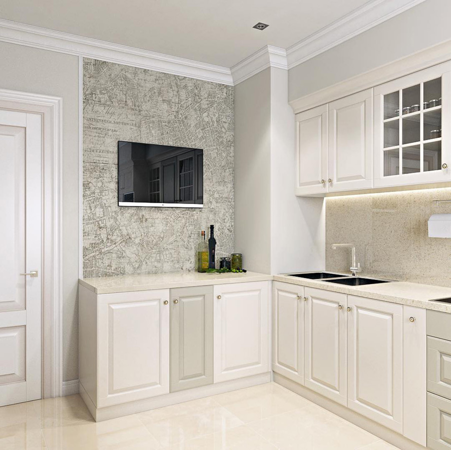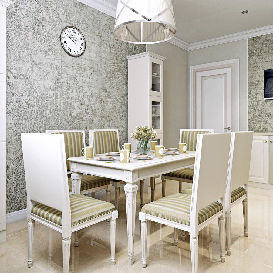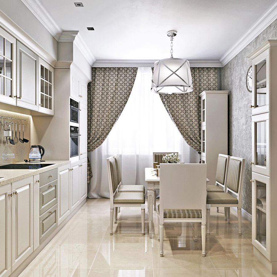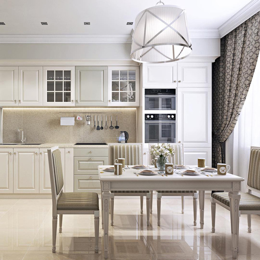 Удачными решениями выступают островной обеденный стол и отдельно стоящие узкие буфеты. Кухня хорошо вписывается как в небольшие квартиры, так и загородные дома. Заказчик может скорректировать под себя ее цвет, размеры и форму.
