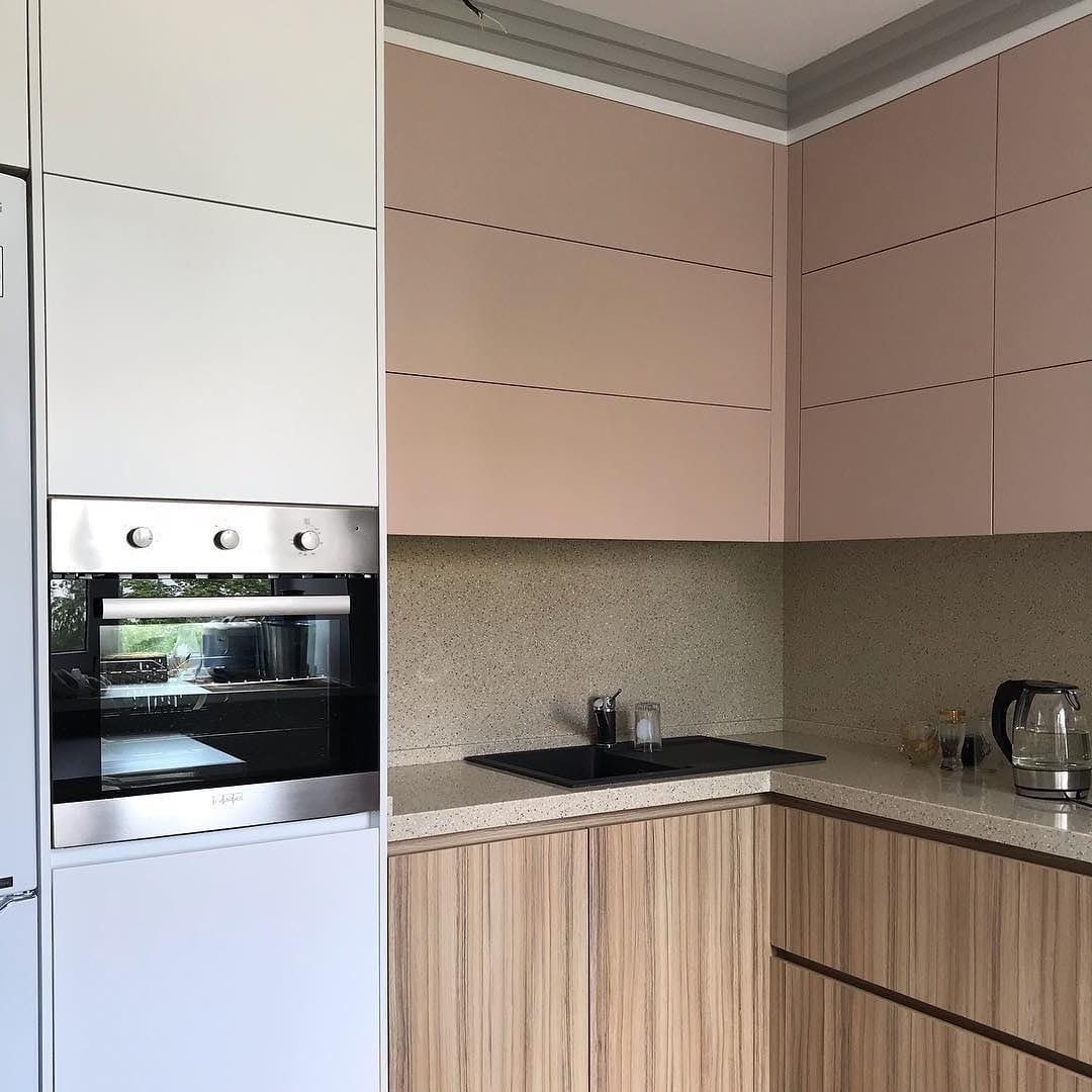 Современная мебель в стиле минимализм создает приятное ощущение того, что на вашей кухне нет ничего лишнего. Гладкие фасады из практичного пластика в спокойной цветовой гамме бежевых оттенков долговечны и просты в уходе. Каменная столешница и фартук в том же тоне гармонично завершают общий образ.