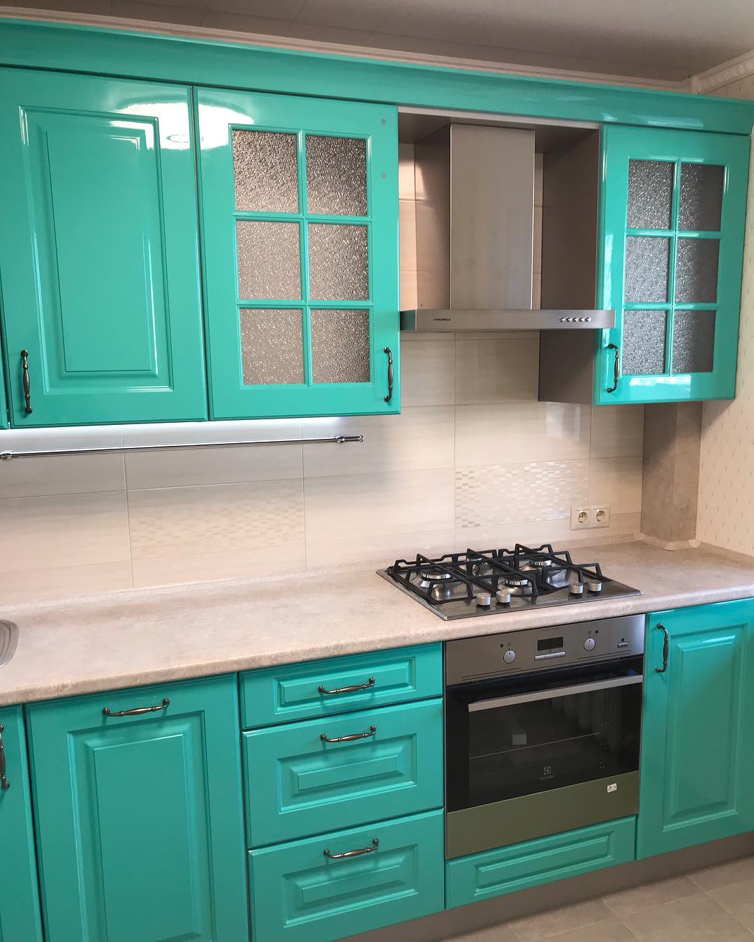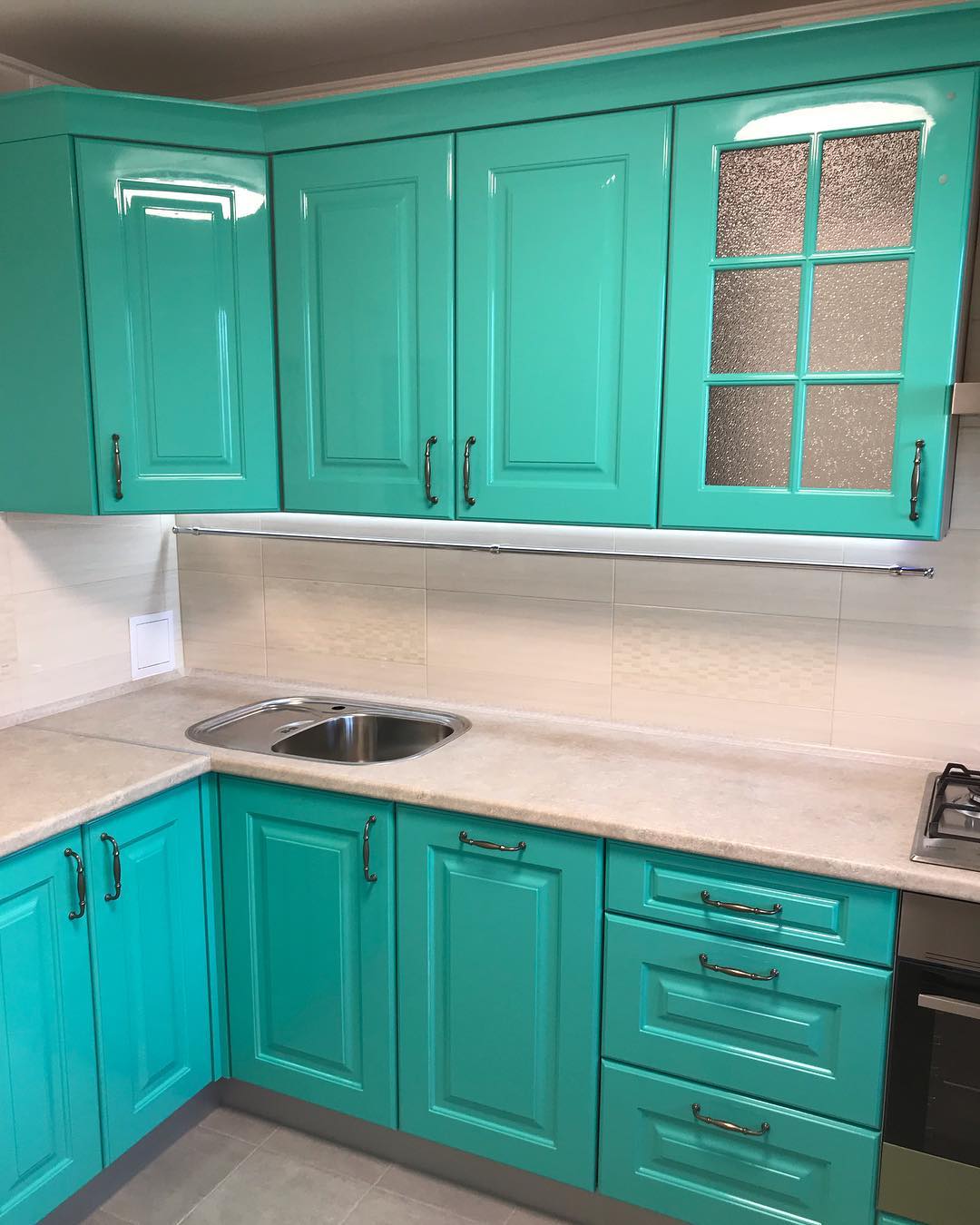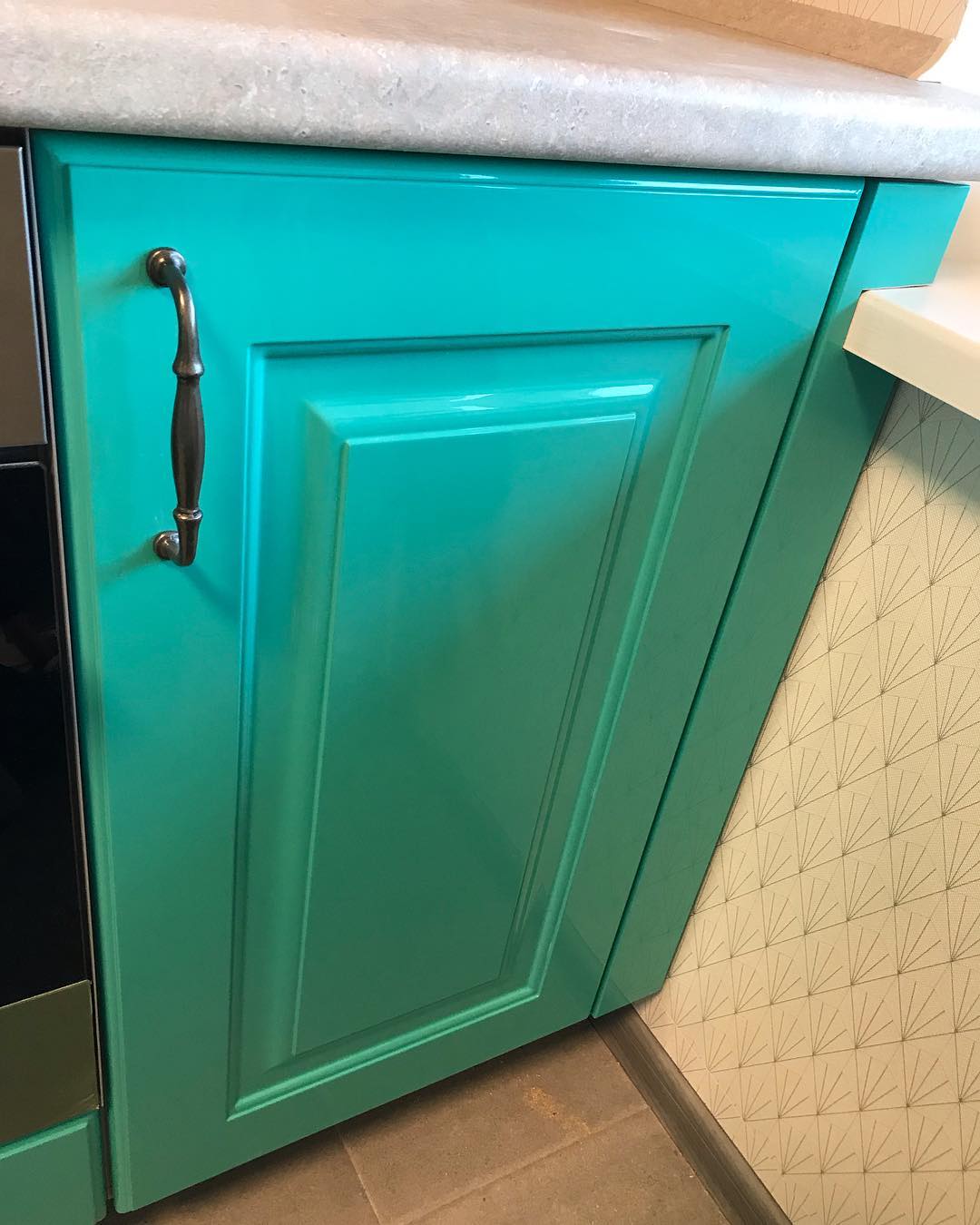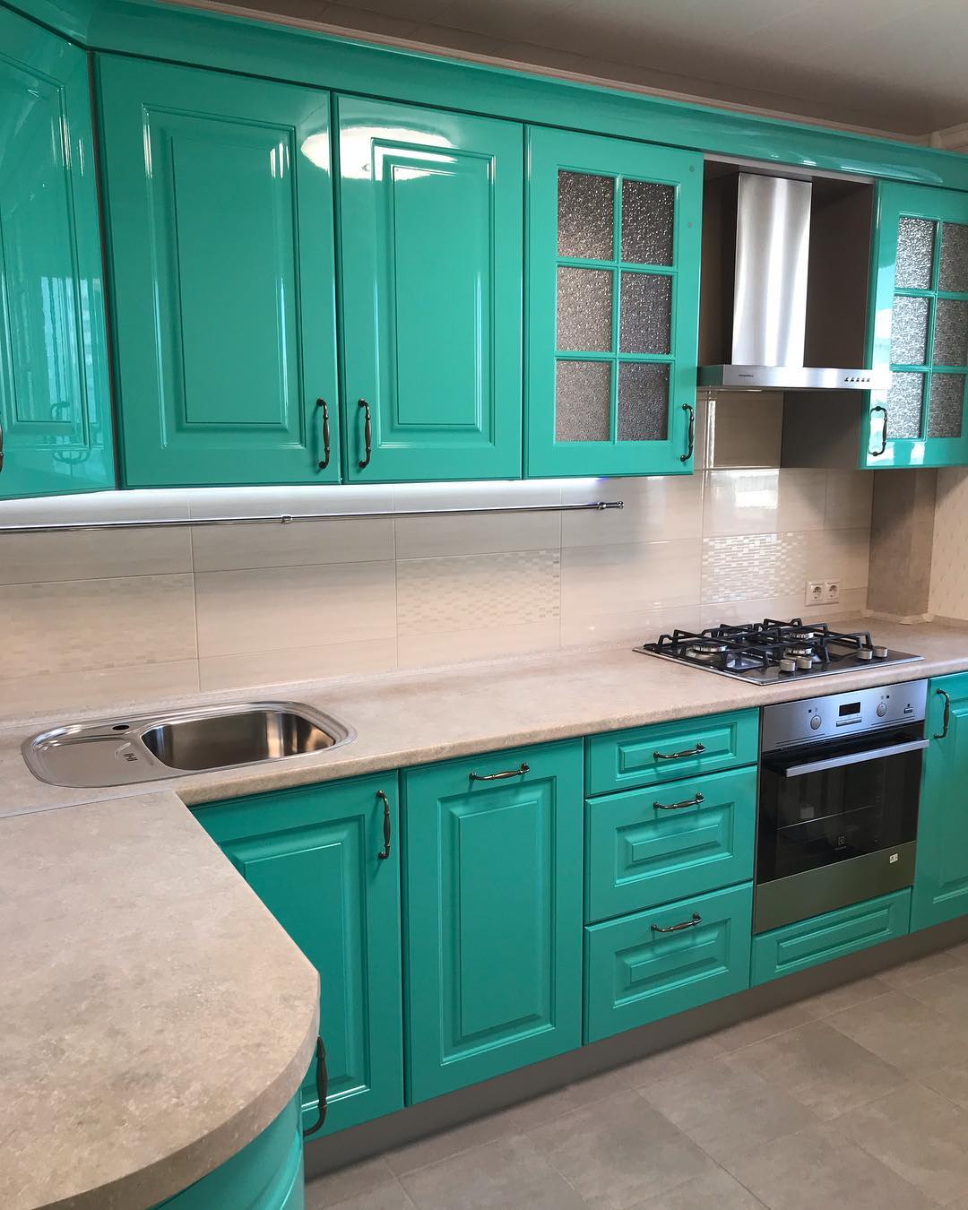 Мебель выполнена в актуальном, свойственном современному стилю цветовом сочетании светлой столешницы и фасадов мятного цвета с глянцевым блеском, что привнесёт в интерьер нотку прохлады и элегантности.