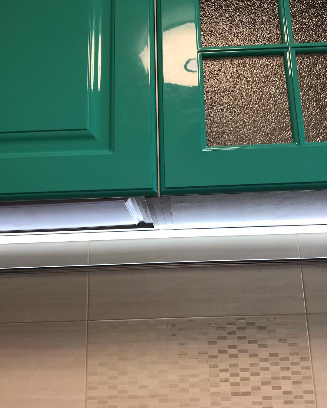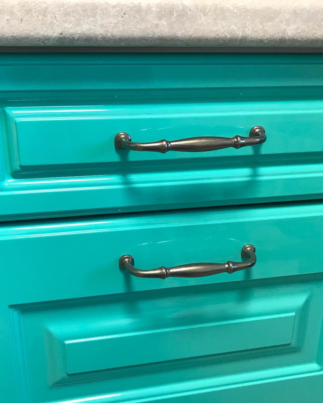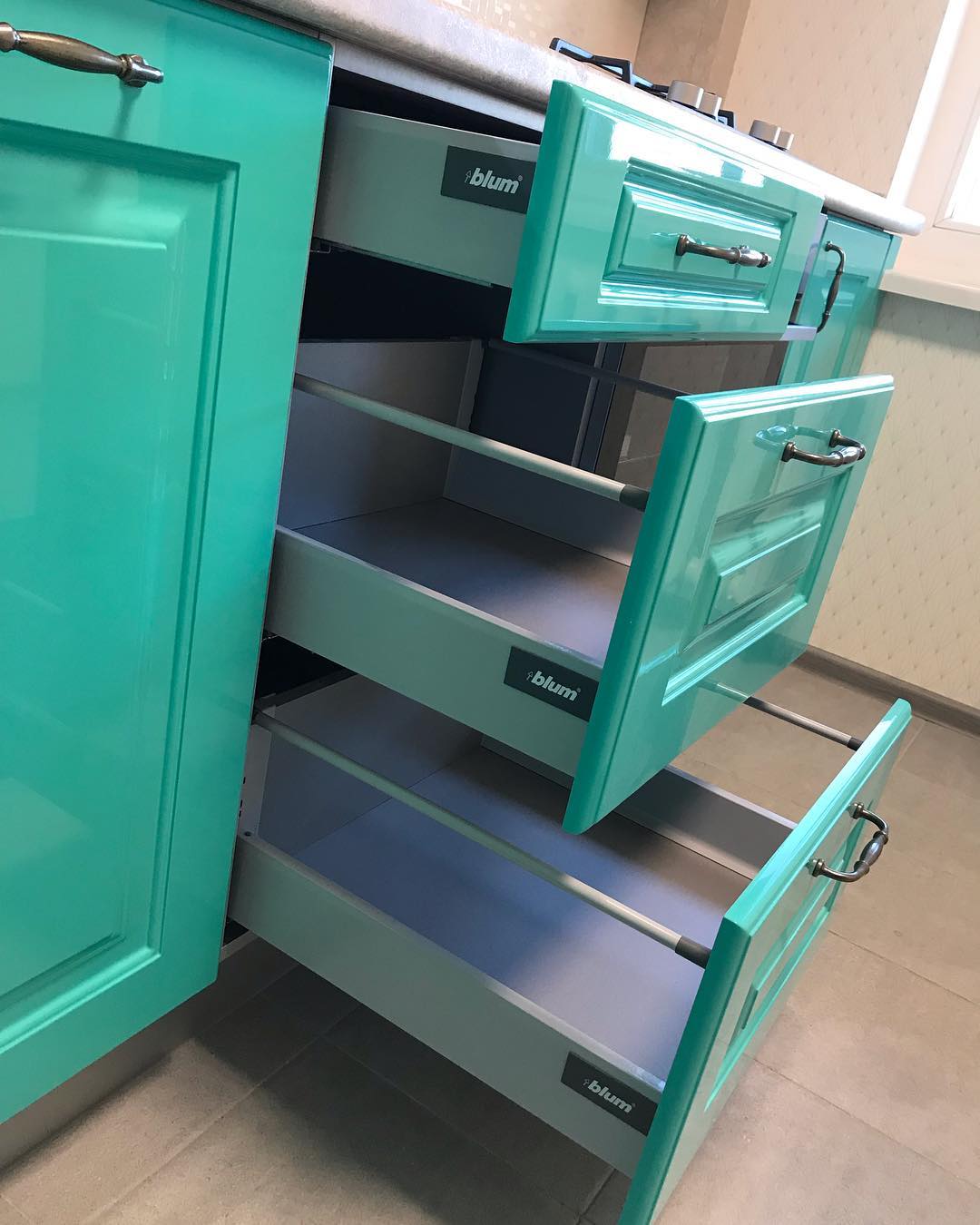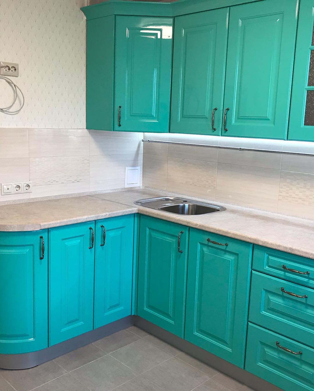 Мебель выполнена в актуальном, свойственном современному стилю цветовом сочетании светлой столешницы и фасадов мятного цвета с глянцевым блеском, что привнесёт в интерьер нотку прохлады и элегантности.