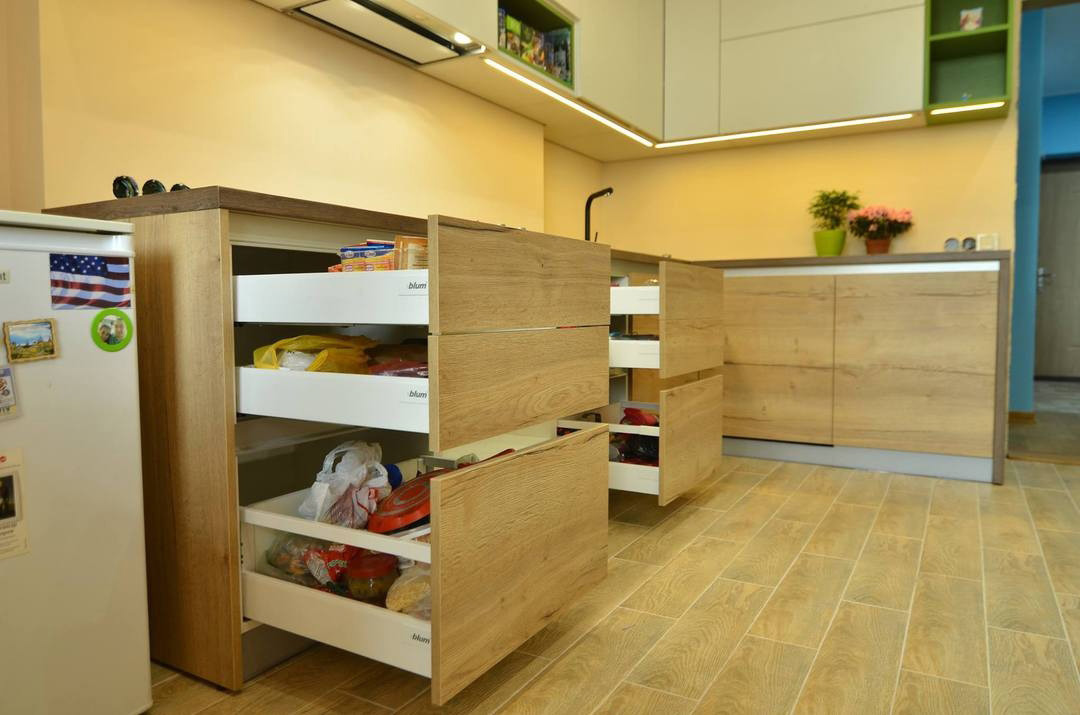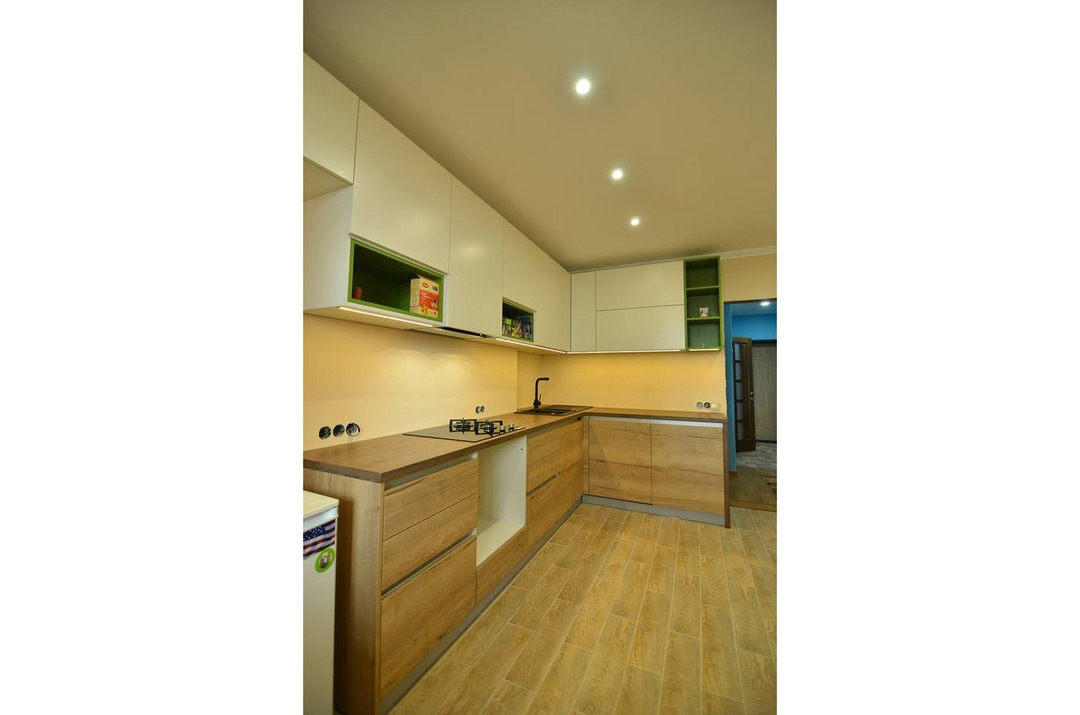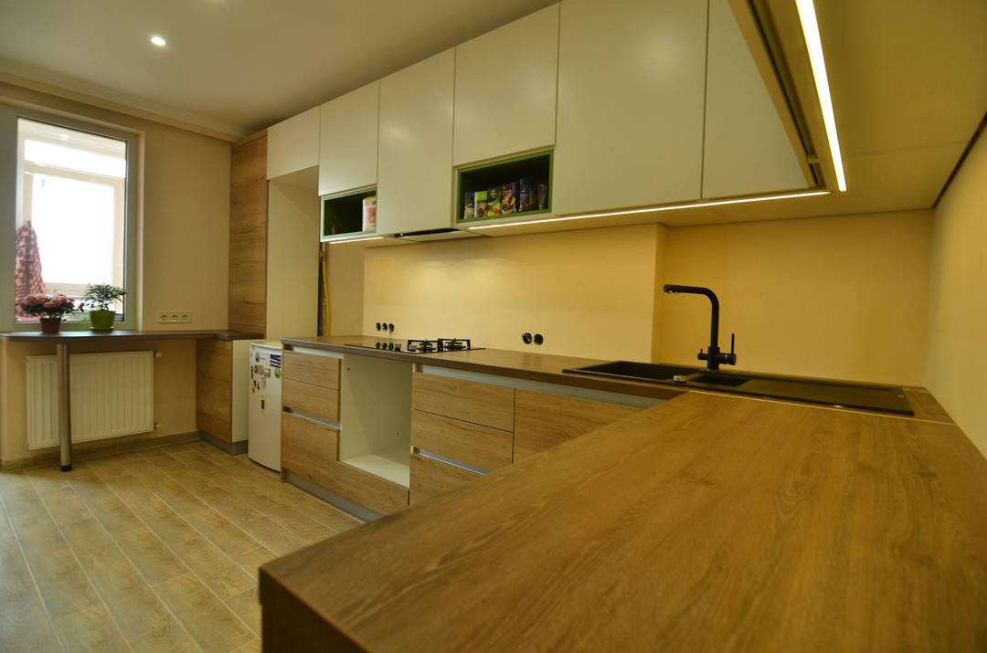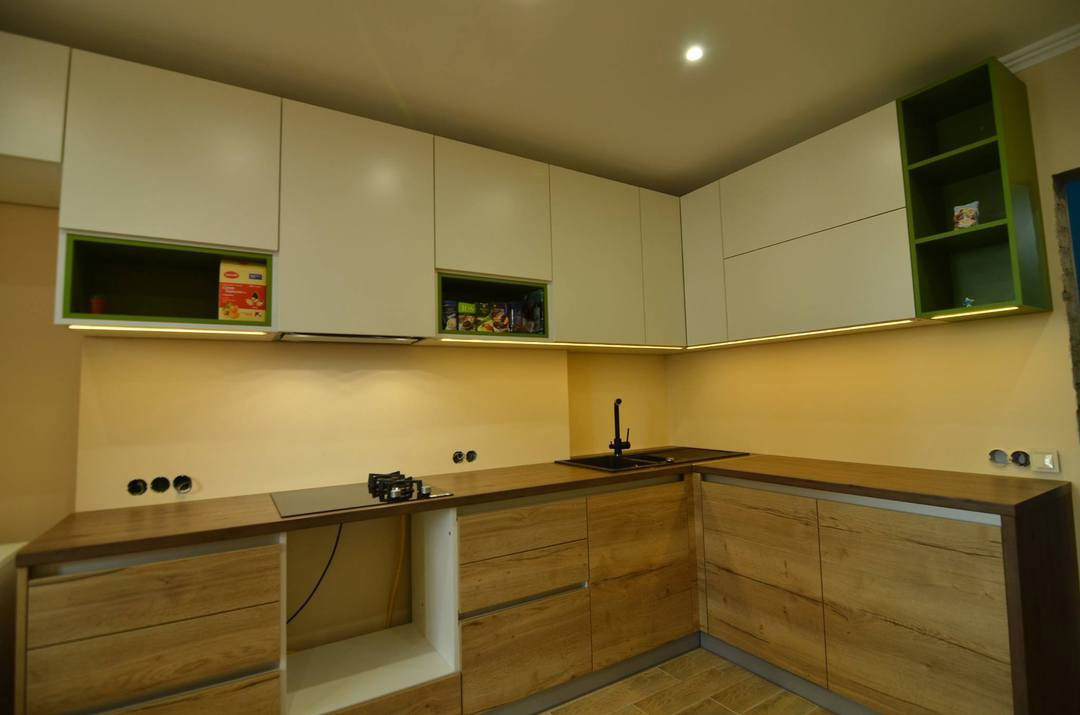 Кухня «Куфея» из ДСП, выдержанная в приятных бежевых и золотистых тонах, гармонично вписывается в интерьер загородного дома или квартиры. Комплект состоит из верхних подвесных шкафчиков с полочками, нижних напольных шкафов и пространства под духовку. Кухня отличаются компактными размерами. Отличительная особенность кухни состоит в том, что у шкафов нет ручек, дверцы открываются и закрываются по типу купе. Столешница из древесины в этом комплекте очень прочная и практичная. Купить кухню «Куфея» можно в полной или частичной комплектации, доставка и установка производится по всей России.