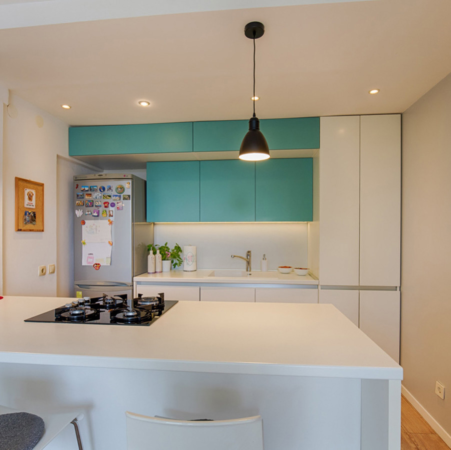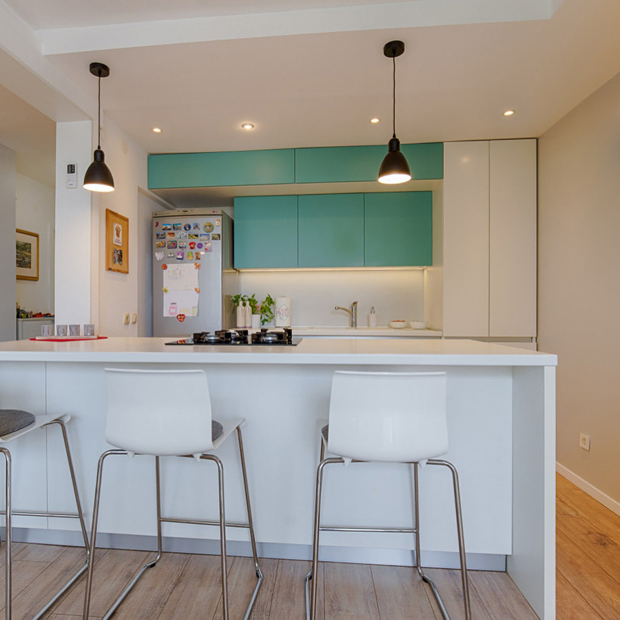 Дизайн кухни выполнен в калссическом белом цвете, с граммотно расставлеными акцентами на элементах свежего мятного цвета.