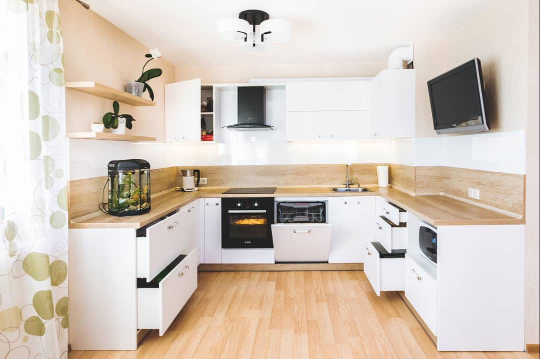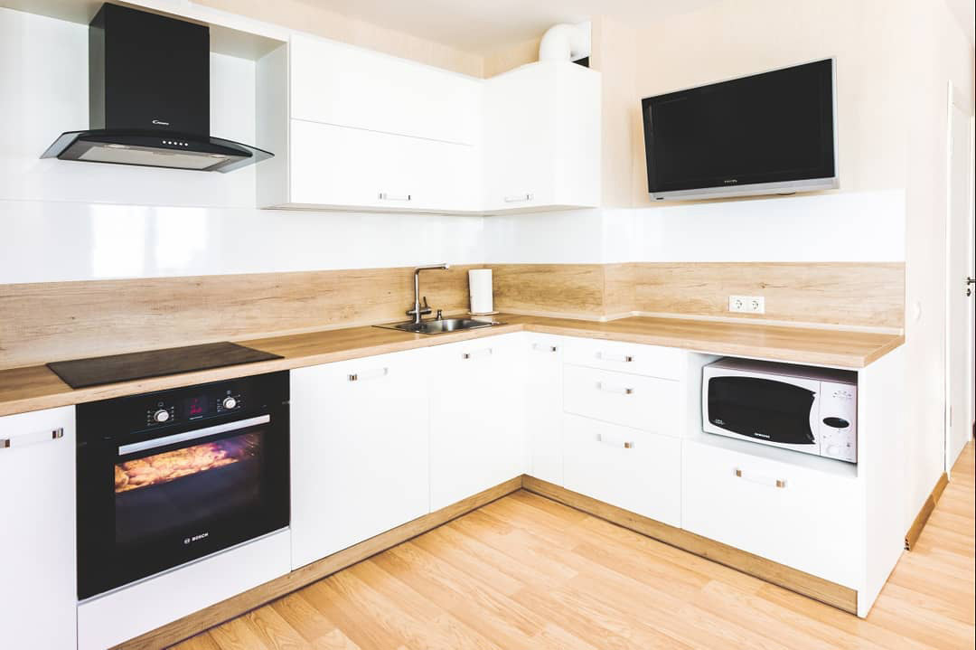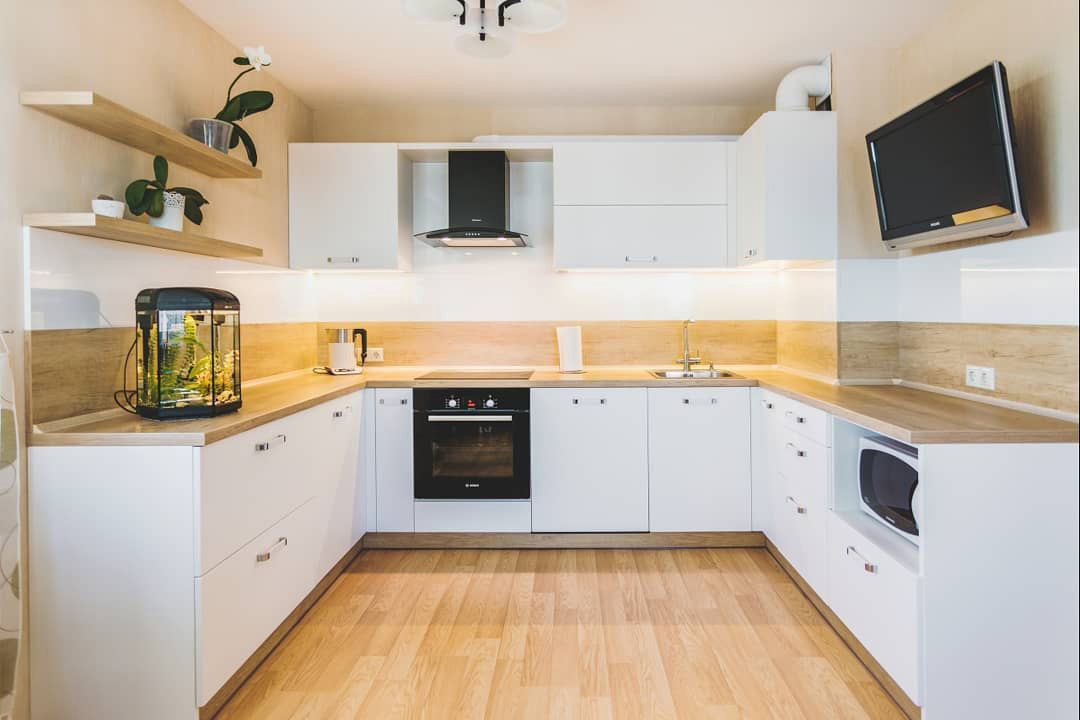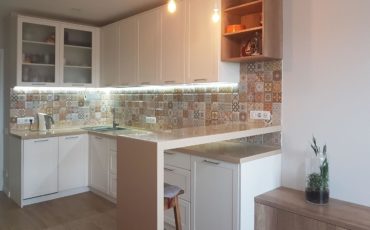 Благодаря тому, что основной цвет разбавлен ореховым — интерьер не будет выглядеть холодно и неуютно, а скорее наоборот, встретит хозяина по домашнему тепло, даже в самый пасмурный или морозный день. Кухня отлично подойдёт как для любителей классики, так и для тех, кому по душе всё новое и современное. Светлые оттенки визуально увеличивают пространство, поэтому владельцам небольших помещений рекомендуется остановить выбор именно на этой модели.